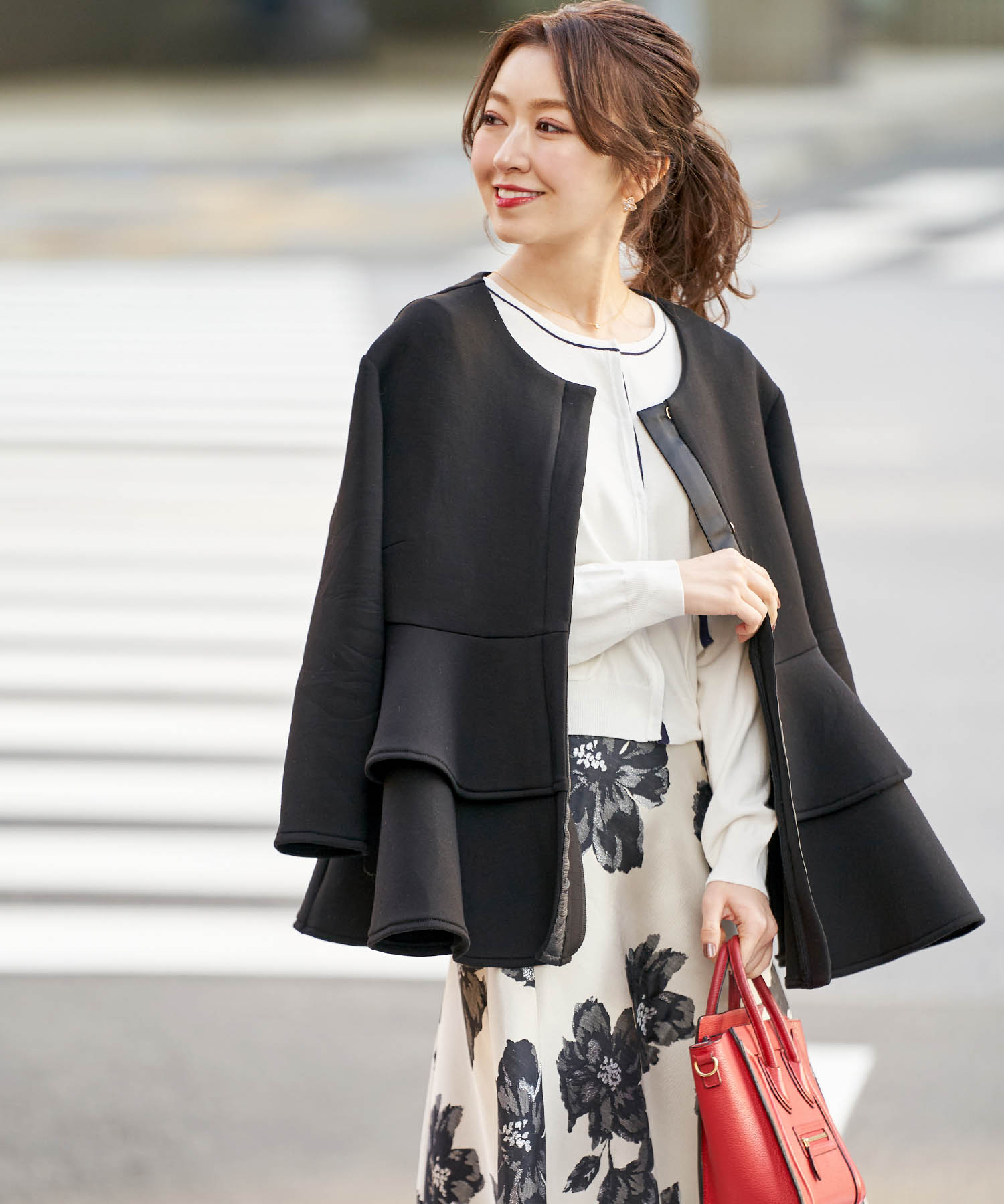 春といえどまだまだ寒いこの時期、防寒対策に薄手で軽いアウターを持って出かけると安心です。色は汚れが目立ちにくいブラックがおすすめ。ダークカラーながら、ウエストのギャザーとフリルで華やかさをプラス。
