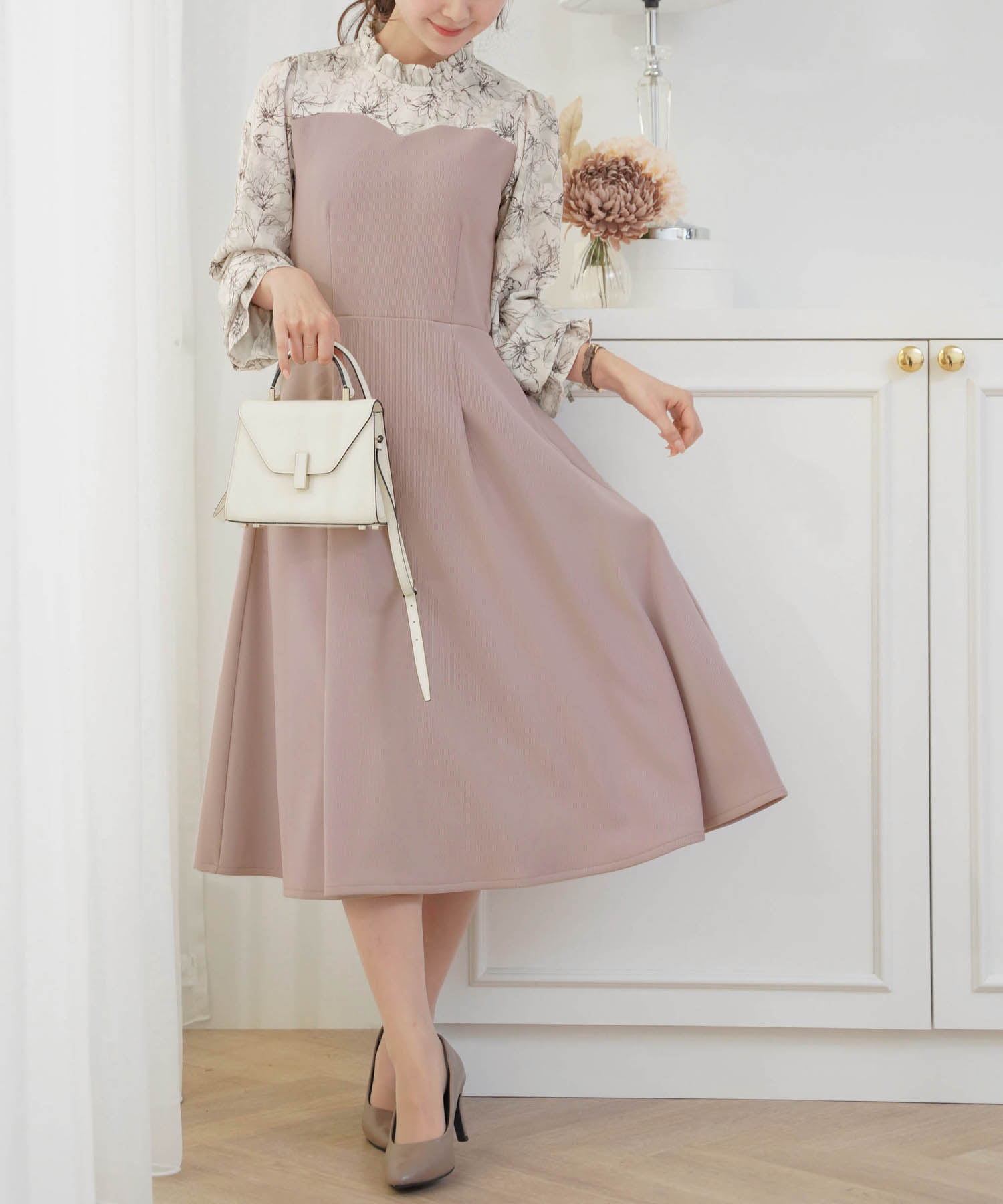 お花見といえばの花柄コーデも候補に! 柄は線画調なので大人っぽく見えるところも嬉しいポイント。身頃はピンクベージュで肌の色から浮いて見えず、派手過ぎずないけど、乙女心がくすぐられるデザインで気分の上がるワンピースです。