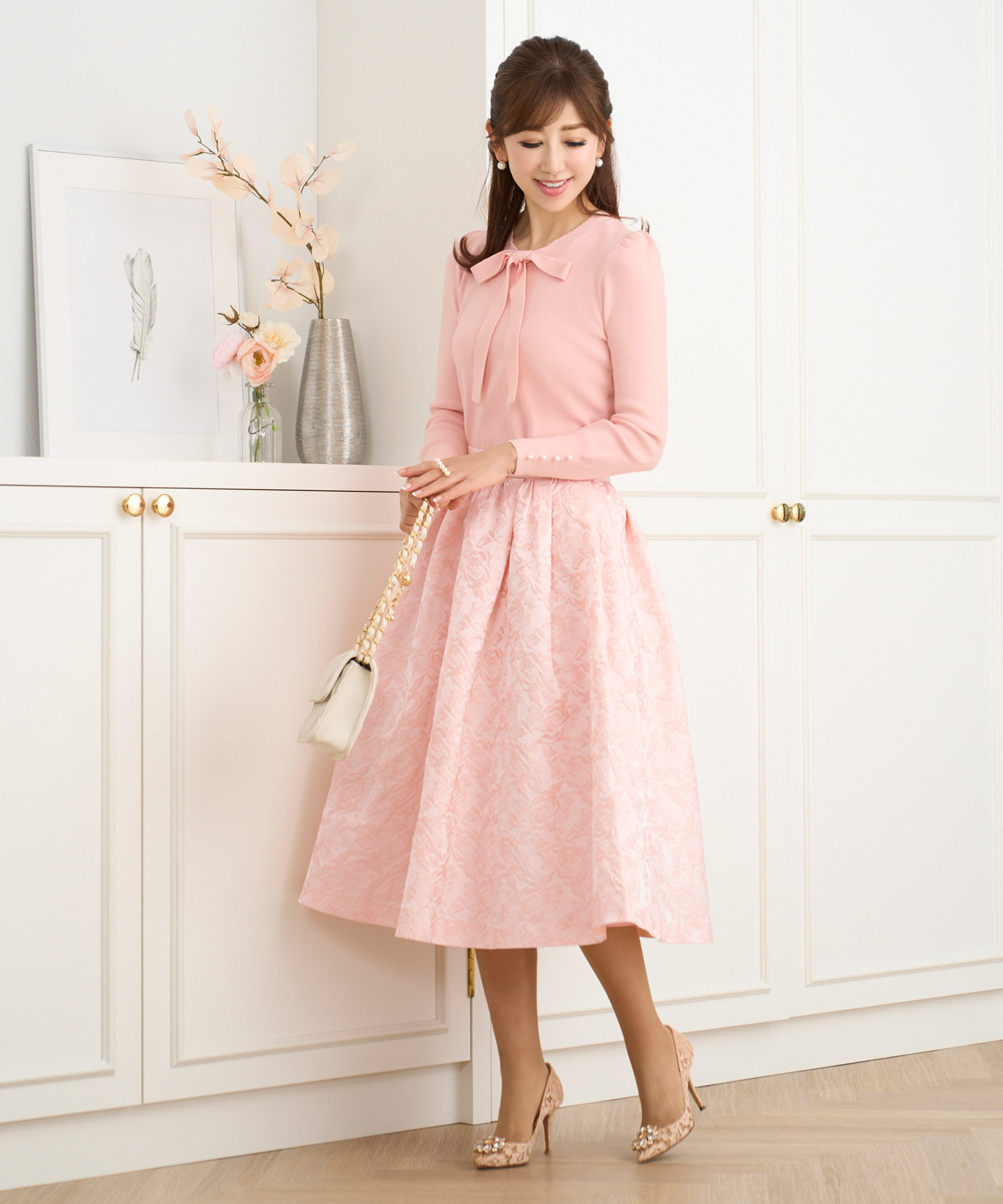 お花見といえばやっぱりピンク! 桜とリンクする「ピンク」のワントーンコーデで、家を出るときから気分を盛り上げましょう♡ ともすれば幼い雰囲気に見えるピンクコーデもクラシカルなリボンタイを投入することで、エレガントで大人可愛い印象に♪
