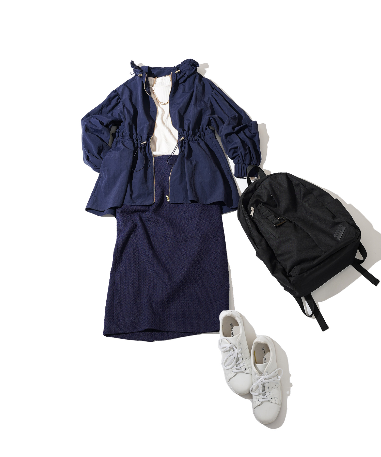 お花見コーデといえばヒールはNG。アクティブなスニーカースタイルが欠かせません。オールホワイトでレザータッチの素材ならリッチ見えするので大人にも最適です。ツイード素材のスカートとミックスさせて、甘さと上品さを程よく取り入れた大人カジュアルコーデの完成♪