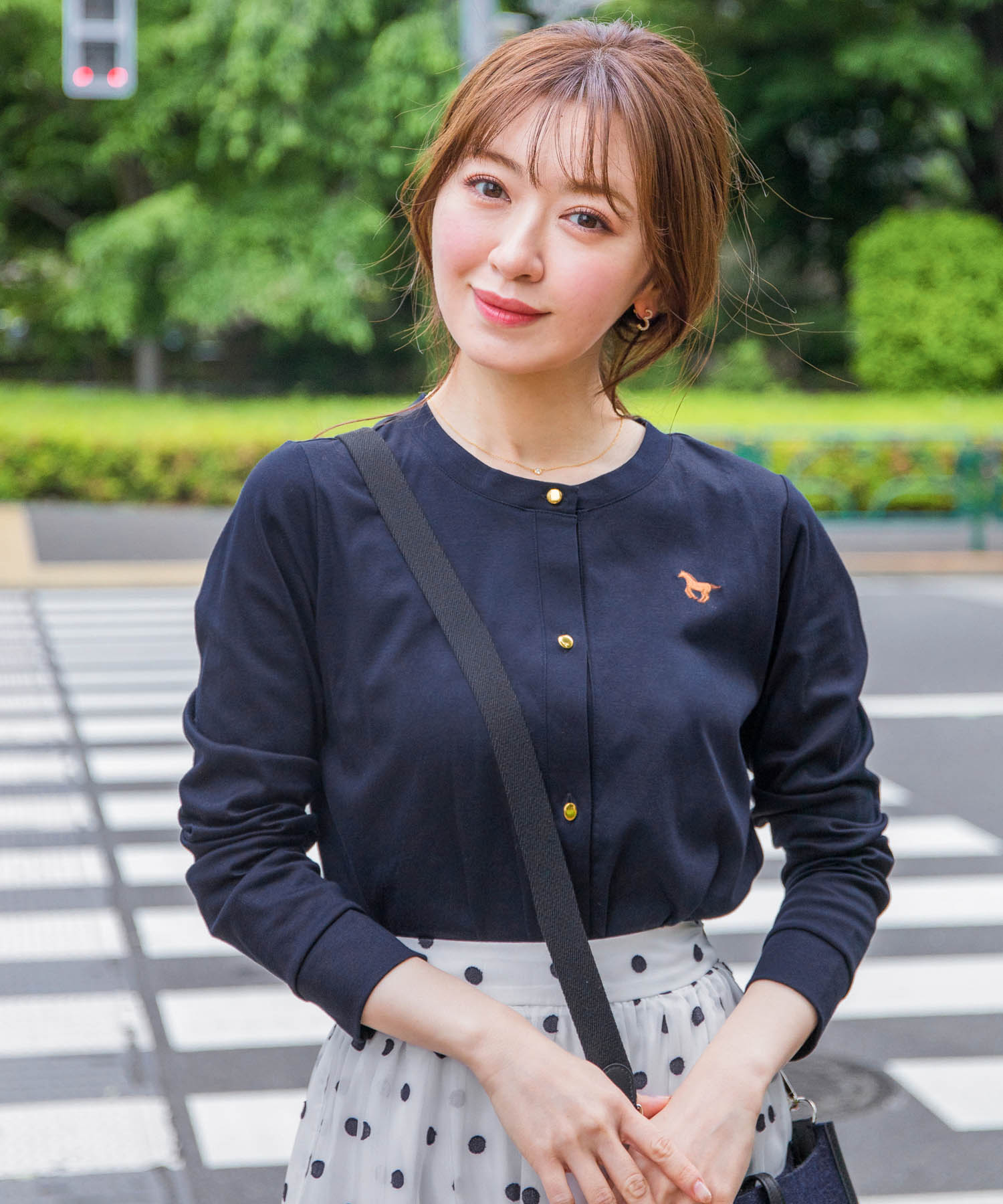カットソー素材でソフトな肌ざわりのカーディガンなら毎日でも着たくなる! さらにUVカットや接触冷感機能も付いているので何かと頼れて、外出のお供に欠かせません。胸元のホース刺繍が真夏のシンプルスタイルに利く♪