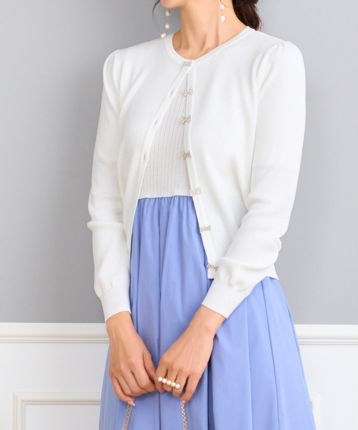 ガーデンパーティやフェスなど、賑やかな場所に最適なビジュー付きカーディガン。身頃と同色のビジューなら派手過ぎず、程よく存在感があります。日差し対策だけでなくデザインも重視するならこの一枚がおすすめです。