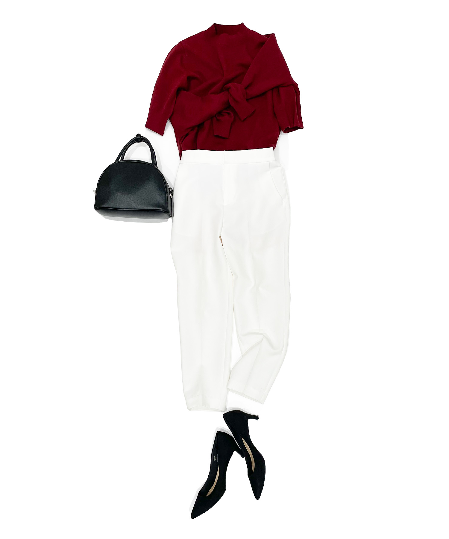 カーディガンを肩掛けにして着こなす方法はいくつかバリエーションがあるため、ぜひコーディネートに取り入れてみてください。まずは、カーディガンの袖を肩から掛けて胸あたりで結ぶスタイリングの方法をご紹介します。