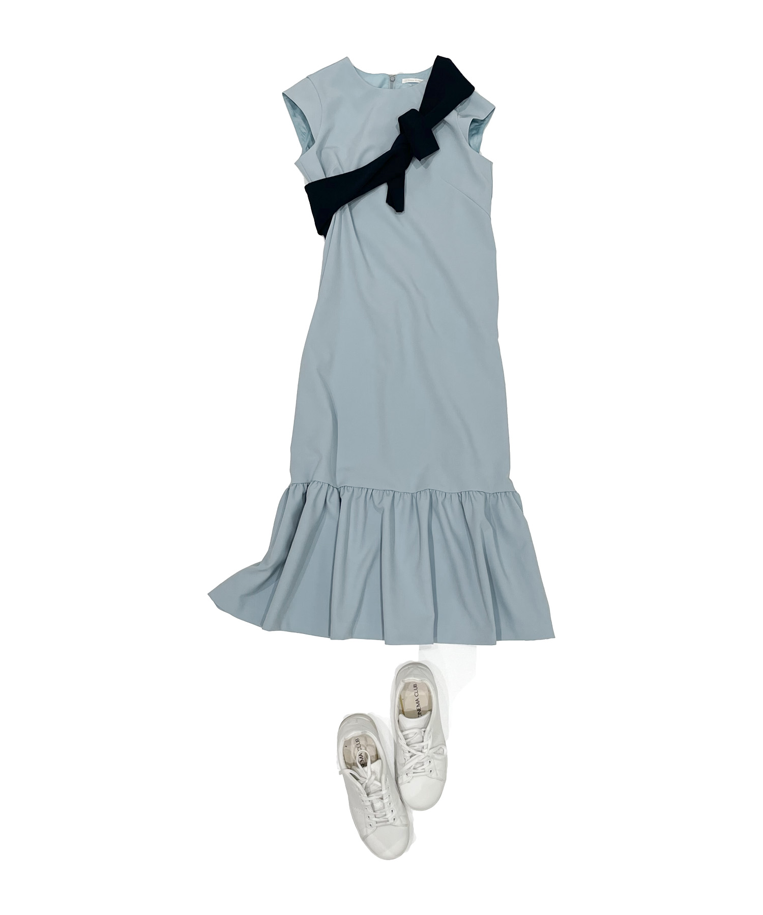 ●くすみブルーのフレンチスリーブワンピースに黒のたすき掛けカーディガンでメリハリ感をプラス
