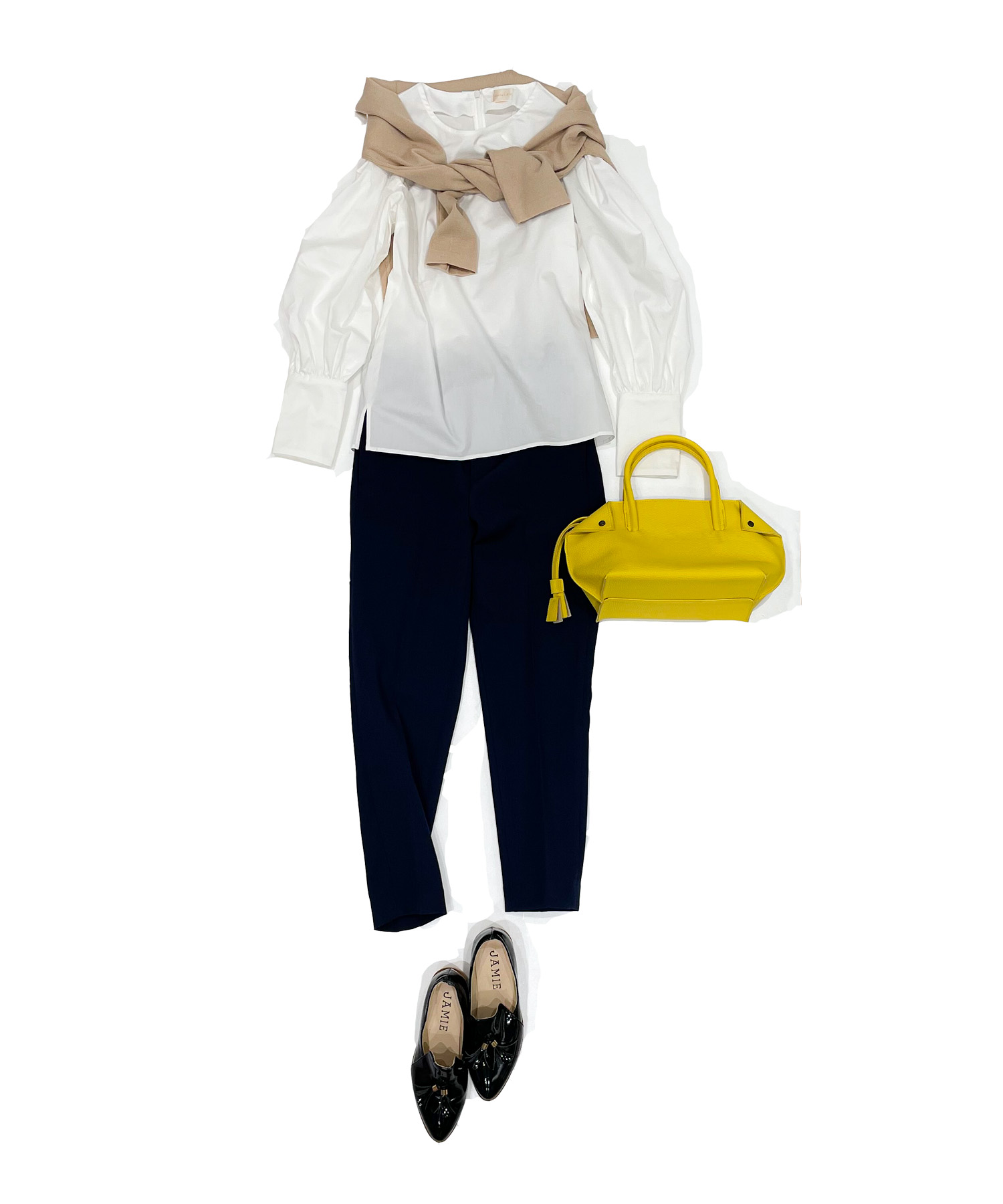 ・きれいめシルエットのブラウスに肩掛けカーディガンとバッグをコーデのアクセントに