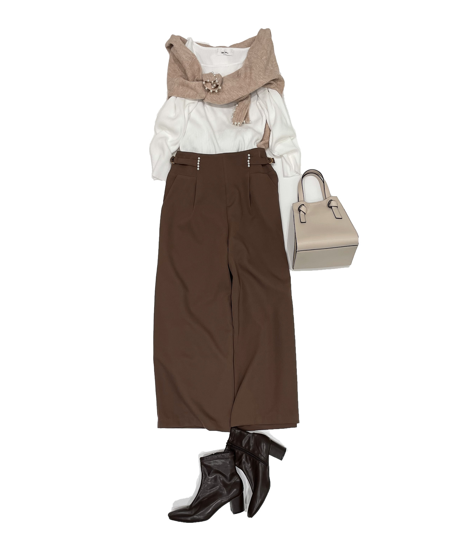 ●大人カジュアルなブラウンのワイドパンツコーデに肩掛けのカーディガンでバランスよく