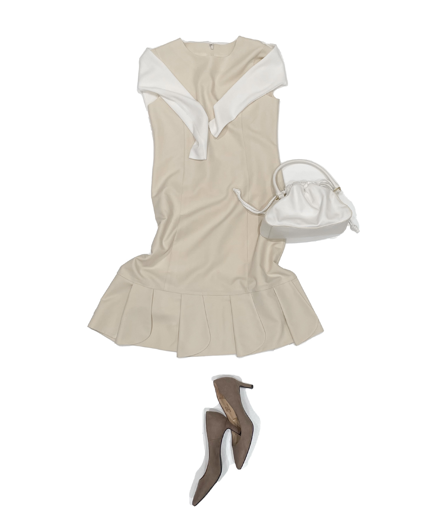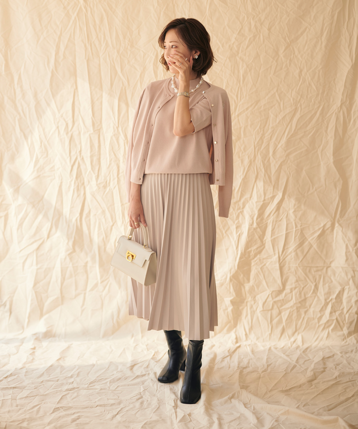 ・きれいめプリーツスカート×肩掛けカーデで上品なワントーンコーデ
