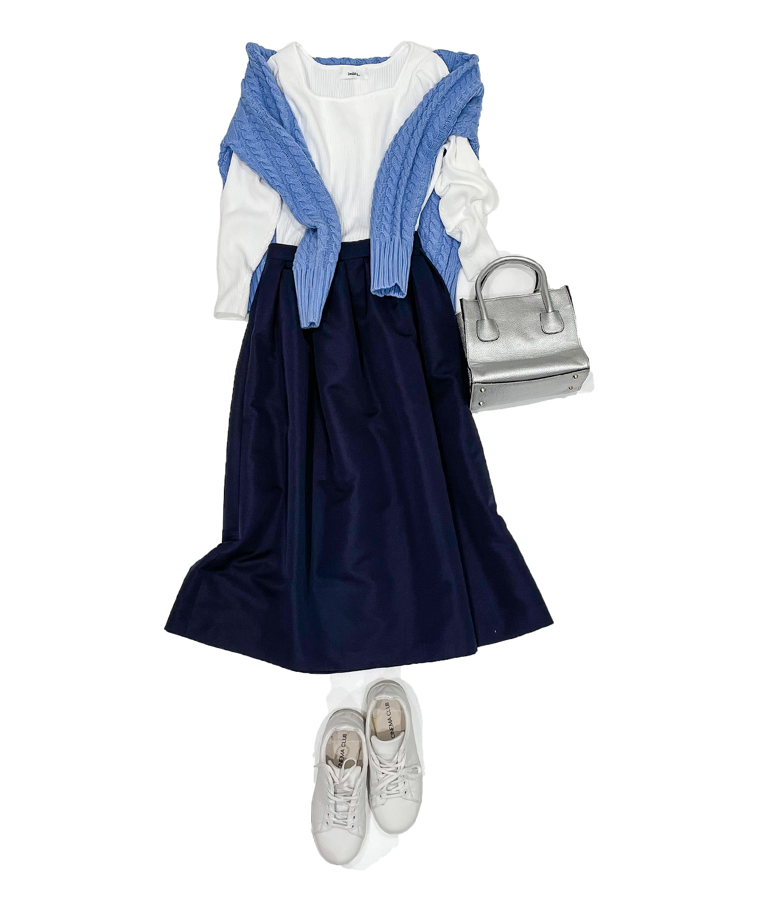 ●鮮やかなブルーのケーブルニットに相性のいいネイビーのスカートを合わせた大人のカジュアルコーデ
