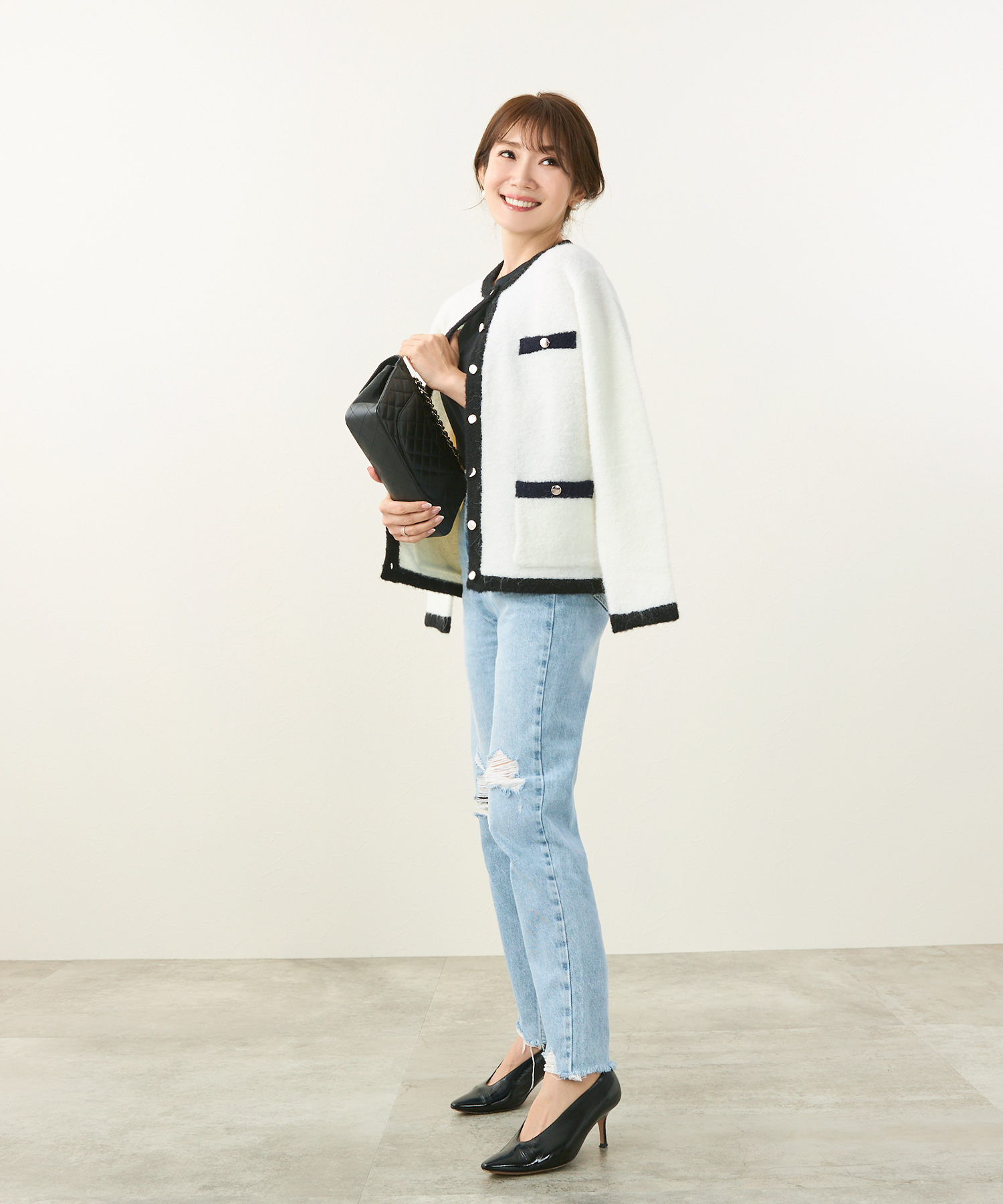 ●アンサンブルのニットカーディガンをたすき掛けにしてよりスタイリッシュな着こなしに