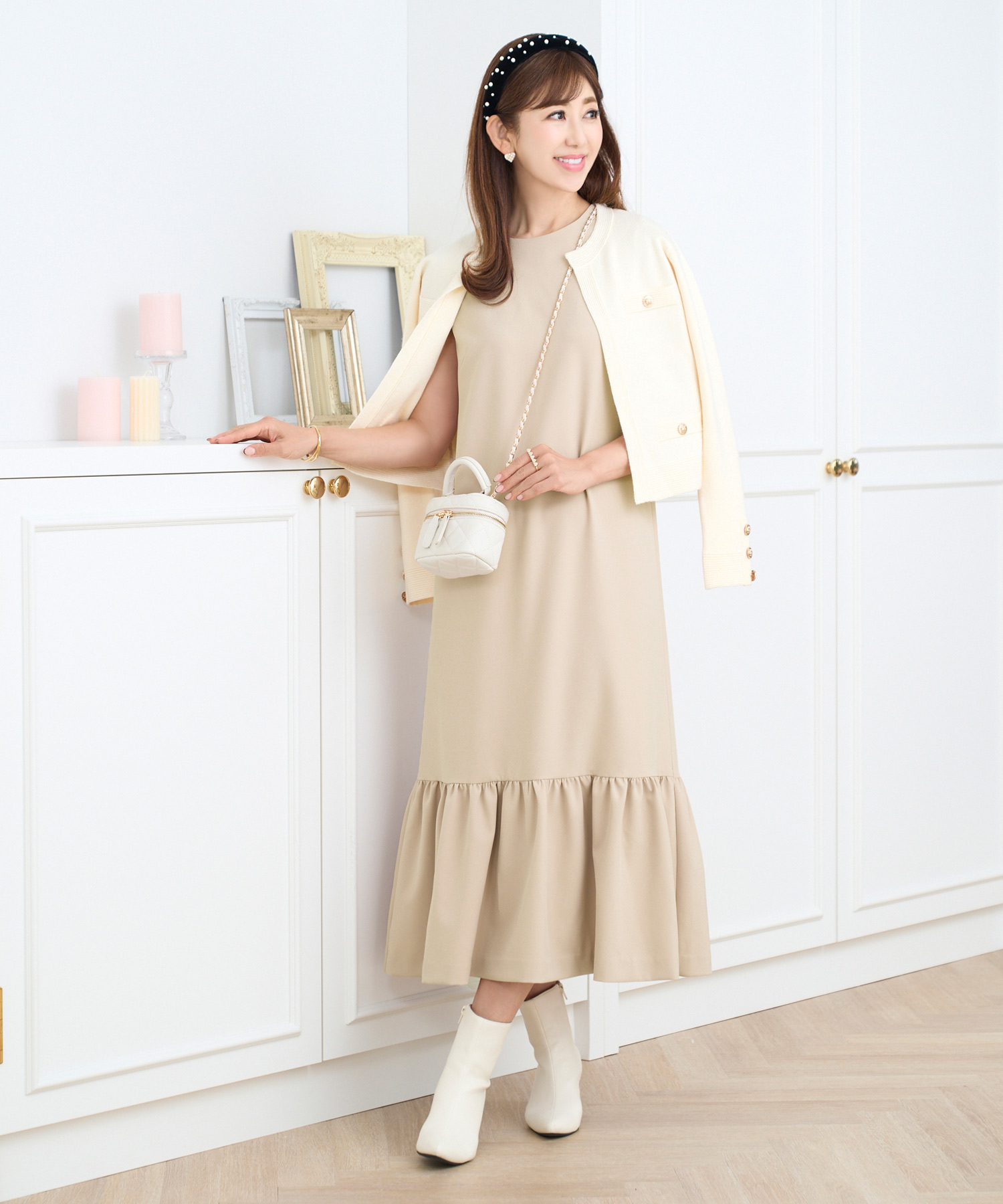 ●ベージュのノースリーブワンピにさりげなく肩掛けカーデをプラス