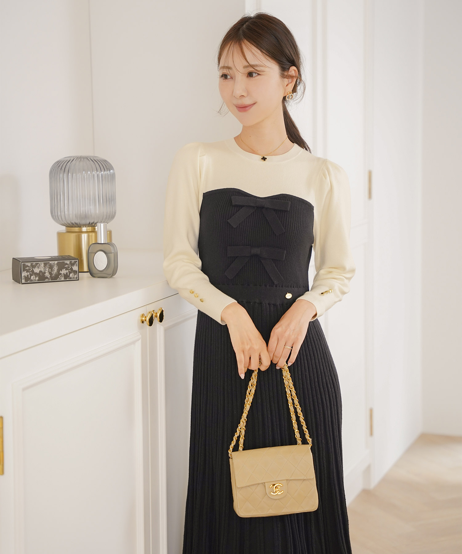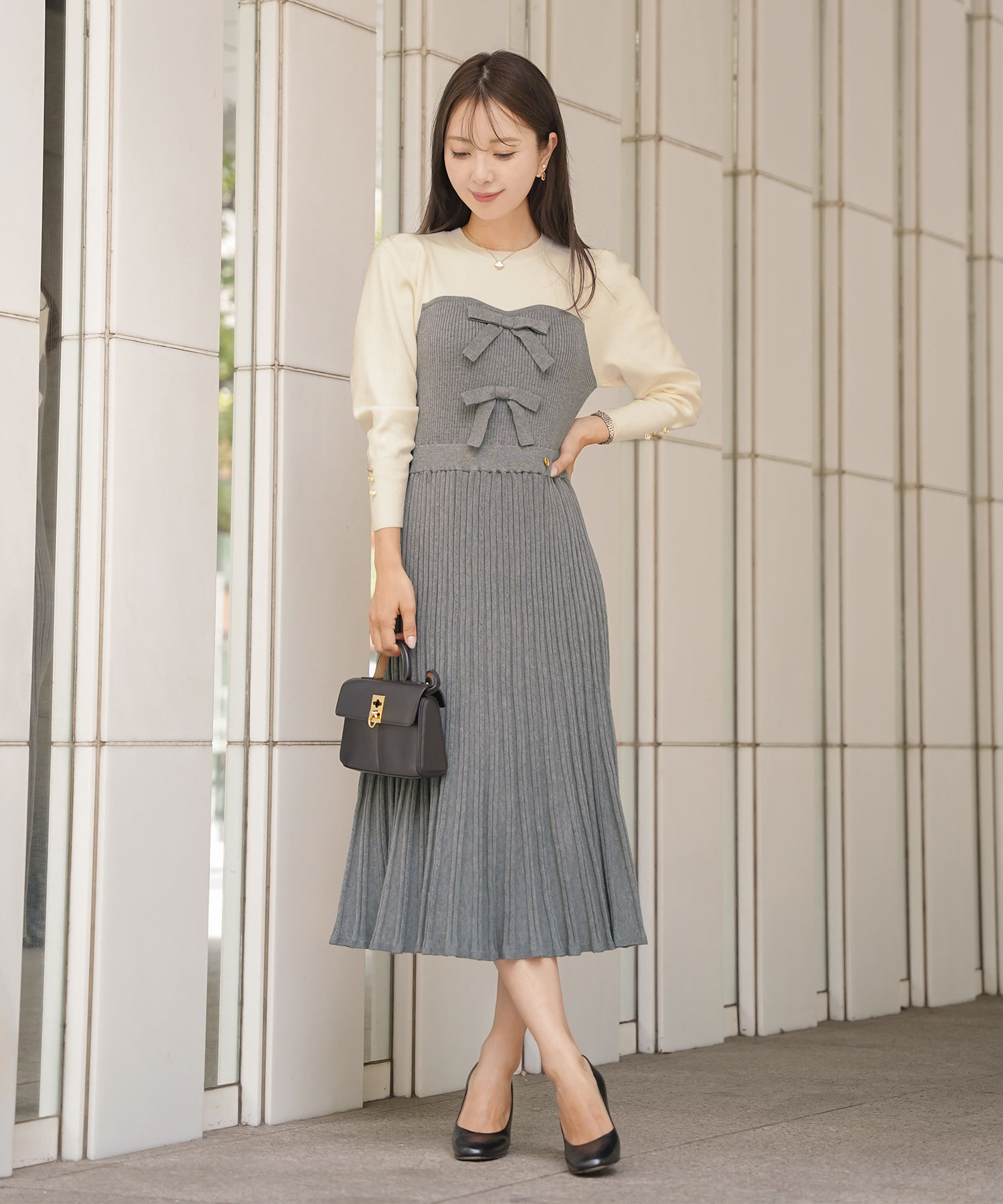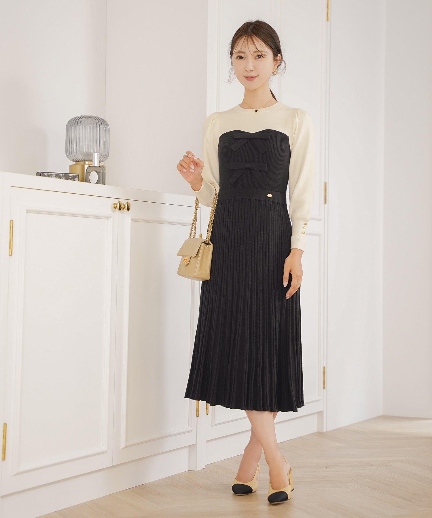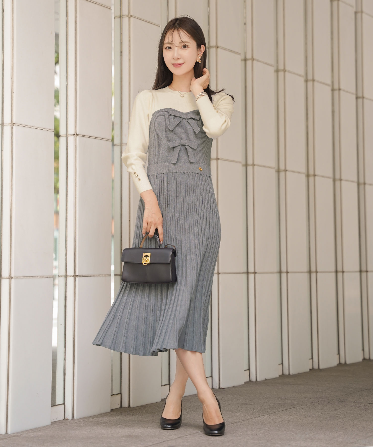 トレンド感ときちんと感をほどよく両立した、ビストロでの食事会にぴったりのリボンニットワンピース。ベア切替風のバイカラー配色と、バスト〜ウエストにかけてのリブ編みが、着るだけでメリハリのある美シルエットを演出します。胸元のリボンディテールとゴールドボタンが、クラシカルなムードを添えつつ顔まわりを華やかに見せてくれるポイントに。もちっとした弾力のあるニットと、縦ライン×ドット柄をミックスしたフレアスカートで、長時間のディナーでも楽な着心地とすらりとした印象を叶えてくれる一着です。