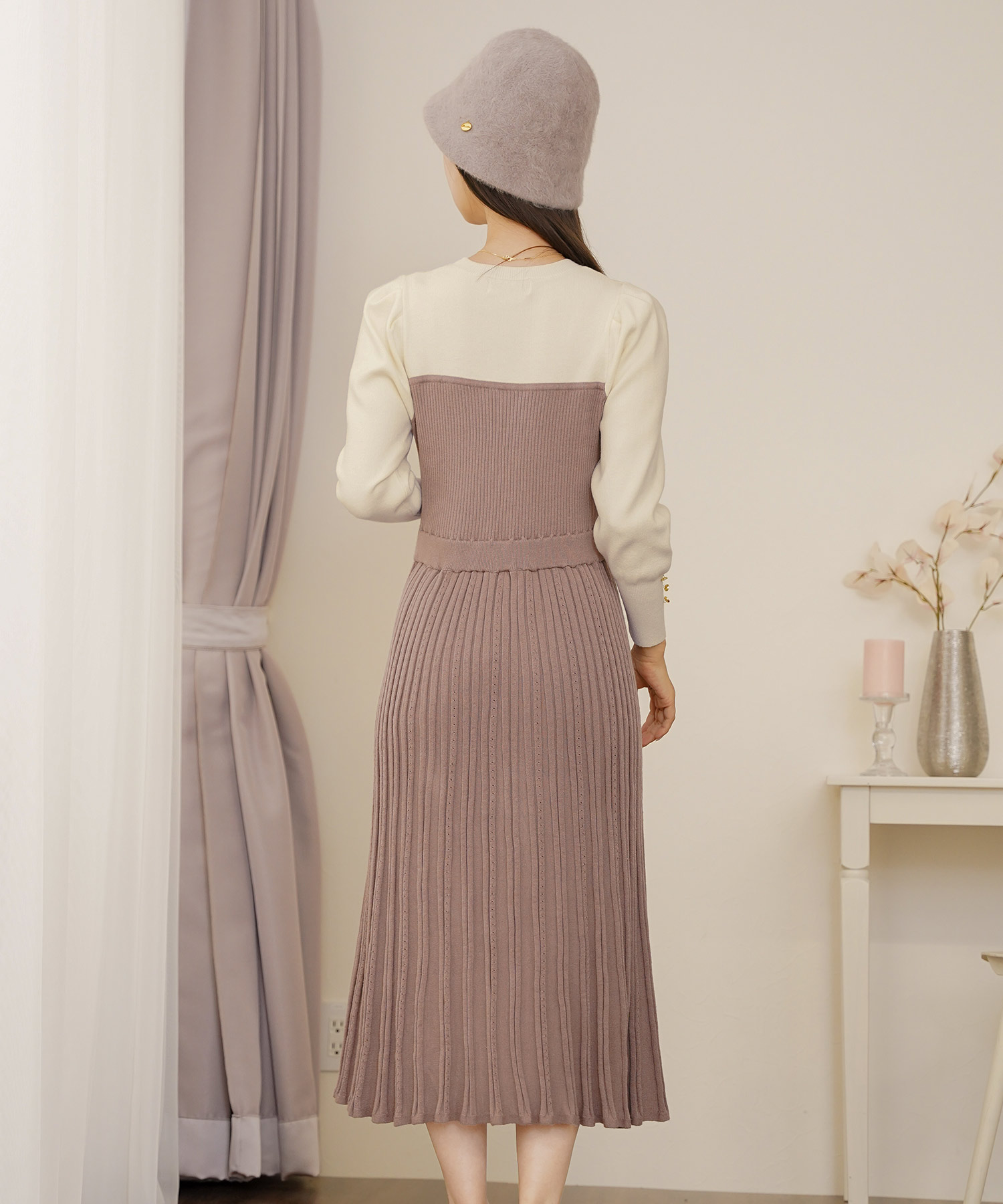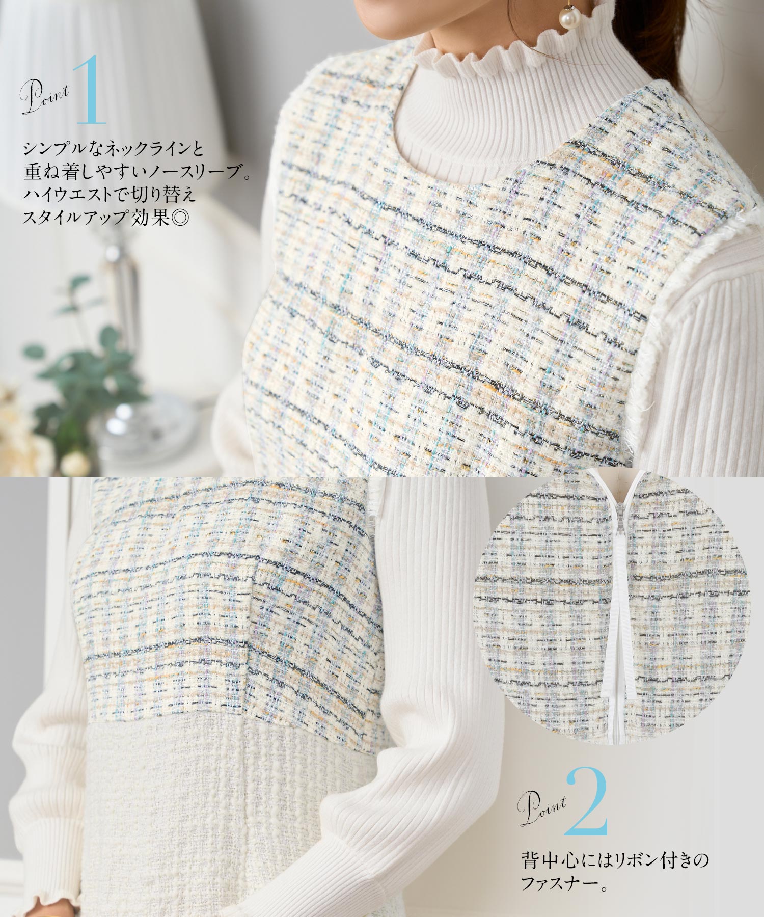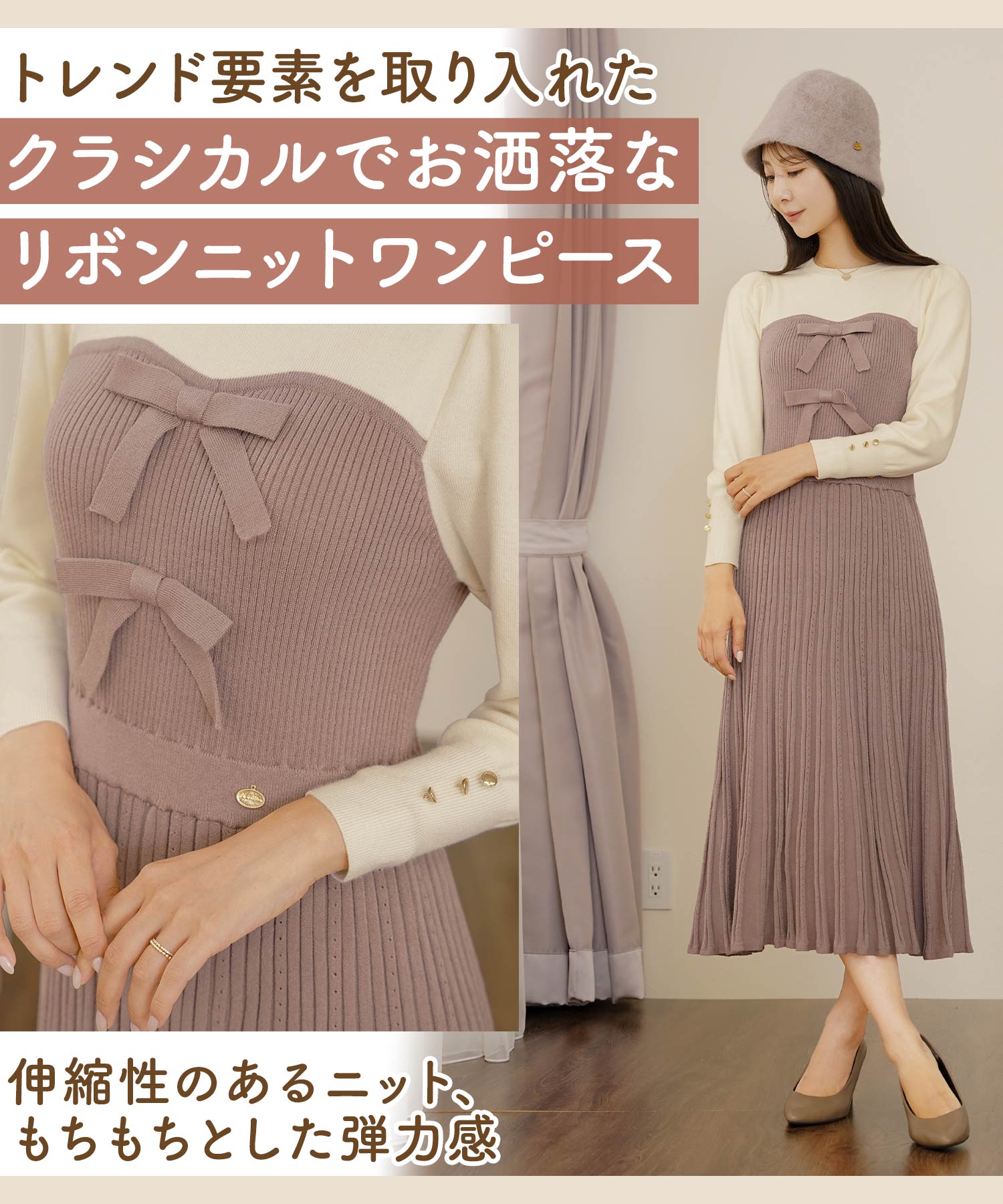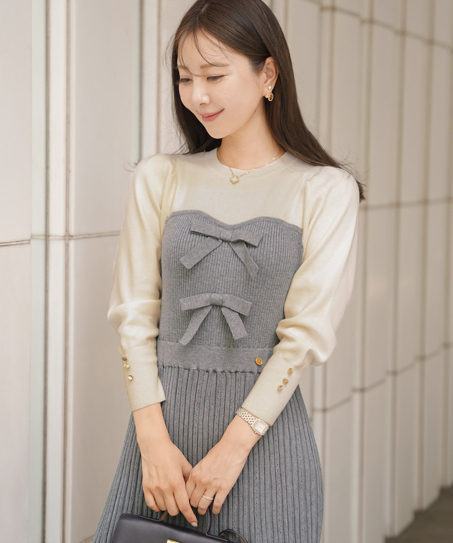 トレンド感ときちんと感をほどよく両立した、ビストロでの食事会にぴったりのリボンニットワンピース。ベア切替風のバイカラー配色と、バスト〜ウエストにかけてのリブ編みが、着るだけでメリハリのある美シルエットを演出します。胸元のリボンディテールとゴールドボタンが、クラシカルなムードを添えつつ顔まわりを華やかに見せてくれるポイントに。もちっとした弾力のあるニットと、縦ライン×ドット柄をミックスしたフレアスカートで、長時間のディナーでも楽な着心地とすらりとした印象を叶えてくれる一着です。