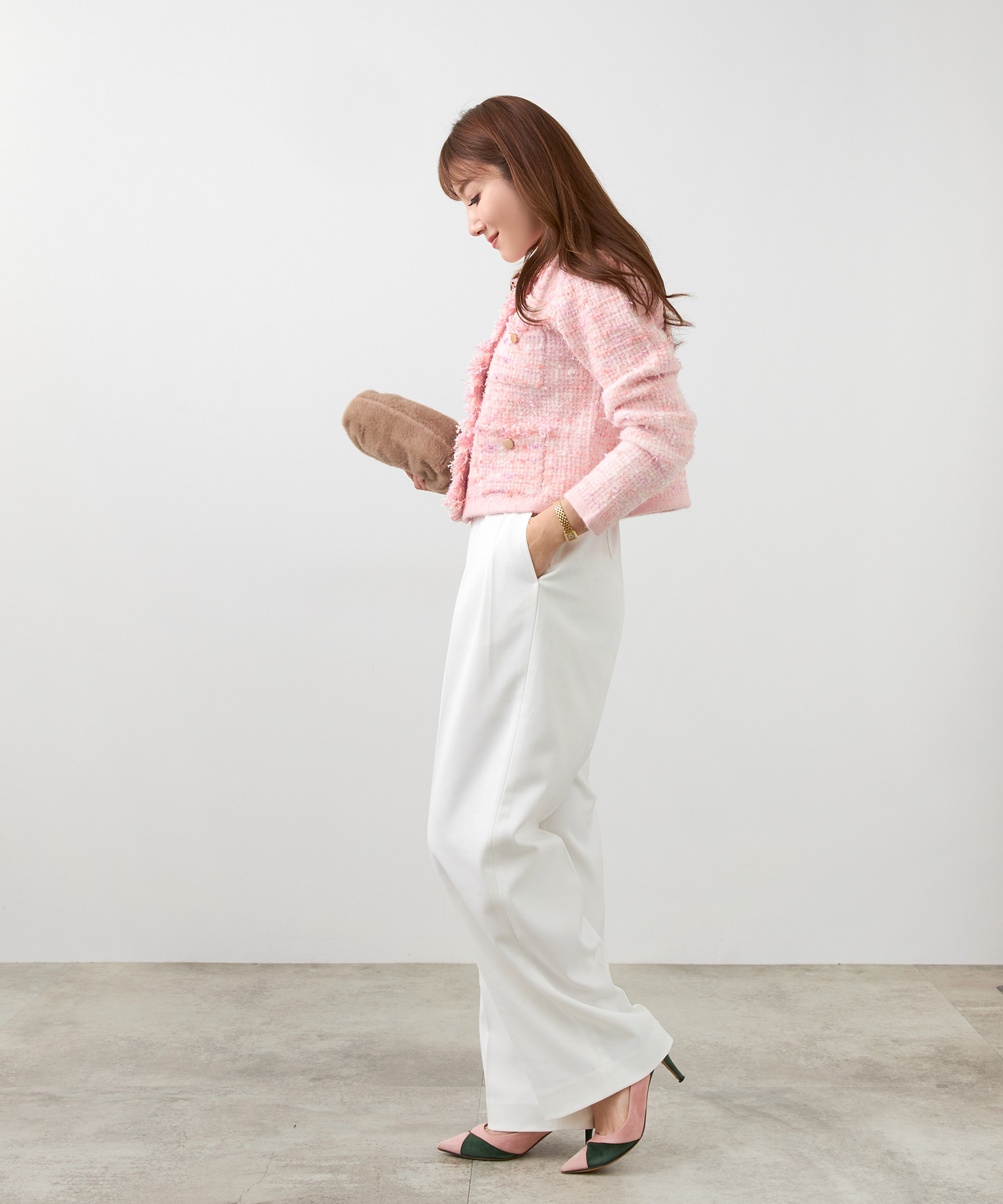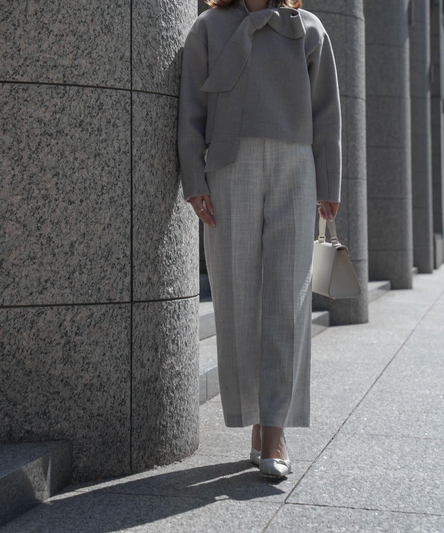 和室の雰囲気にも自然になじむニットカーディガン。襟ぐりと袖口にはフリンジ状のツイードをあしらい、さり気なく表情をプラスしながらも派手になりすぎない上品な一枚です。コンパクトなシルエットでワイドパンツとも好相性。座り姿勢でも窮屈感が出にくく、料亭での食事会にも快適にお召しいただけるコーディネートが叶います。
