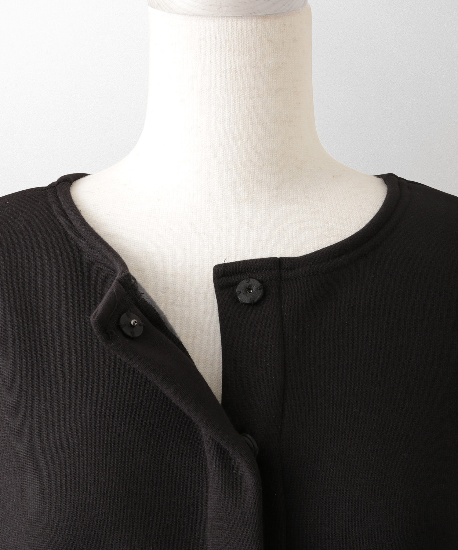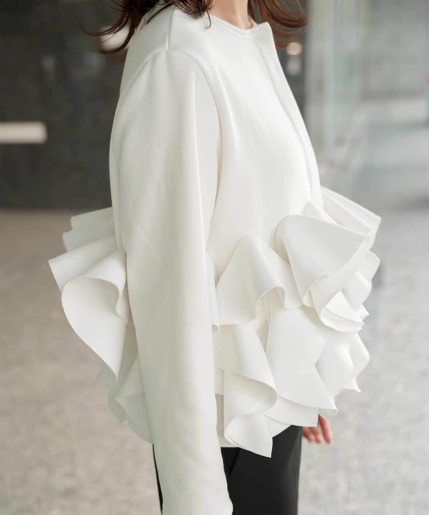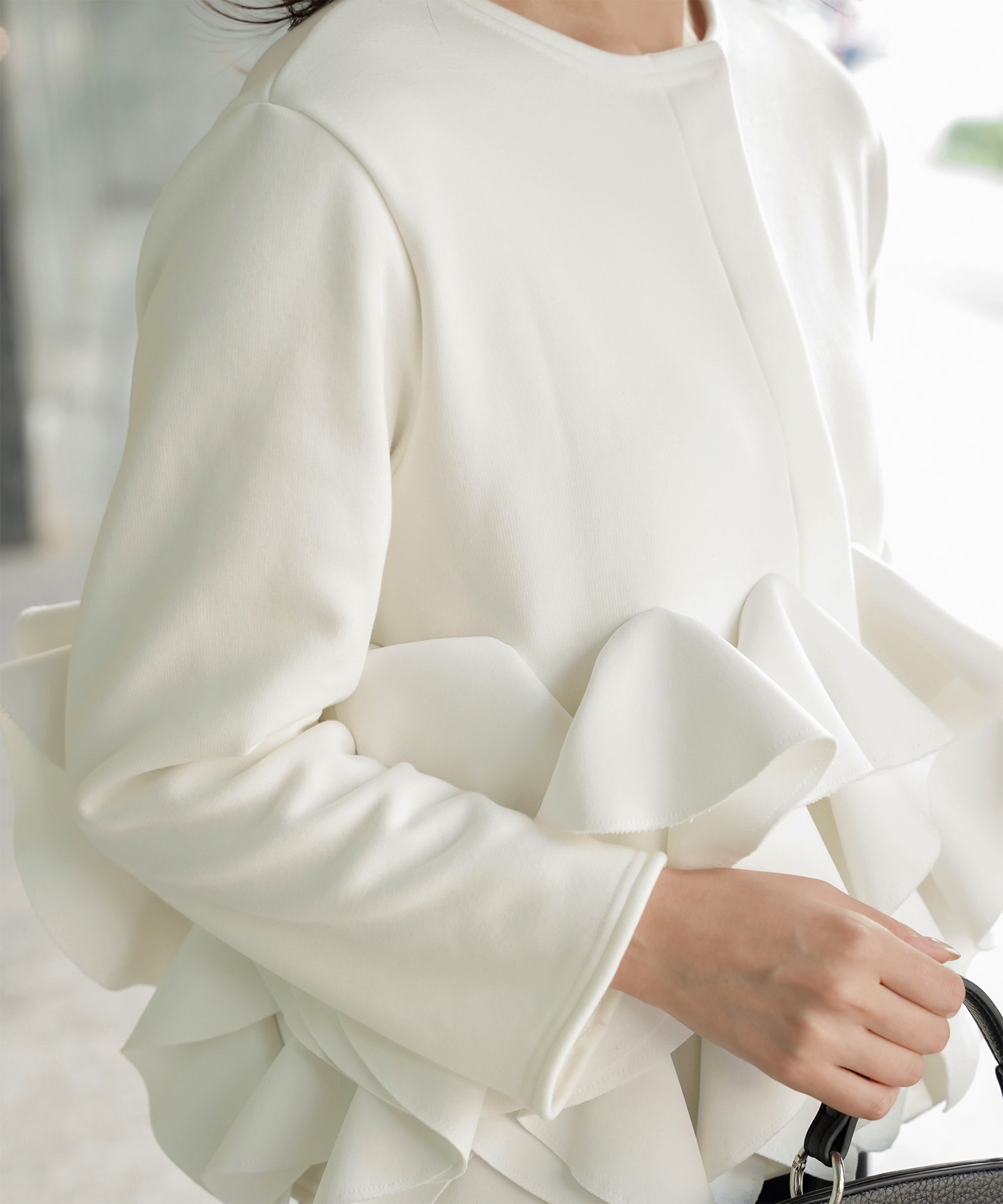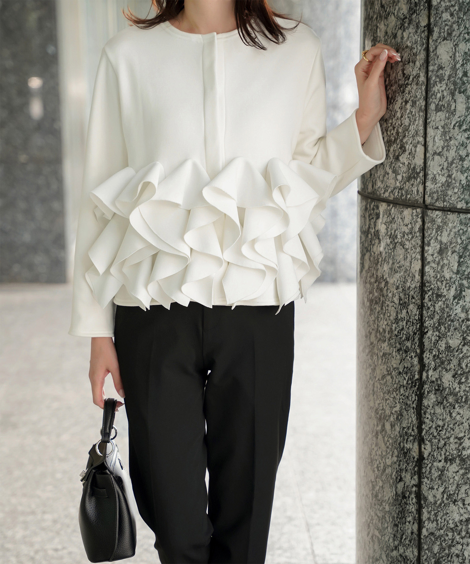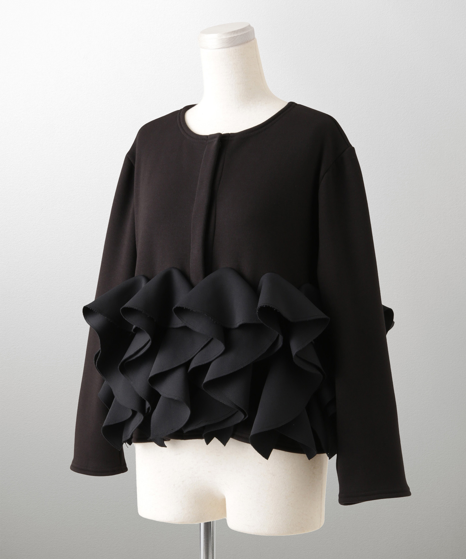 なめらかな肌触りと高い保温性で、“まるで着る毛布”のような着心地が楽しめるフリルヘムジャケット。たっぷりあしらったフリルがカジュアルな中にも女性らしい華やかさを添え、カジュアルレストランでの食事会にもぴったりです。トップスとして一枚で着ても、軽い羽織りとして使ってもサマになる万能デザインです。