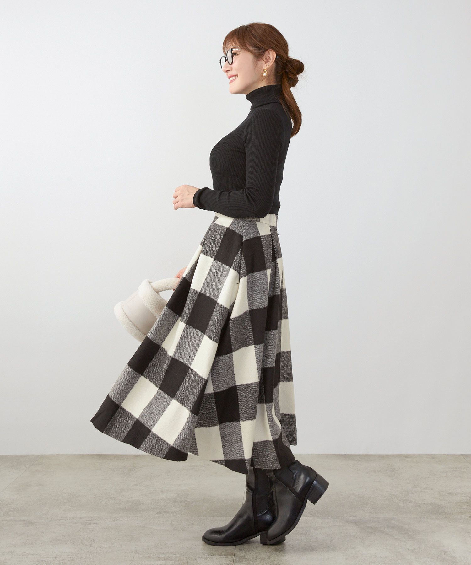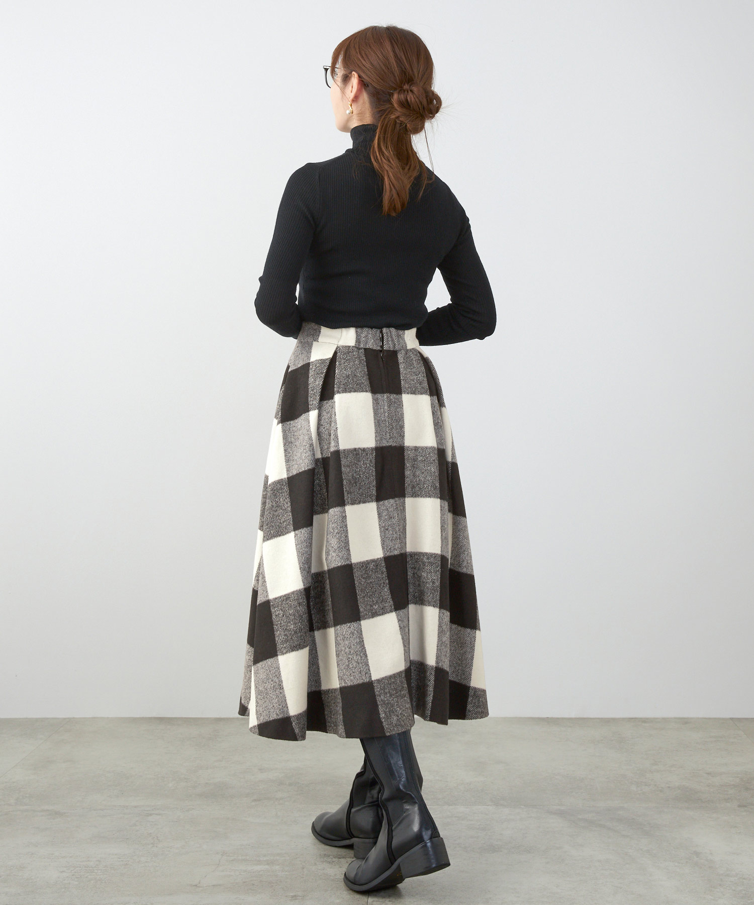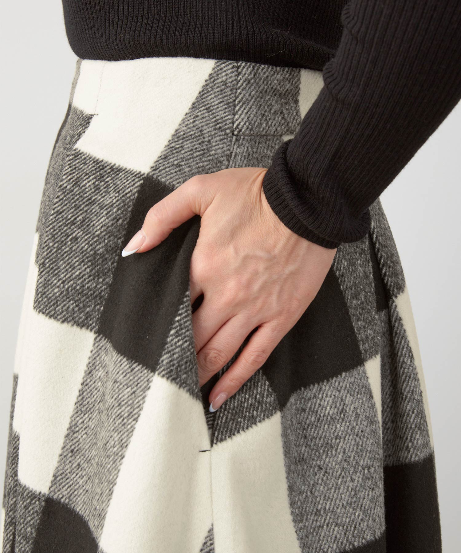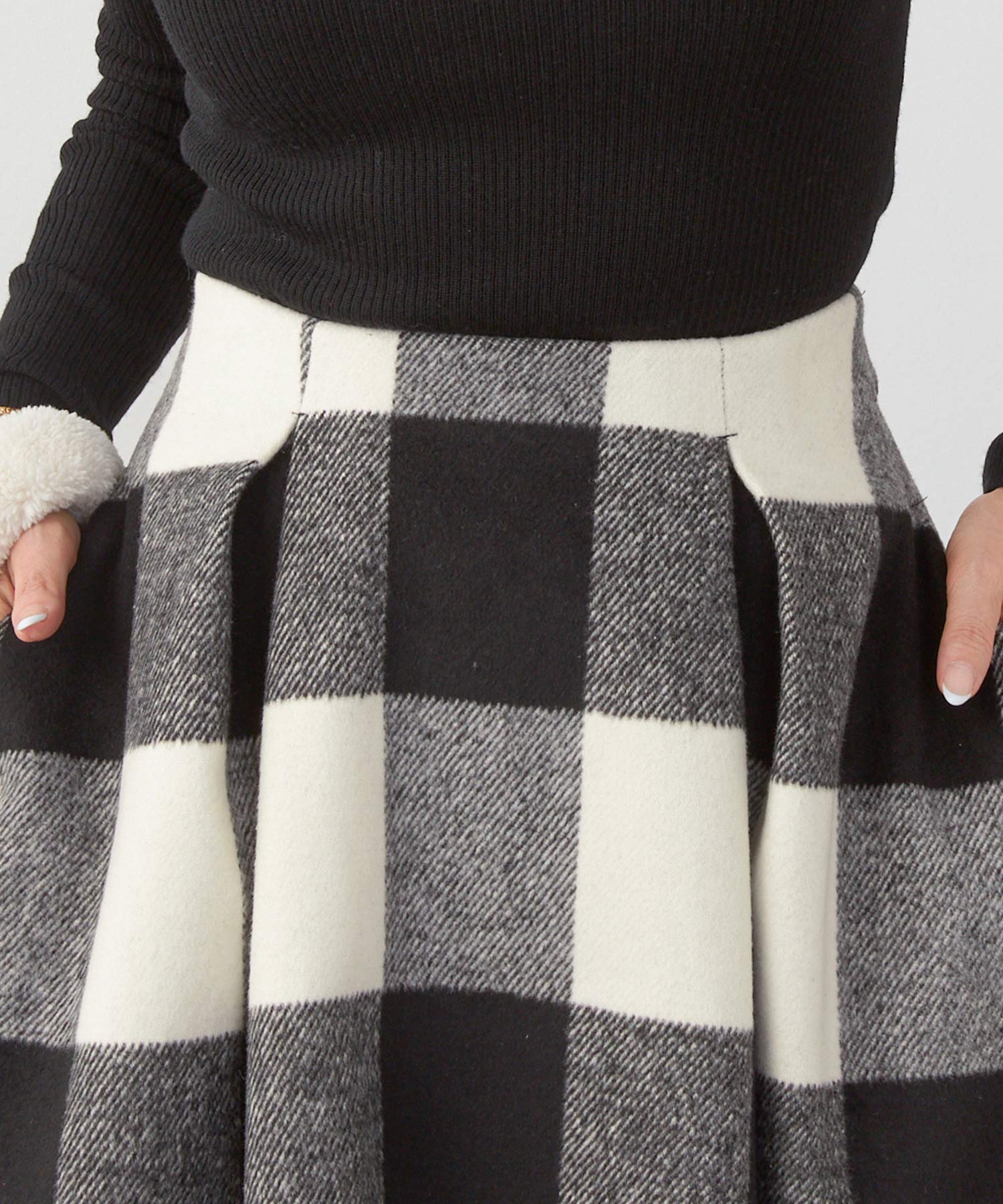 ハイウエストデザインで脚長効果が期待できるフレアスカート。タックからふんわりと広がるシルエットと、大きめチェック柄がコーデの主役になり、カジュアルレストランでの食事会などちょっと特別な日にもぴったりです。ウール混のあたたかな素材は、ほどよいハリ感があり、立ち姿も座り姿もきれいにキープ。シンプルなニットやブラウスを合わせるだけで、品よく華やかな大人カジュアルが完成します。