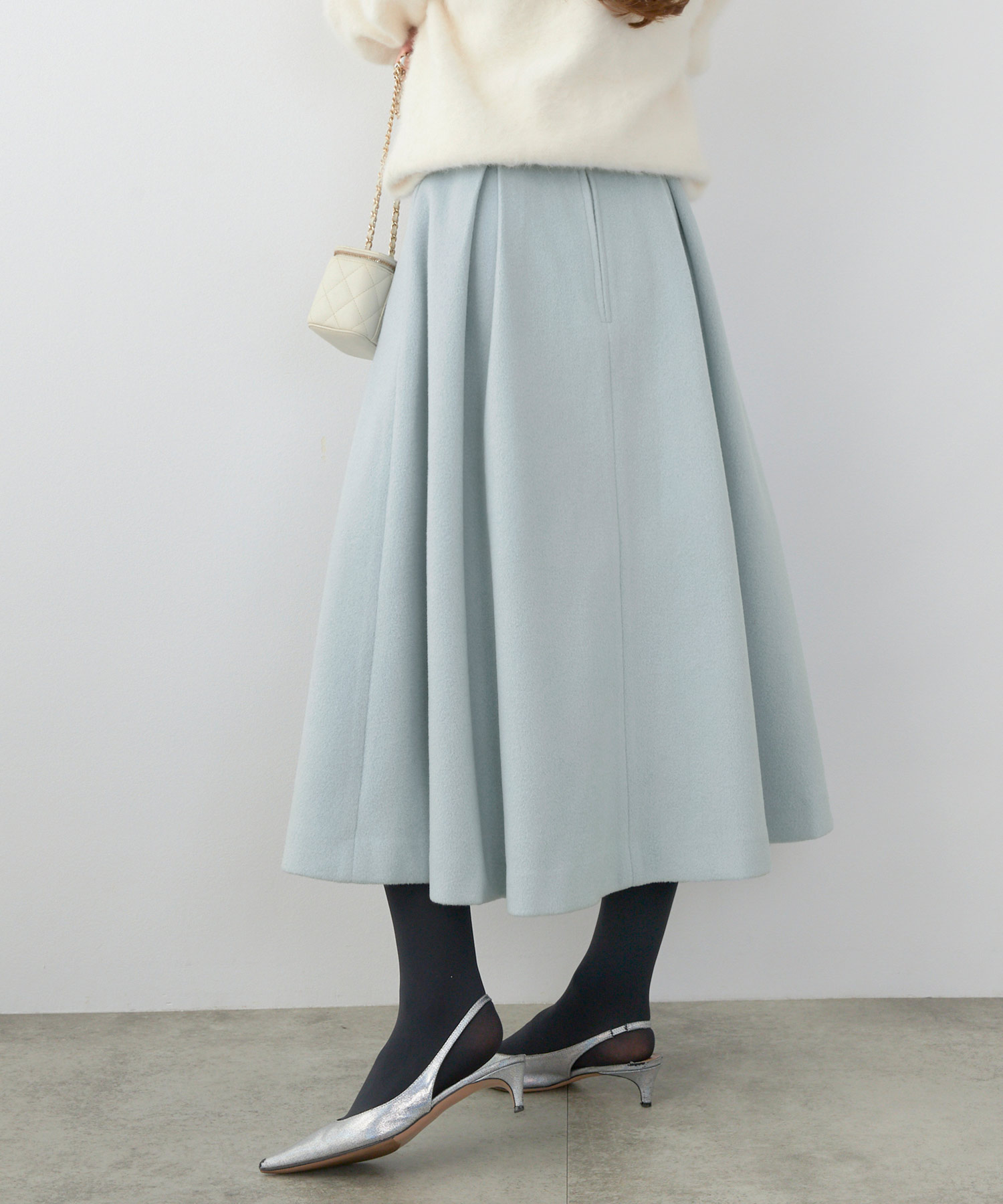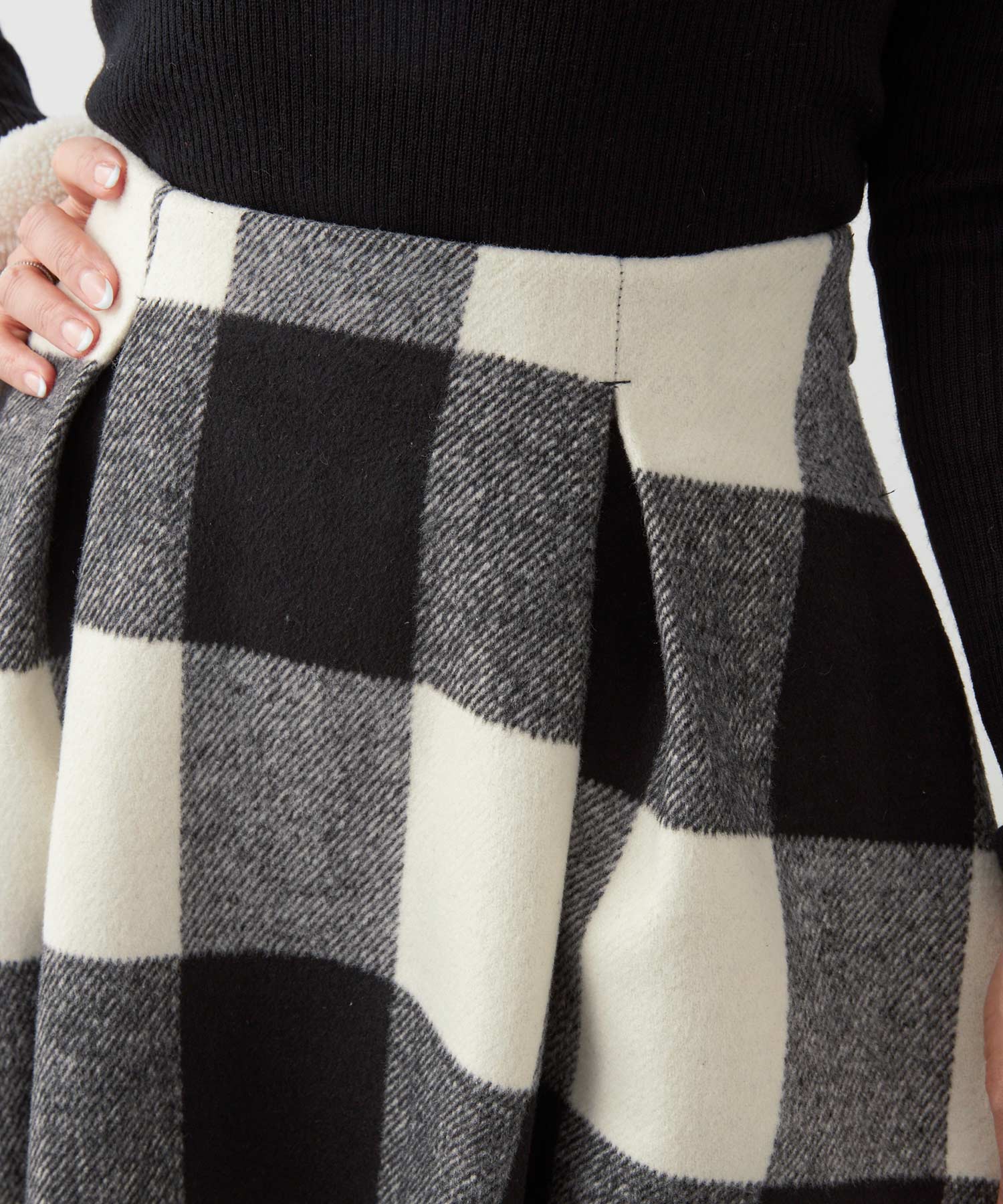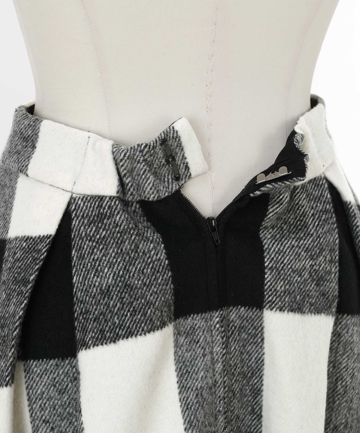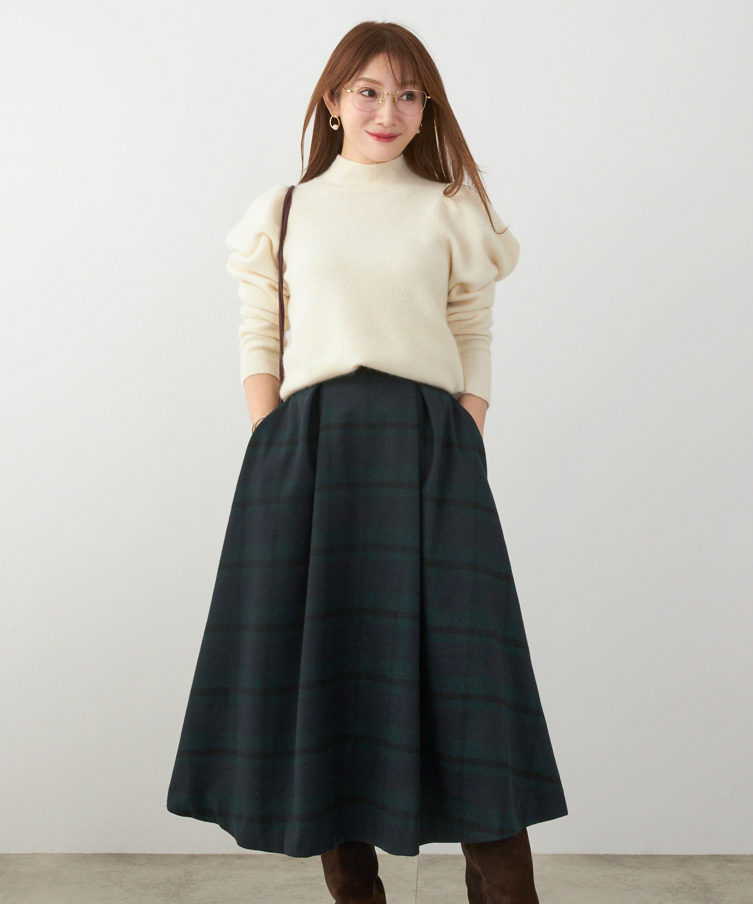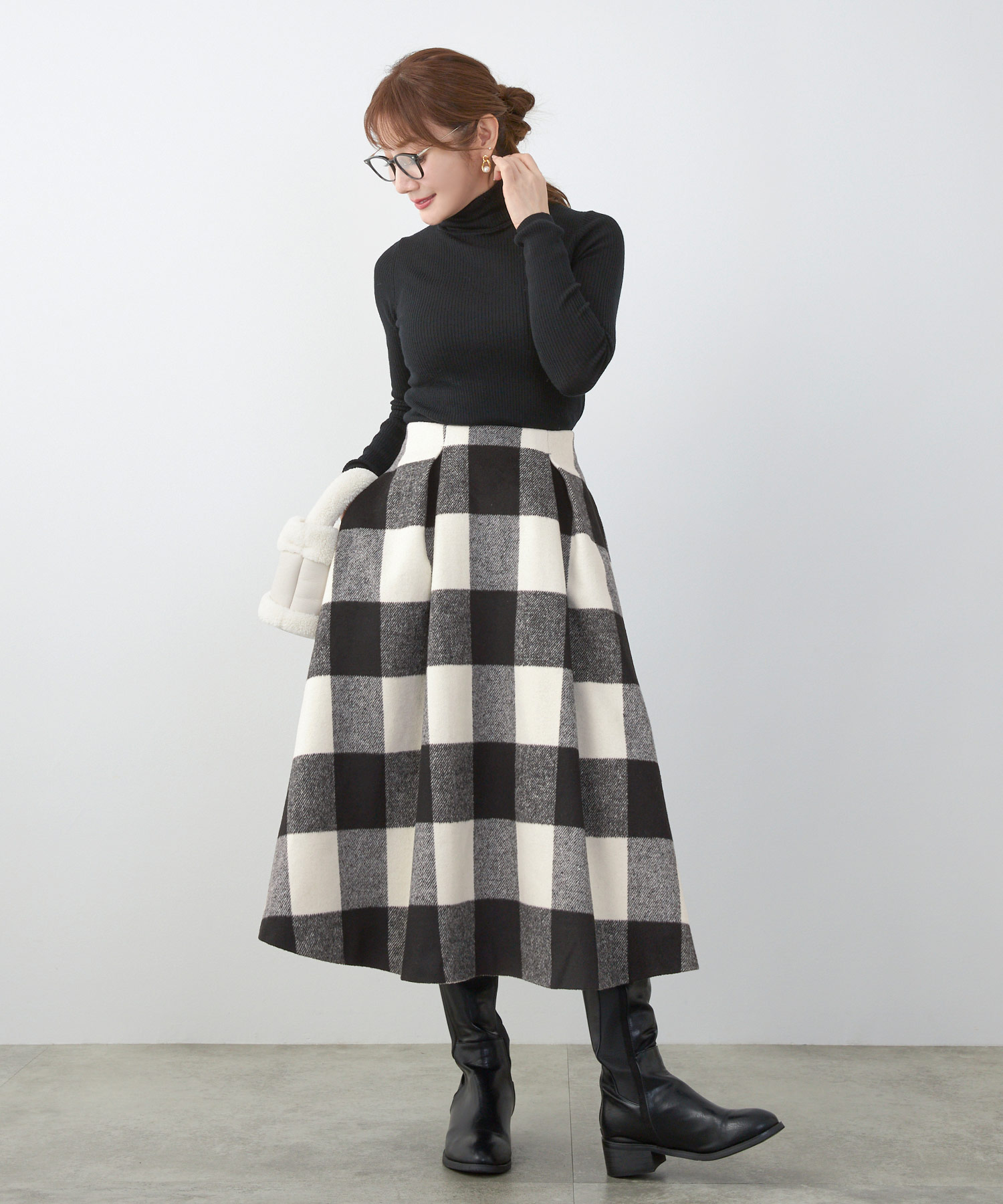 ハイウエストデザインで脚長効果が期待できるフレアスカート。タックからふんわりと広がるシルエットと、大きめチェック柄がコーデの主役になり、カジュアルレストランでの食事会などちょっと特別な日にもぴったりです。ウール混のあたたかな素材は、ほどよいハリ感があり、立ち姿も座り姿もきれいにキープ。シンプルなニットやブラウスを合わせるだけで、品よく華やかな大人カジュアルが完成します。