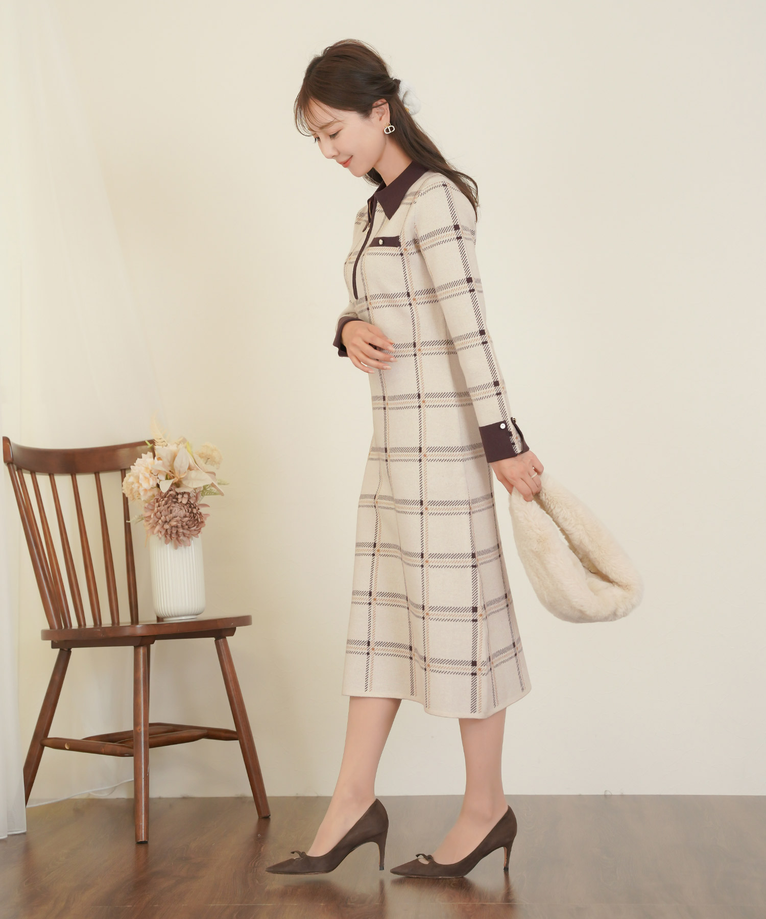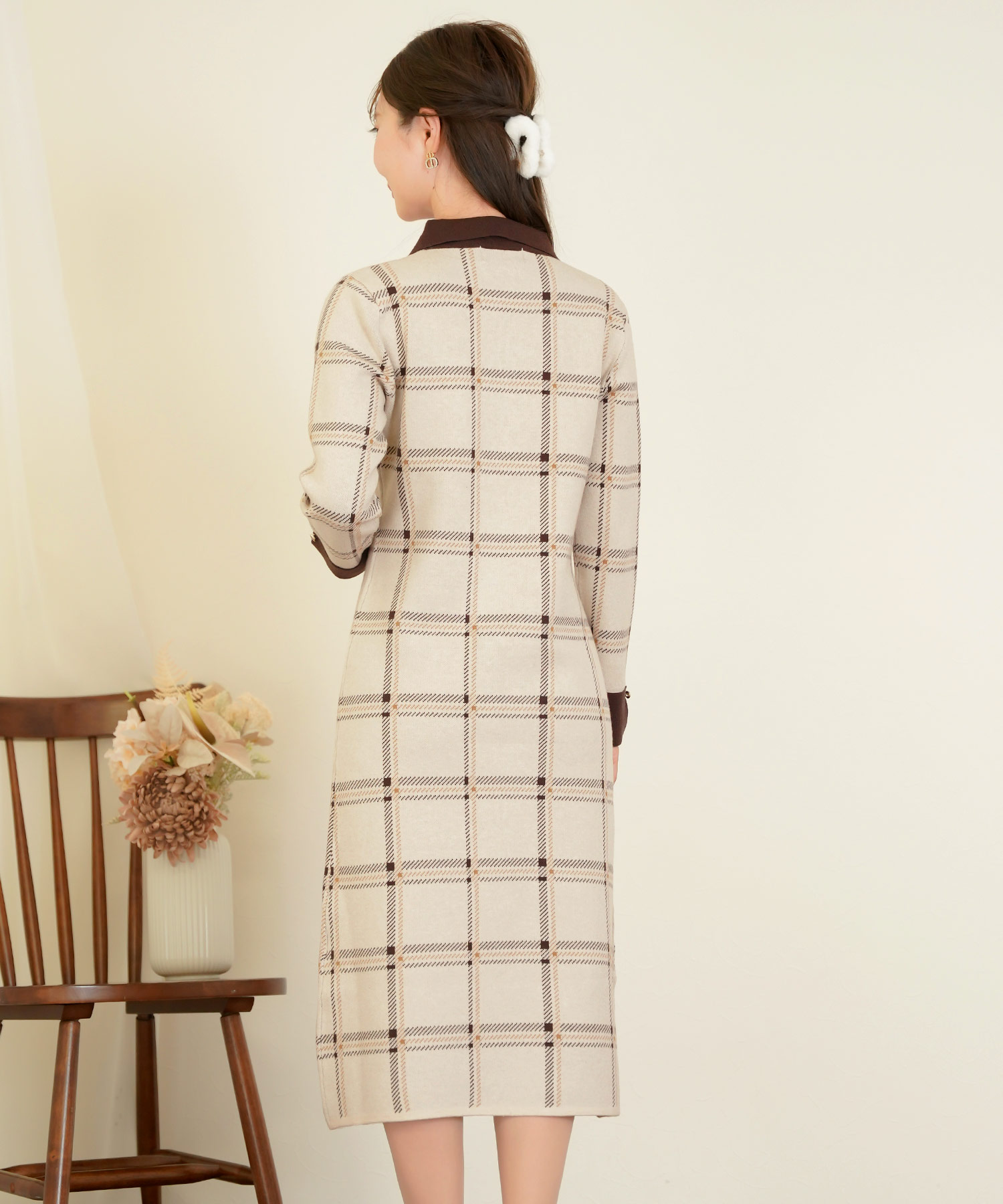 バイカラーチェックが目を引く、主役級のニットワンピース。ほどよい厚みとハリのあるダブルジャカード編みで、着るだけでシルエットがすっきり整います。襟と袖口の配色が顔まわりを明るく見せてくれるので、カジュアルレストランでの食事会にもぴったり。大ぶりのチェック柄でも上品さがあり、写真映えしつつ大人らしい華やかさを演出してくれます。