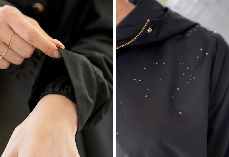 ▲(写真左)袖口をめくると中にもゴムギャザー仕様の袖がついているので、風よけになります。(写真右)撥水加工を施しているので多少の雨なら濡れてもはじきます。