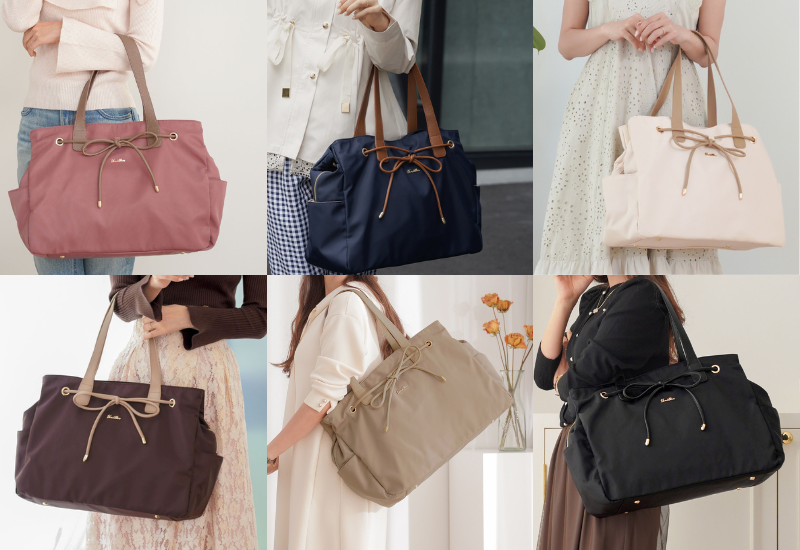▲(上段左)ピンク、(上段中央)ダークネイビー、(上段右)ベージュ、(下段左)バーカンディー、(下段中央)グレージュ、(下段右)ブラック。