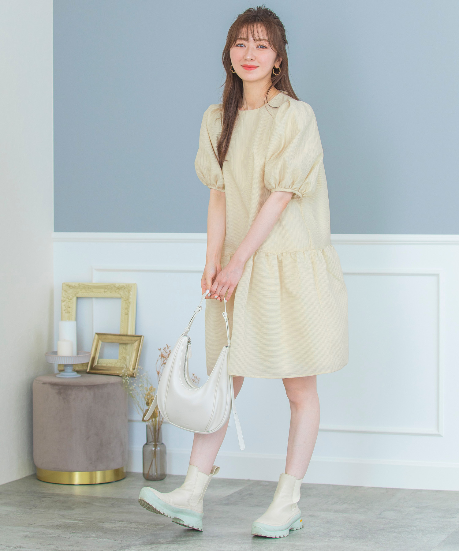 控えめながら、秋冬の優しい日差しのような暖かいイエロー。秋から冬にかけて足元はショートブーツからロングブーツに変化させながら、タイツ合わせもおすすめ。