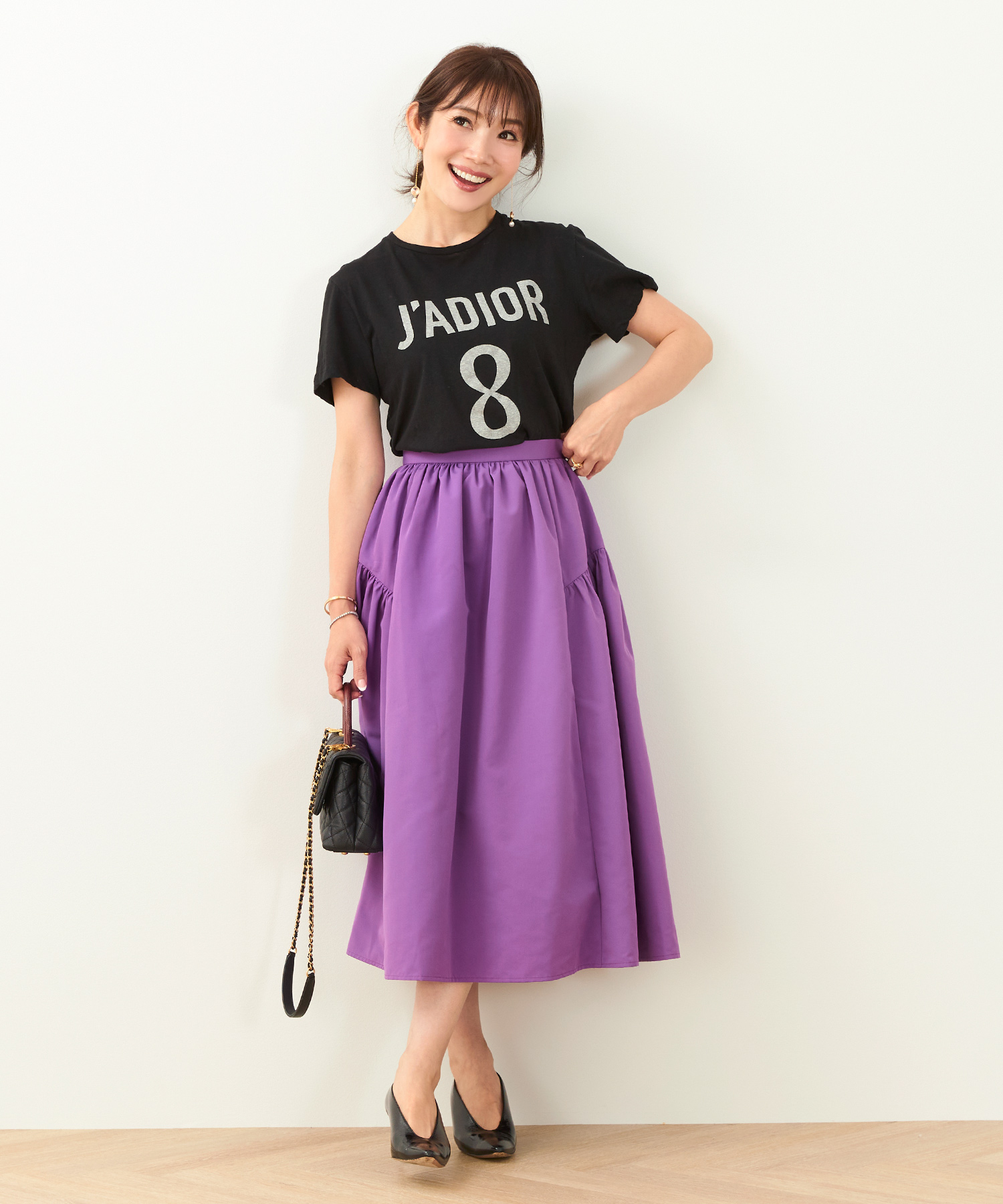 シンプルなスタイリングも全体が上品に引き締まります。さらなるアクセントに小物やブローチなどで装飾を足しても◎