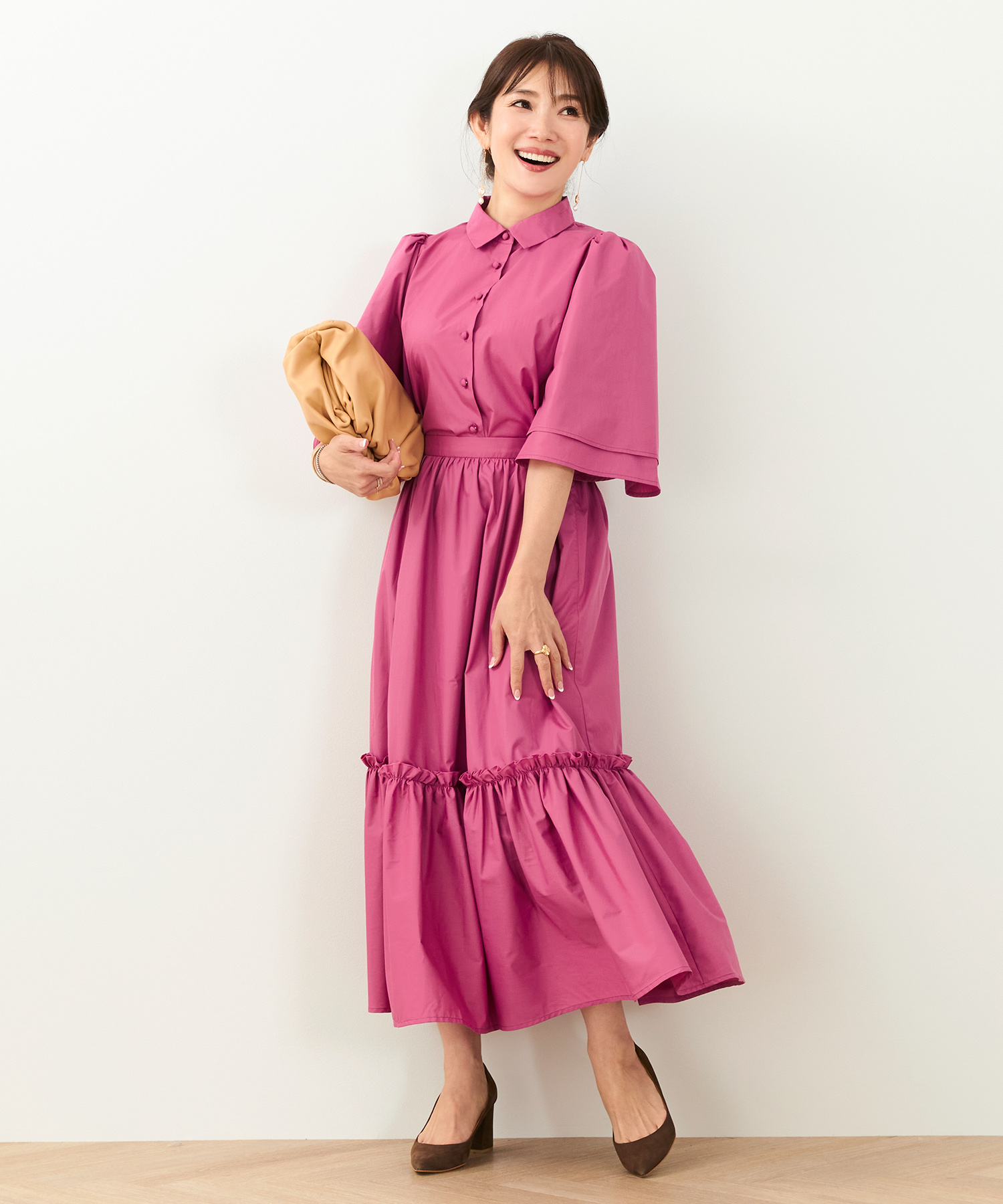 パッと目を惹く鮮やかなバービーピンク。明るいカラーって着てみると意外といいじゃん♪ってなりがちなんです。