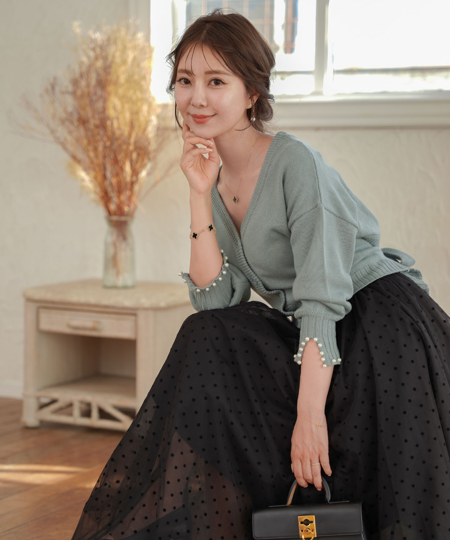 ムードある品の良さを表していますよね。セットアップのニットスカートと合わせるのもおすすめ。