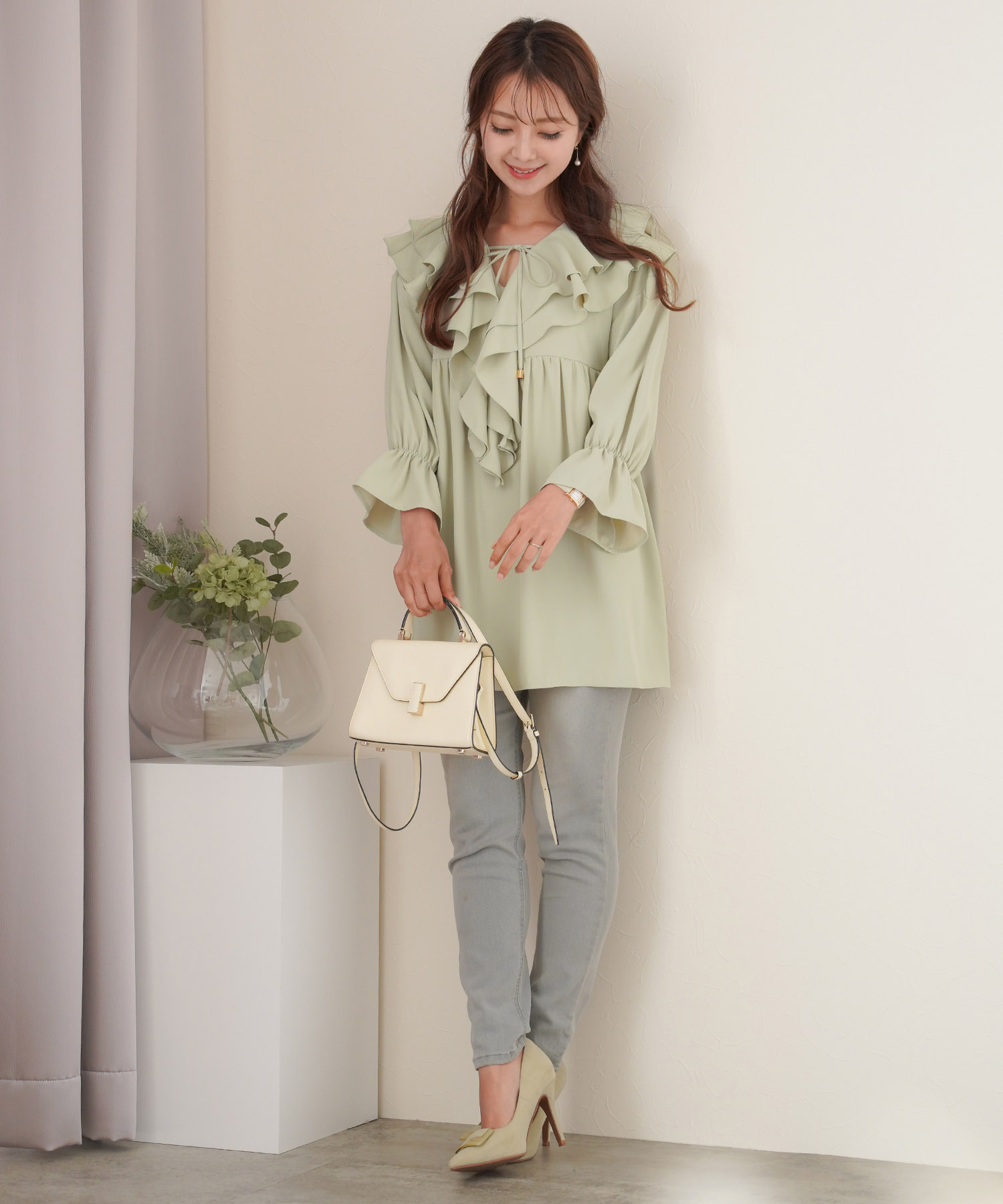 強いグリーンから落ち着き、さらなる癒しを感じるグリーンブラウスが登場。