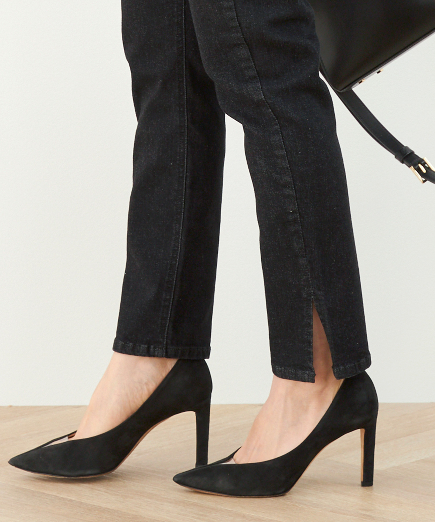 動きやすさを重視して、やっぱり足元はスニーカーが鉄板。パンツスタイルにスニーカーだとどうしてもカジュアルになり過ぎるので、ポインテッドデザインやスリッポンなど、すっきりとしたデザインをチョイスしましょう。