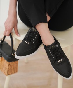 スニーカーを展開するのはブランド初。ヴァニレの甘く柔らかい雰囲気のお洋服とスタイリングしやすいよう形にこだわり、ポインテッドトゥで足元をすらりと、きれいに見せてくれるデザインに仕上げました。それゆえ、カジュアルな着こなしが苦手な方でも挑戦しやすくなっています。さらに注目はスニーカーの紐。通常なら履き口に足を入れ、シューレースを引っ張り結んで…という工程が必要なところ、ヴァニレのスニーカーはゴム仕様にすることでそれを時短できるようにいたしました。「サッと履けて、サッと脱げる」着脱をイージーにし、「紐がほどける・結び直す」その手間を省けるようにしています。また、インソールにも秘密が。長時間履いても靴の中が蒸れない設計と歩き疲れにくい低反発クッションを搭載。オシャレはしたいけど無理もしたくない、そんな女性にぴったりの一足ができました!
