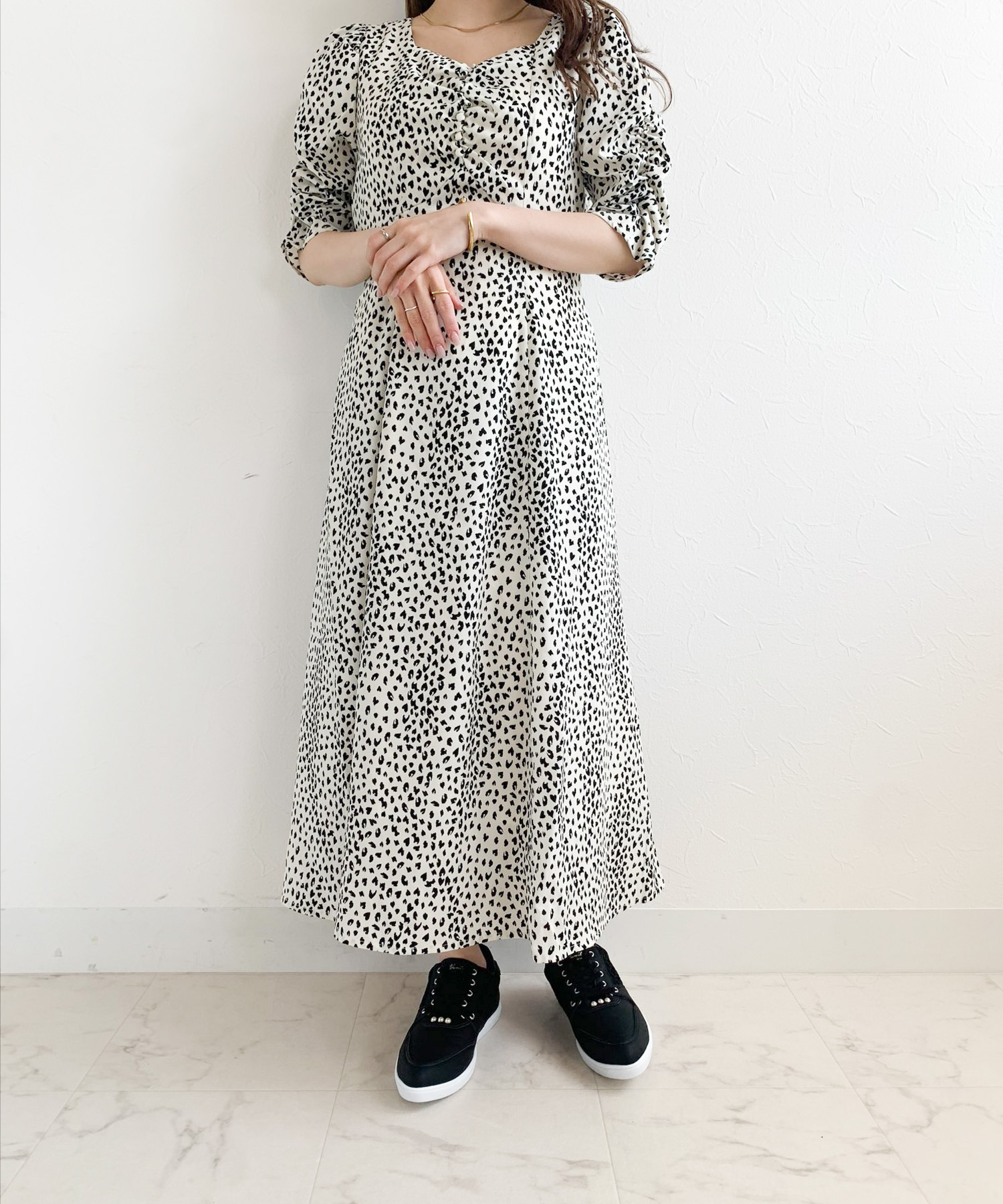 3:アニマル柄ワンピと黒スニーカーで華やかシックな着こなし