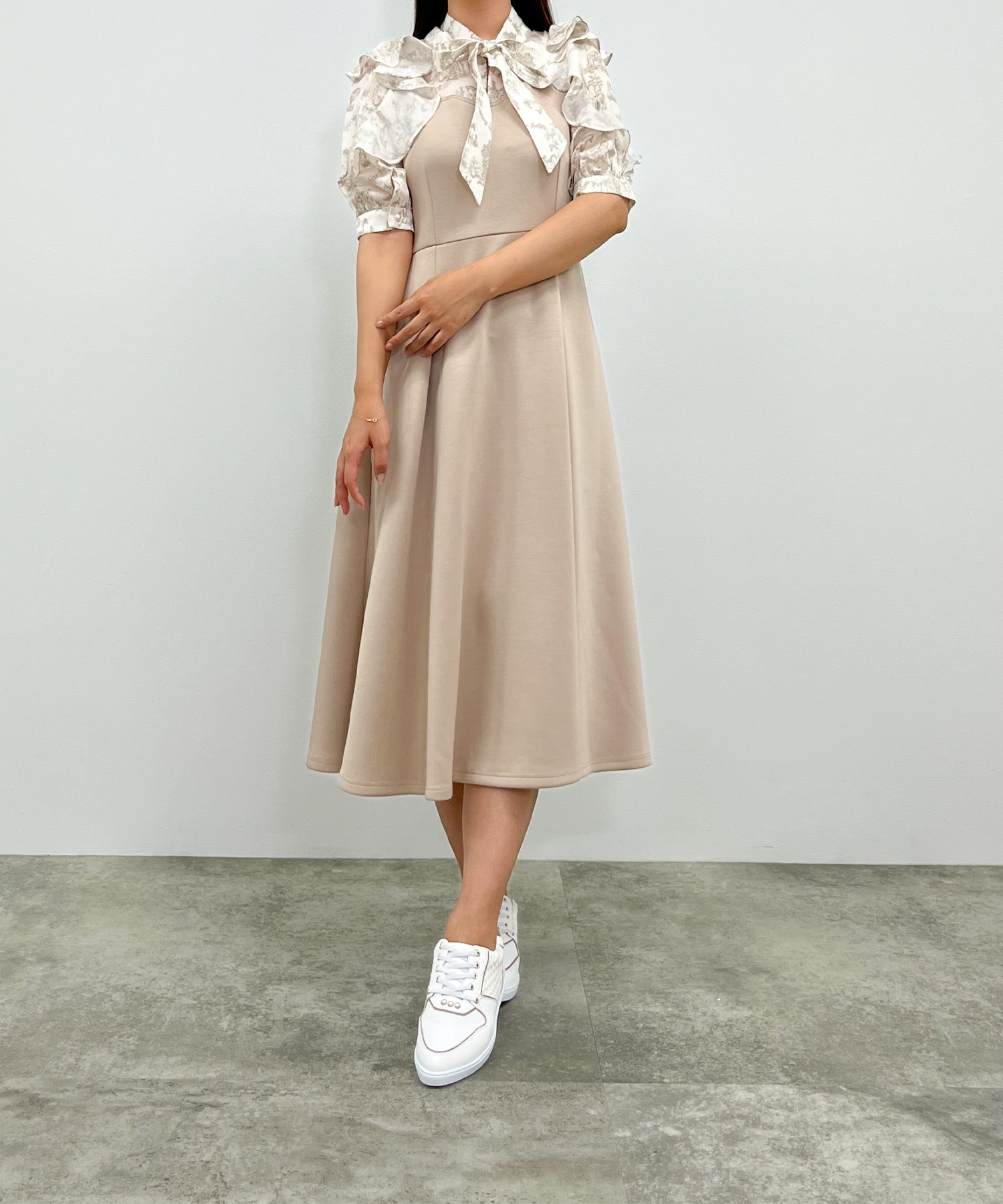 ボウタイ付きのレディなワンピースもあえてスニーカーで外すことでこなれた印象に。足先を美しく見せてくれるポインテッドトゥなら女性らしさがあり、ワンピースの雰囲気ともマッチします。ワンピースのミルク~ベージュ色に合わせるなら、スニーカーのラインも同系色のモカをチョイスして色のグラデーションを楽しんで。