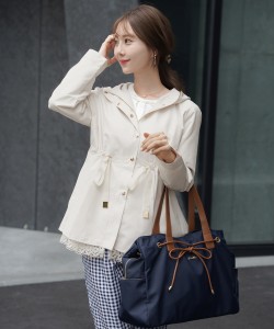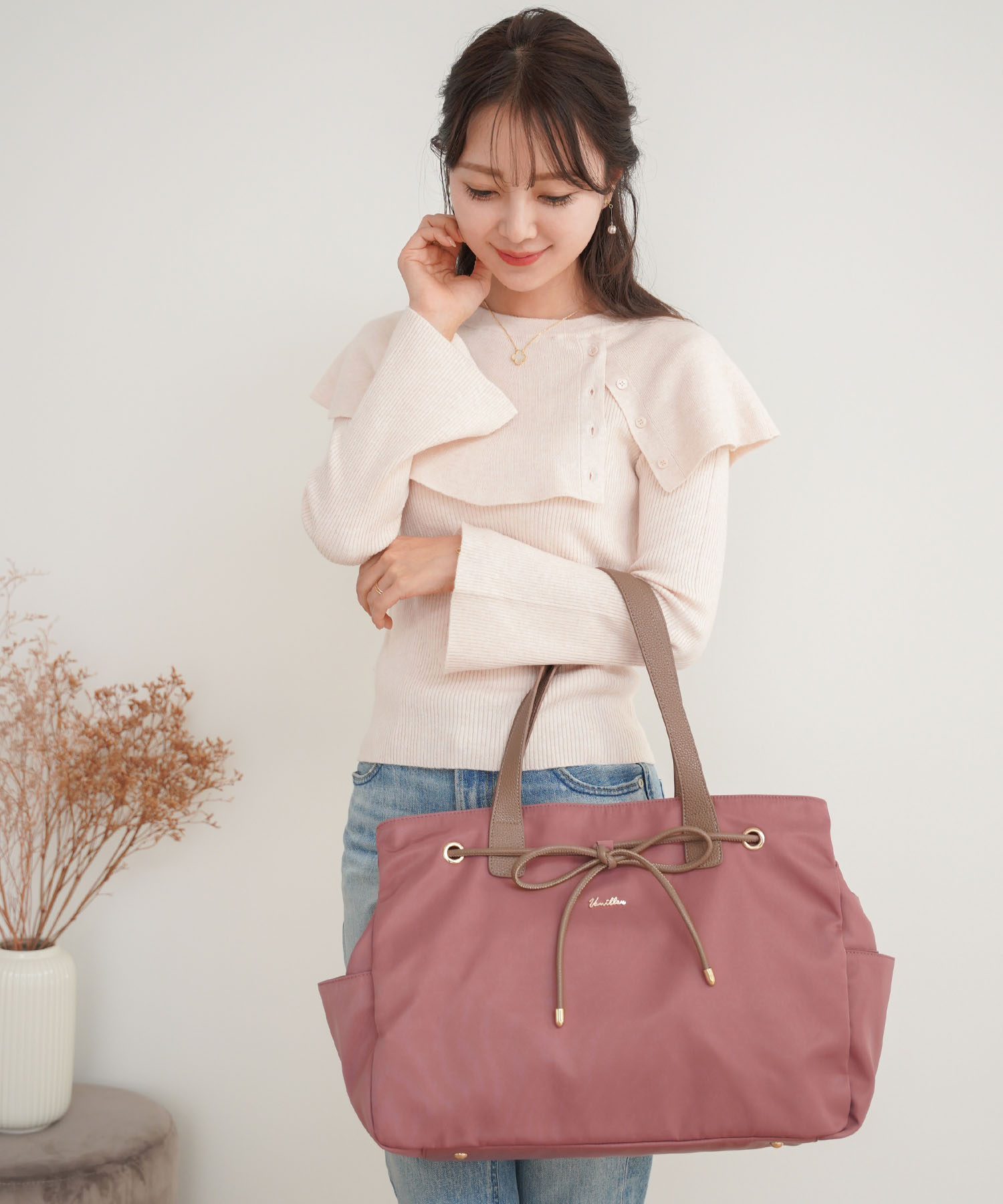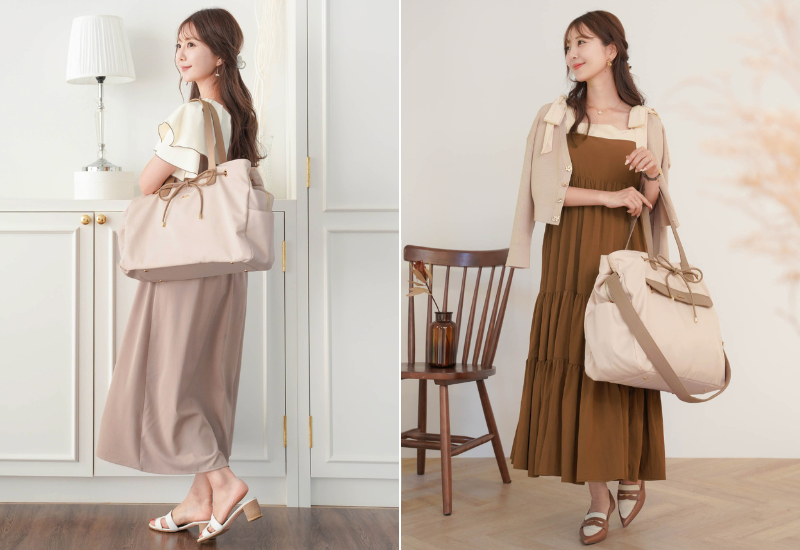 機能的なトラベルトートバッグはマザーズバッグ代わりにもなります。バッグひとつにおむつも着替えもしっかり収納できるのでお子さんとのちょっとしたお出かけに便利です。またキャンバス素材と違い、手入れのしやすいナイロンタッチ素材を使用しているので汚れに強く、ピクニックなどのアウトドアシーンにも持っていくことが。子供と一緒の日はカジュアルな着こなしになりがちなのでバッグの色はピンクを選んで女性らしさを引き上げて。