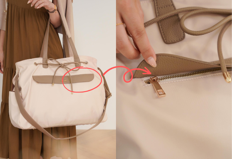 バッグの背面にあるファスナーを開けばキャリーケースのハンドルに引っ掛けることも。キャリーケースとトートバッグをひとまとめにすることで移動もスリムに♪