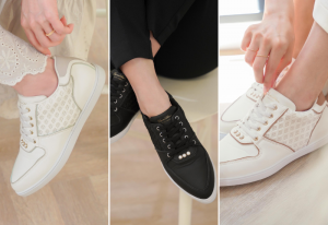 ポインテッドトゥのスニーカーならワンピースやスカートなどフェミニンなアイテムと合わせても馴染んでくれます。靴ひもはゴム製なので履くときにわざわざ靴ひもを解かなくてもゴムを伸ばしてスポッと一瞬で入ります。インソールは通気性の良いメッシュを採用し足ムレを解消!