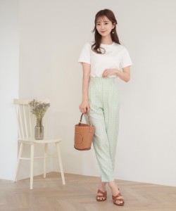動きやすいパンツスタイルも、ミントのギンガムチェックなら爽やかに決まります。白Tシャツにパンツというシンプルな着こなしも、大人可愛い仕上がりに。いつもの白Tシャツコーデにミント色のギンガムチェック柄パンツを投入することで、爽やかかつ地味見えしないスタイリングの完成です。ベルト部分のスカラップ形もコーディネートのポイントに!