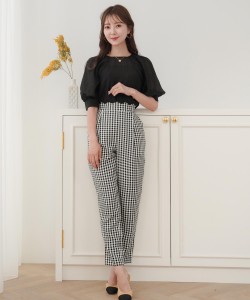 ウエスト スカラップ ギンガム テーパードパンツ le reve vaniller 全3色 |lvn721-1683