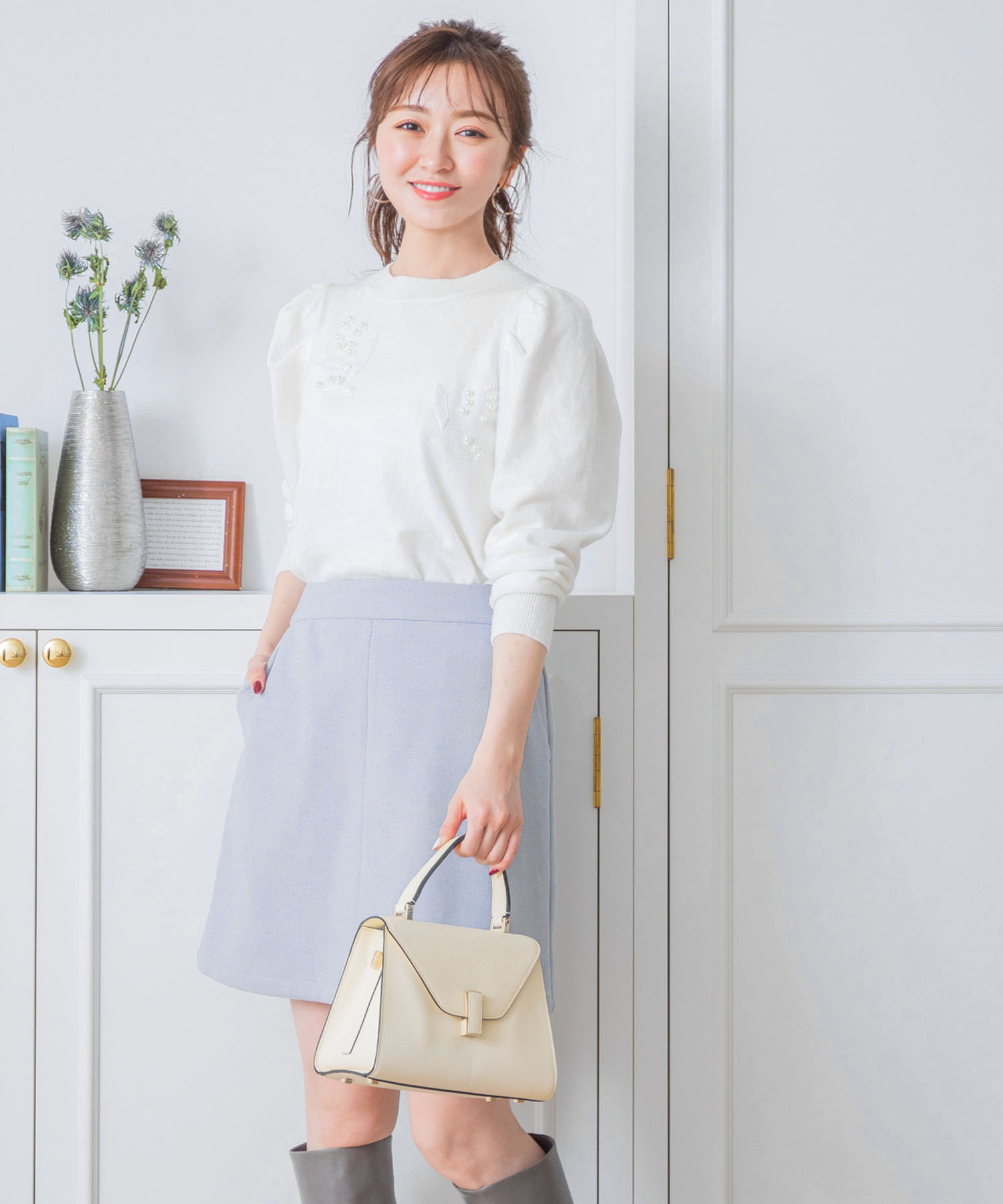 今旬のミニスカートとロングブーツのセットコーデ。ミニスカートを使った着こなしはともすれば幼く見えることもありますが、少しグレーがかったサックスなら甘さが緩和。かわいらしすぎず大人の着こなしにも程よくマッチします。ミニ丈ながら素材はウール混の肉厚素材でまだまだ寒い時期もあたたか♡