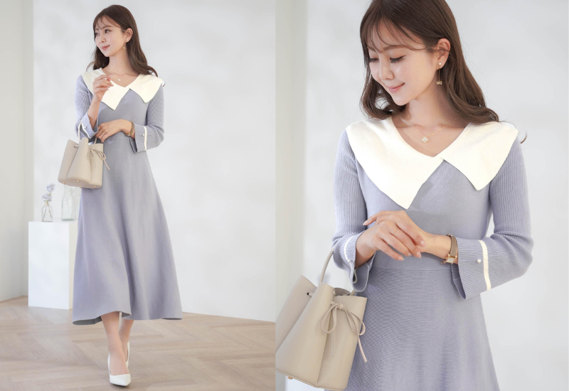 クラシカルで上品なビッグ襟付きのワンピース。トランキルブルーの色味は派手過ぎず華やかさがあるのでホテルでのランチやデートスタイルにもおすすめです。ビッグ襟のディテールで小顔に見える効果も期待することが♪