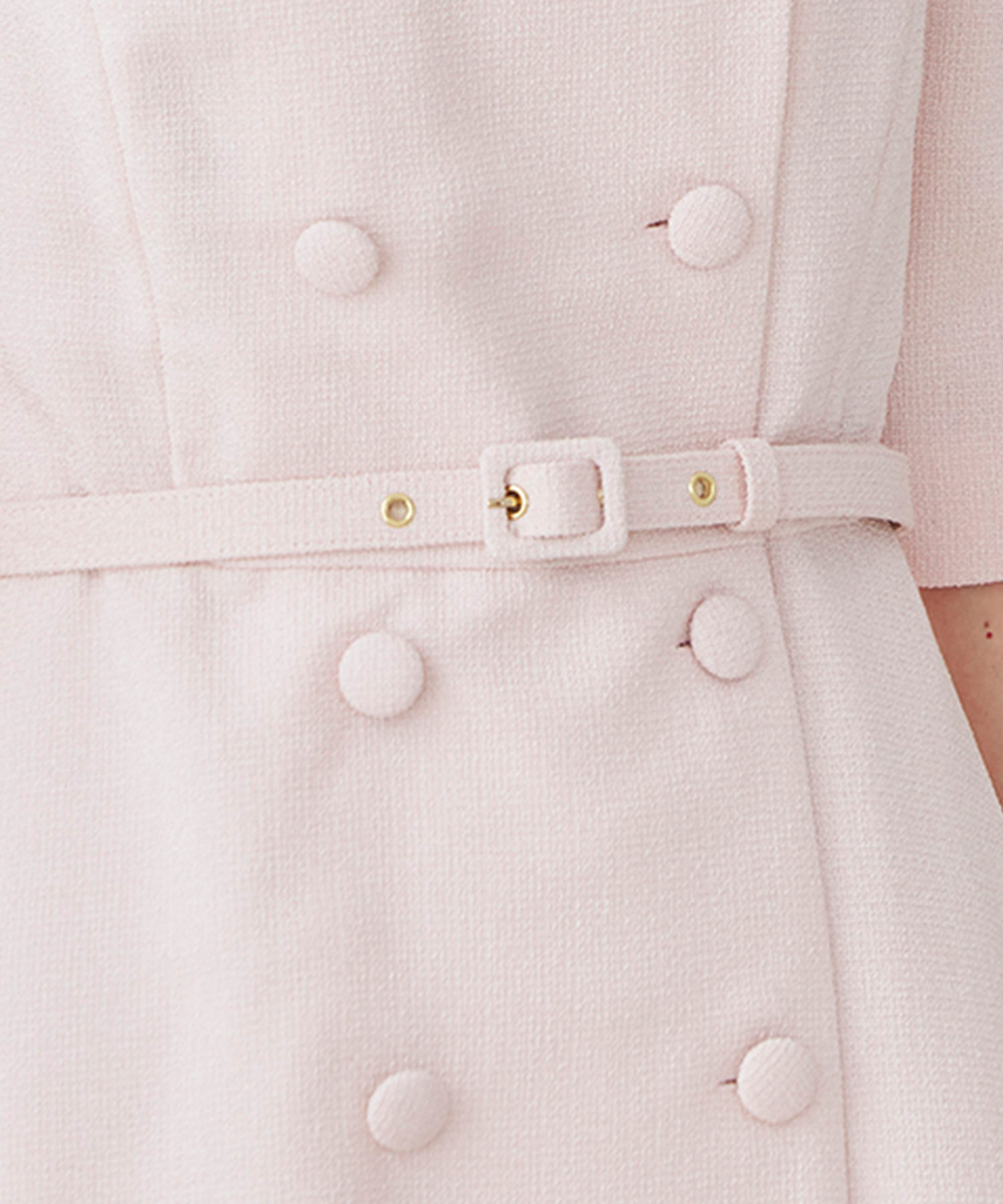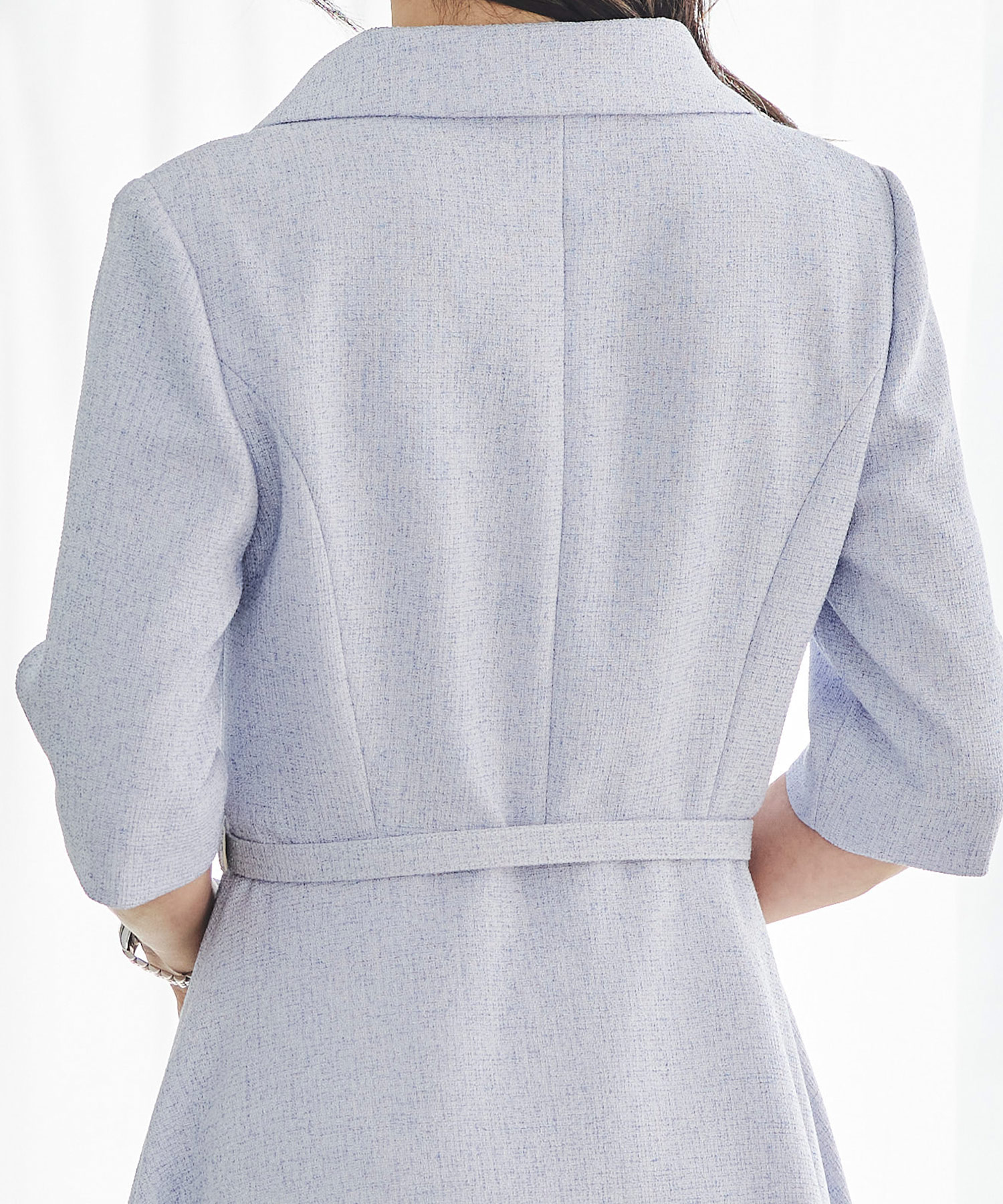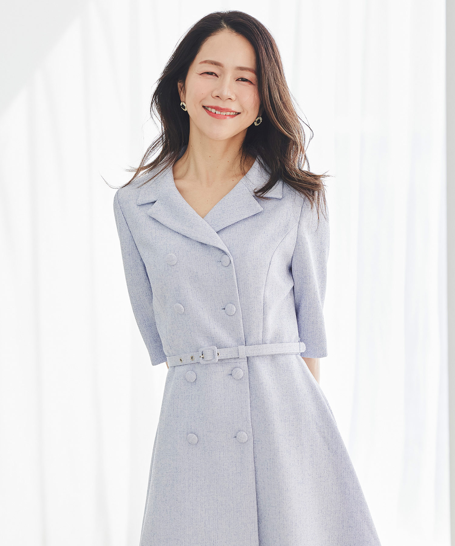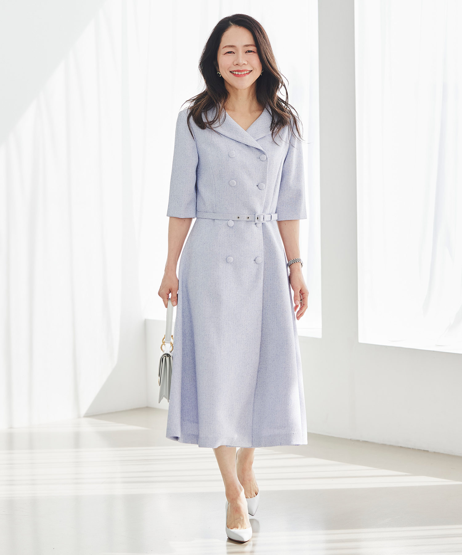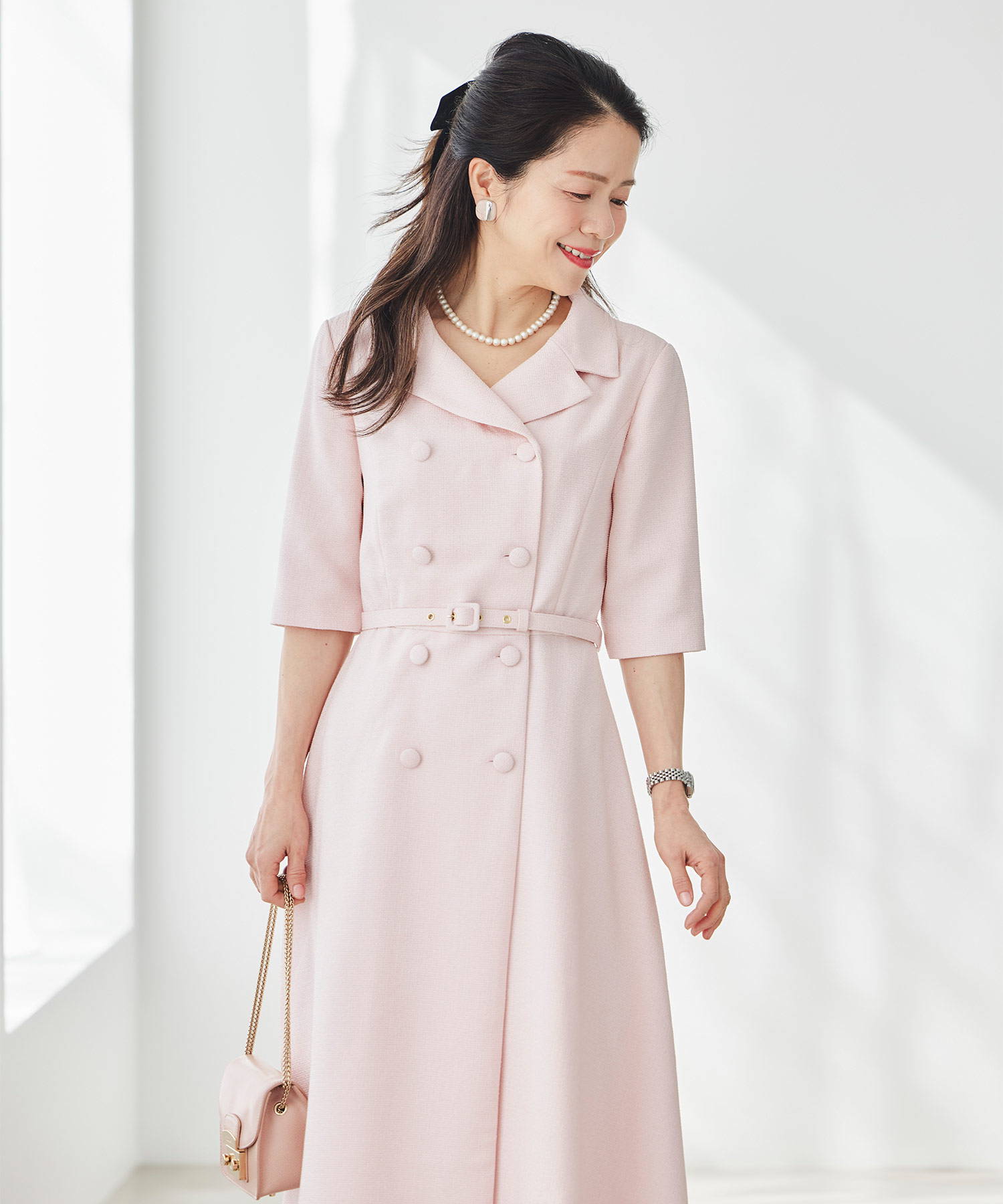春らしい軽やかなツイードライク素材を使用した、季節のおでかけにぴったりのクラシカルなワンピースです。ダブルボタンとエレガントな襟のデザインが印象的で、一枚で品よく華やかな着こなしが完成。ほどよくきちんと感がありながら、堅く見えすぎないので、大人の女性をチャーミングに見せてくれます。春のお出かけや少し特別な日に取り入れたい、上品さのある一着です。