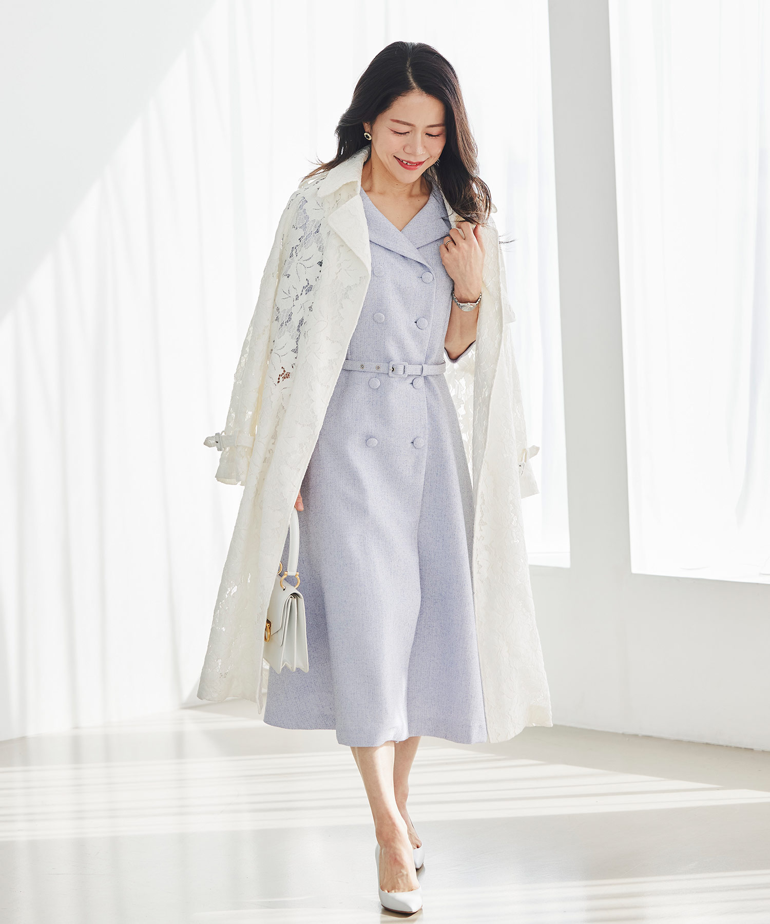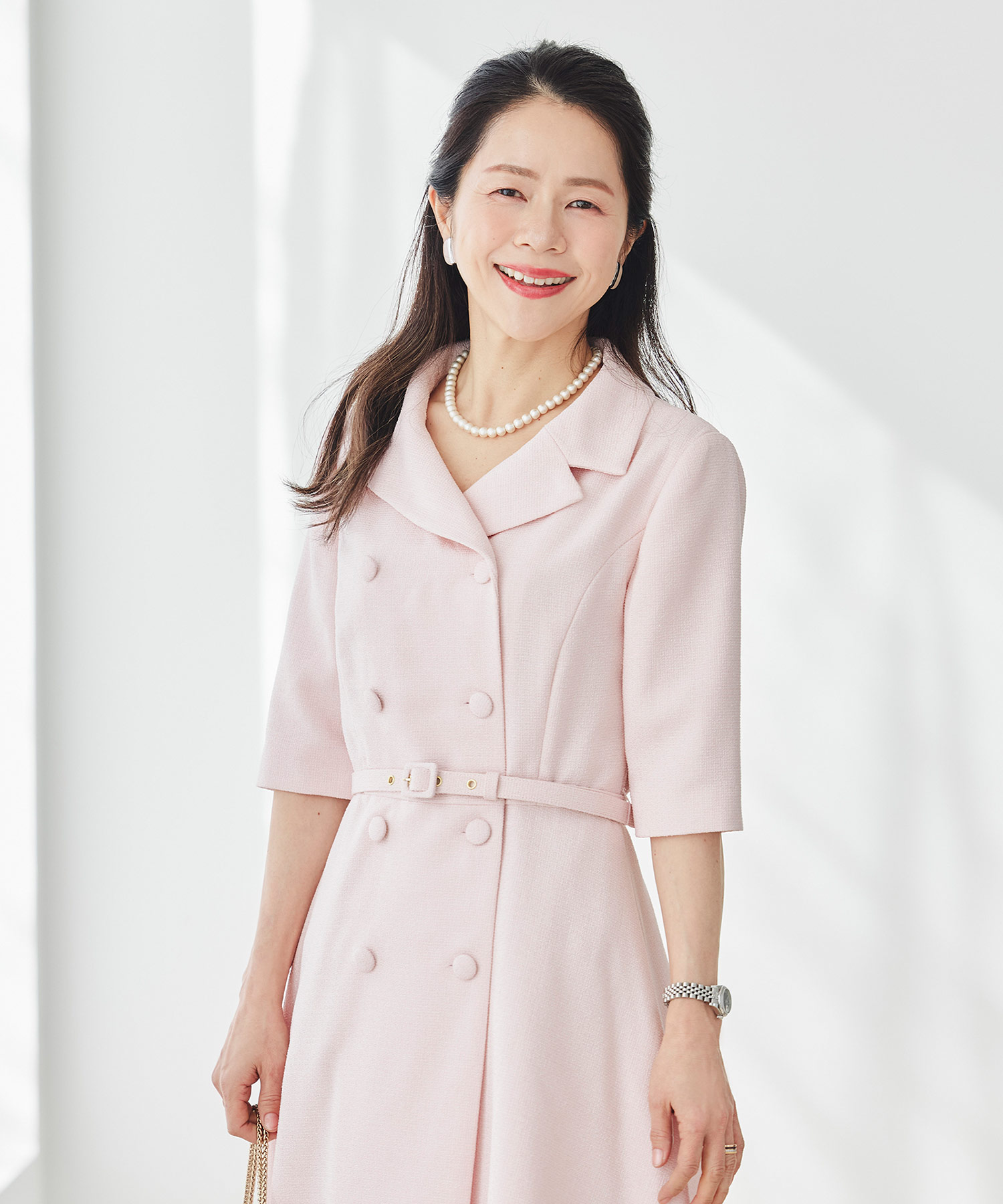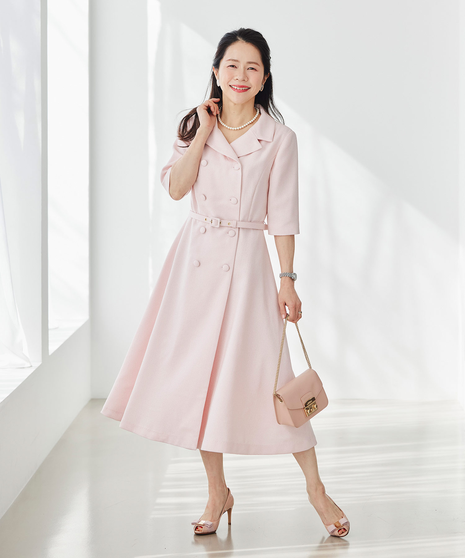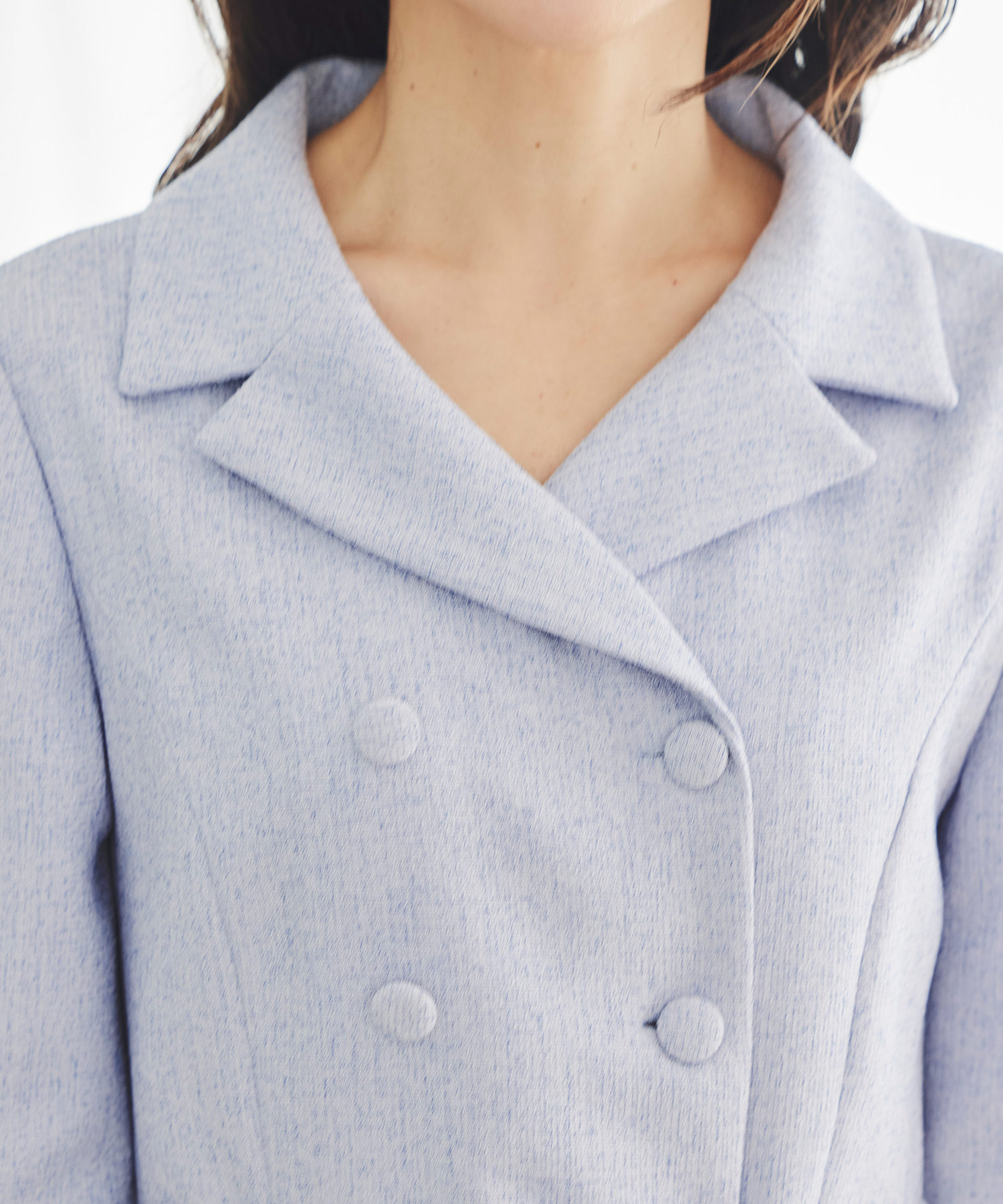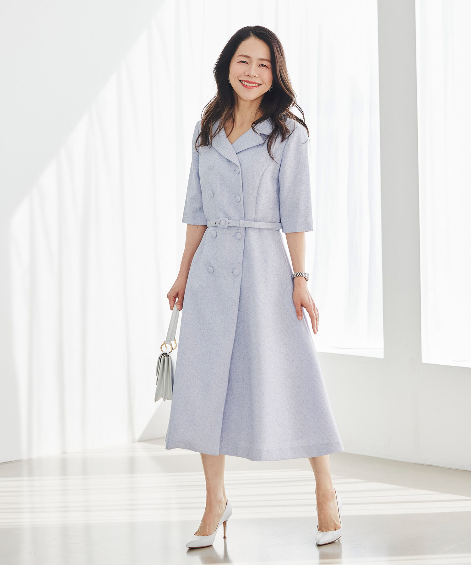 春らしい軽やかなツイードライク素材を使用した、季節のおでかけにぴったりのクラシカルなワンピースです。ダブルボタンとエレガントな襟のデザインが印象的で、一枚で品よく華やかな着こなしが完成。ほどよくきちんと感がありながら、堅く見えすぎないので、大人の女性をチャーミングに見せてくれます。春のお出かけや少し特別な日に取り入れたい、上品さのある一着です。