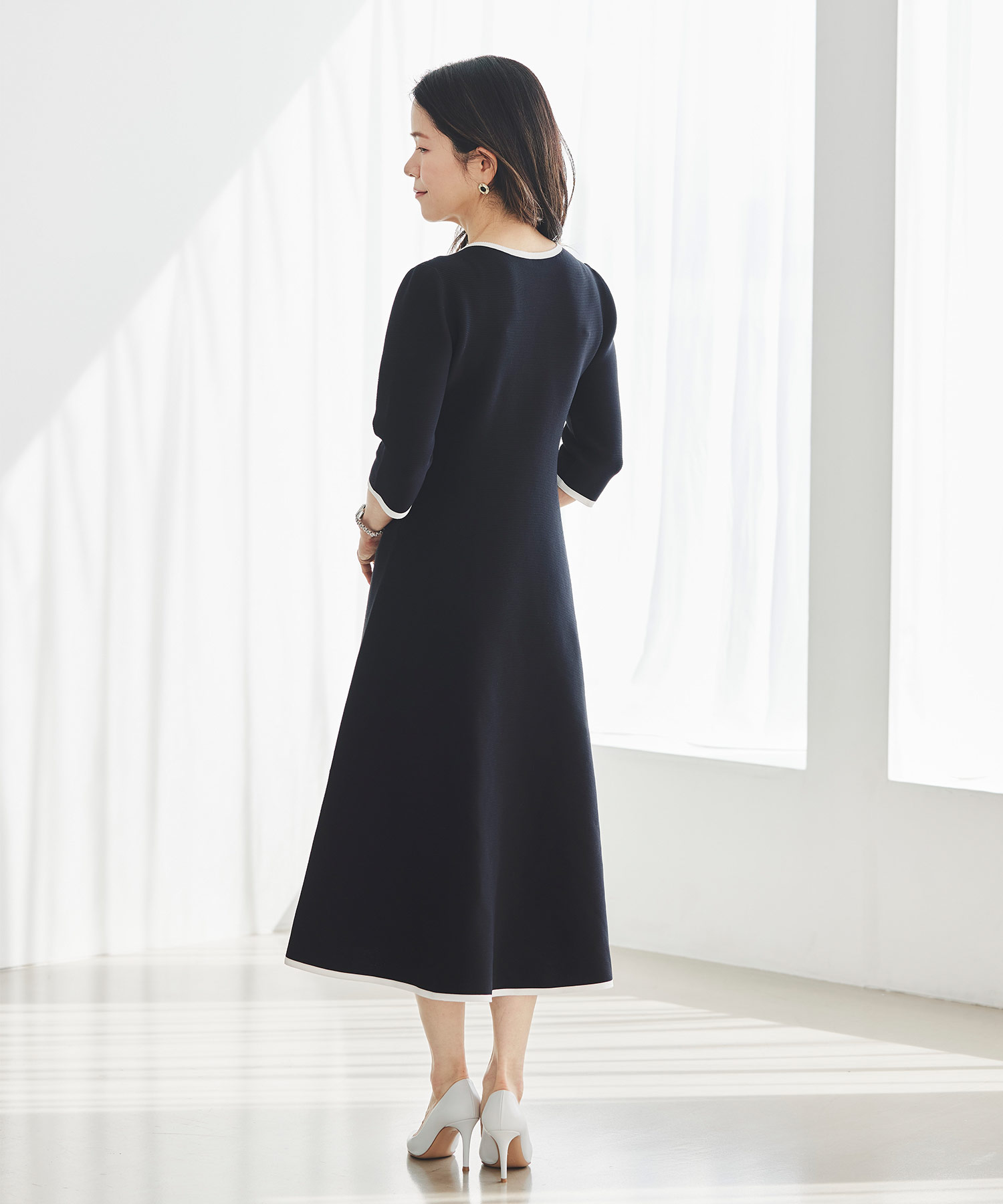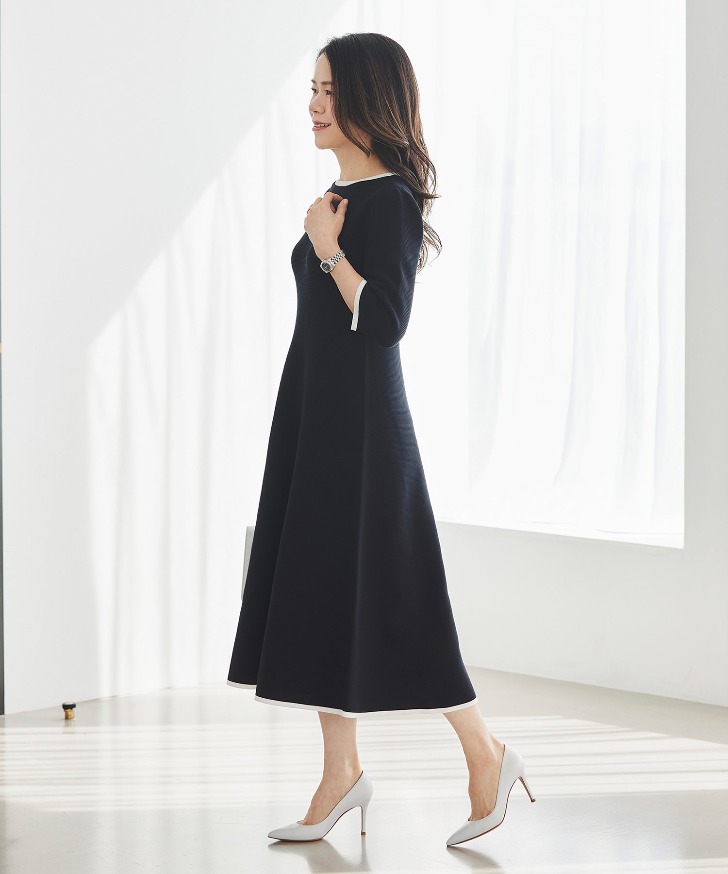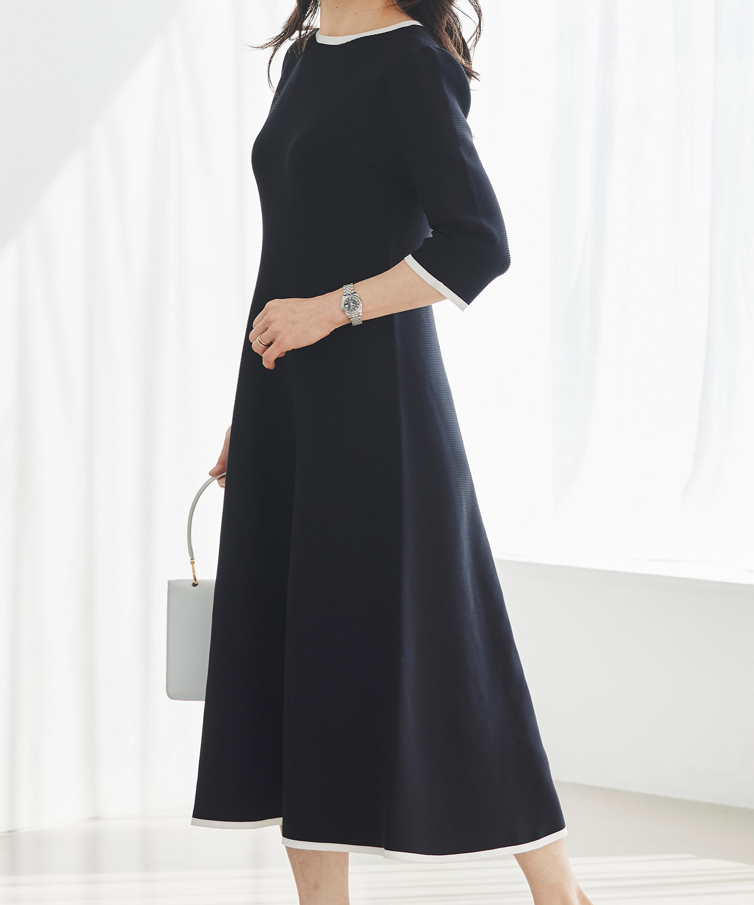 3月下旬は、いよいよ本格的に春らしい装いを楽しみたくなる時期。そんな時季にぴったりなのが、一枚で着映えが叶うニットワンピースです。体のラインを拾いすぎず、ほどよく寄り添うシルエットで、自然とウエストラインが整って見えるのが魅力。ホールガーメントならではのやわらかな着心地で、重たく見えにくく、春先にも心地よく着用いただけます。季節の変わり目に頼れる、上品さと快適さを兼ね備えた一枚です。
