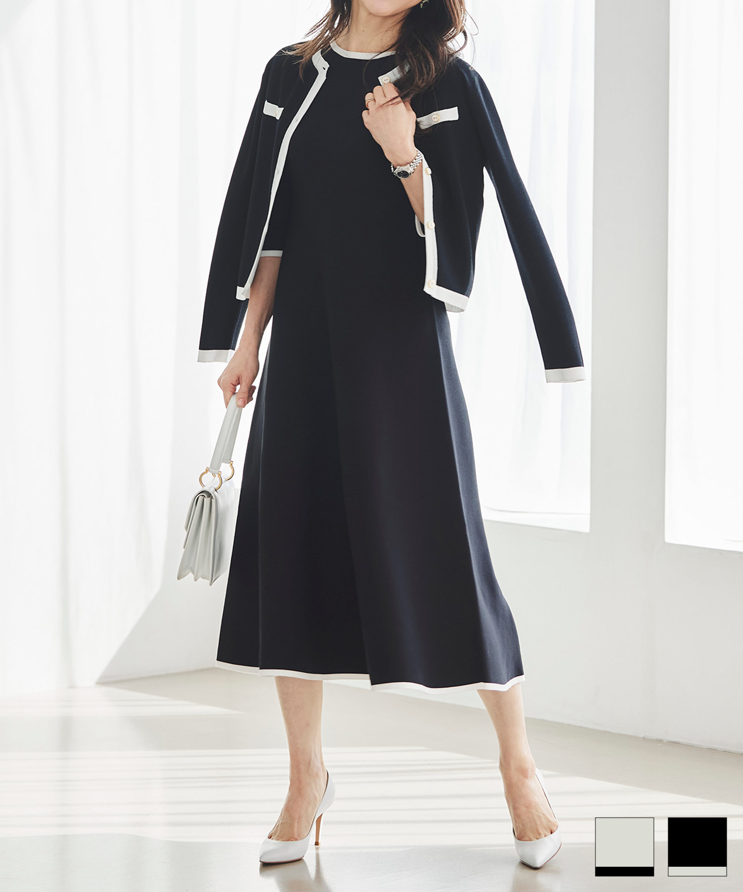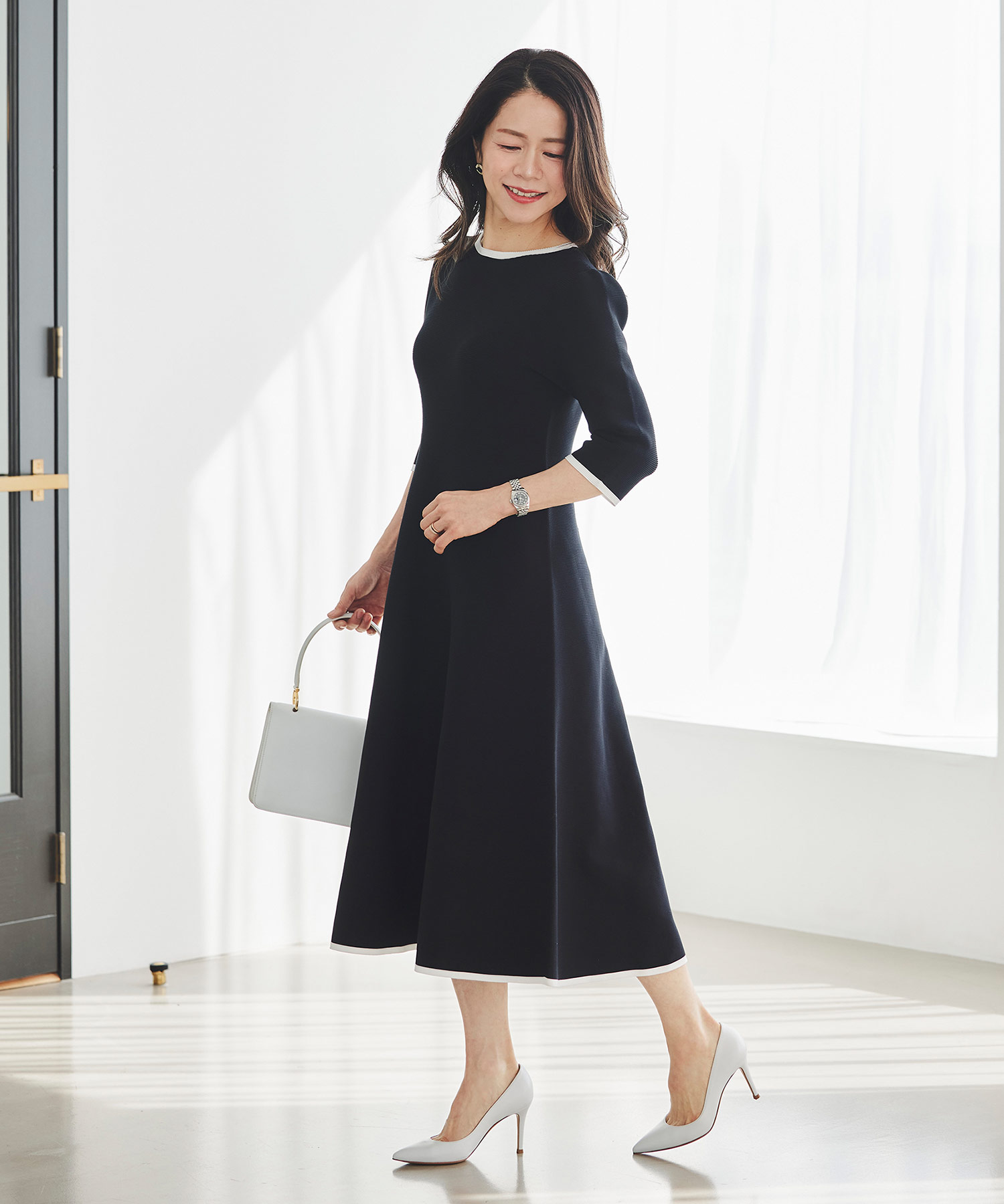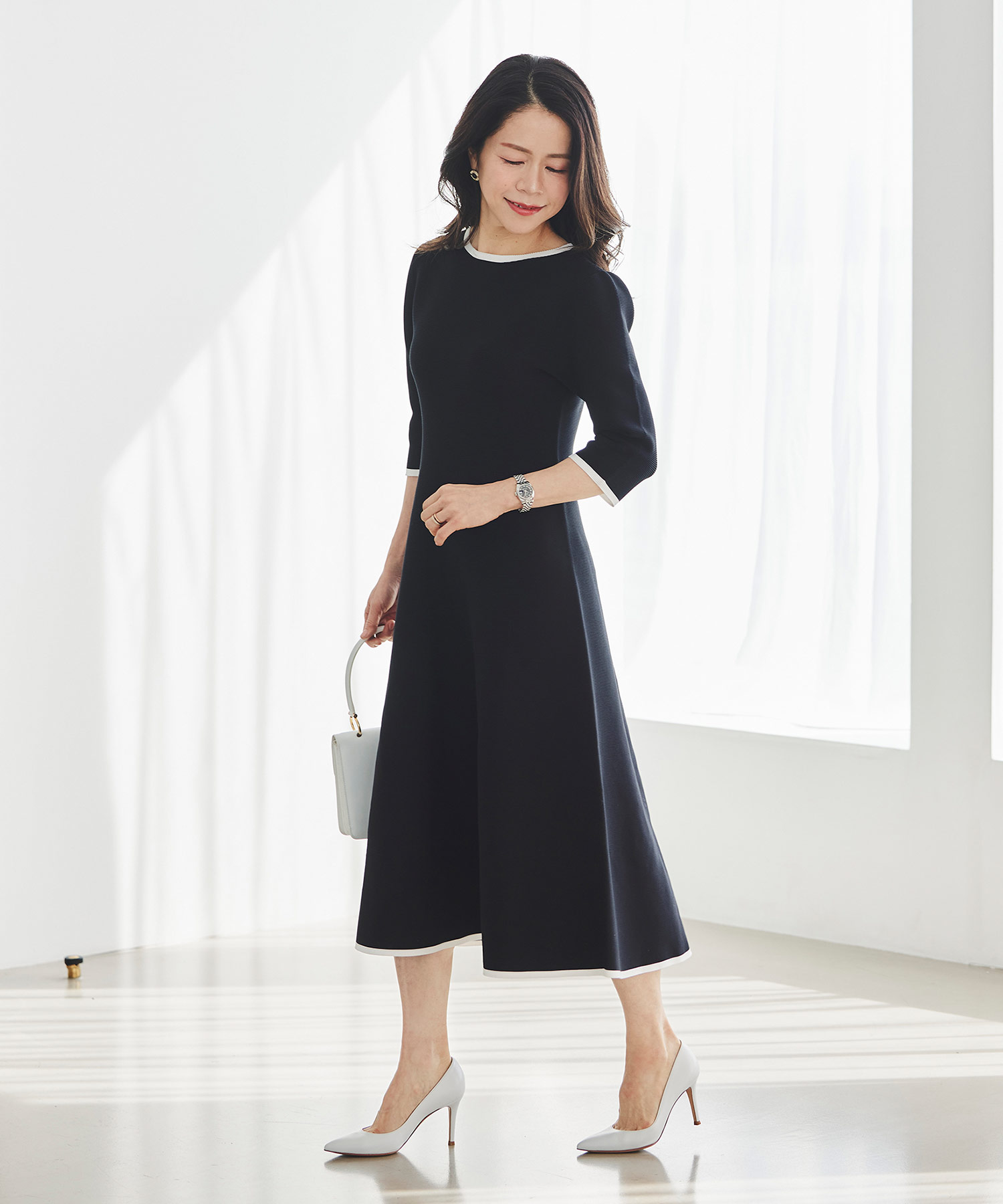 3月下旬は、いよいよ本格的に春らしい装いを楽しみたくなる時期。そんな時季にぴったりなのが、一枚で着映えが叶うニットワンピースです。体のラインを拾いすぎず、ほどよく寄り添うシルエットで、自然とウエストラインが整って見えるのが魅力。ホールガーメントならではのやわらかな着心地で、重たく見えにくく、春先にも心地よく着用いただけます。季節の変わり目に頼れる、上品さと快適さを兼ね備えた一枚です。