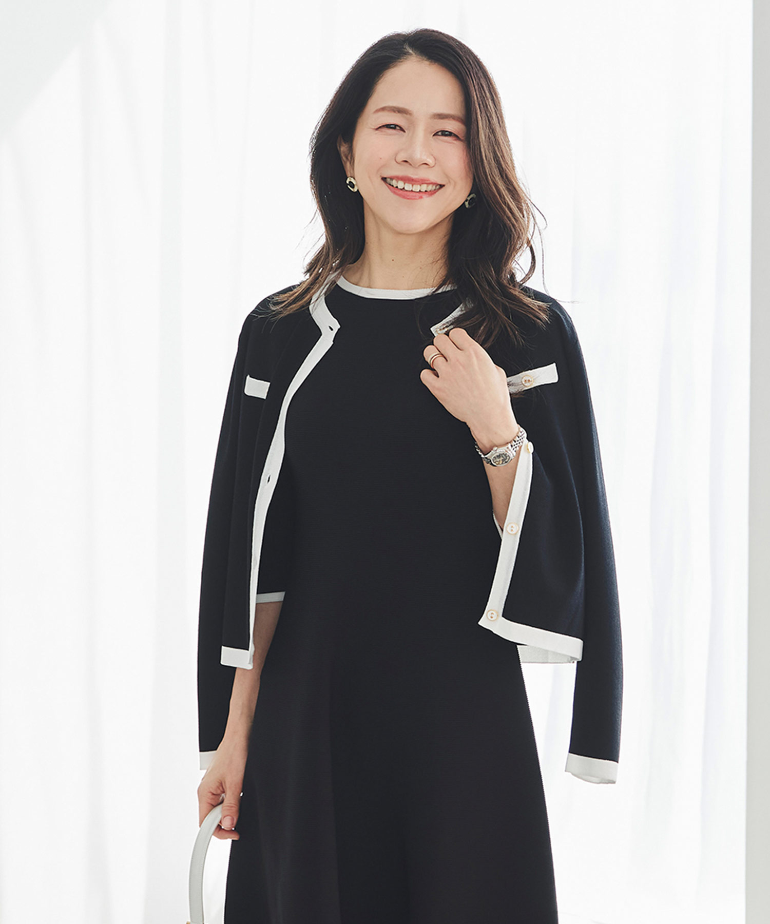フォーマルにもカジュアルにも使える着回し力の高さが魅力で、春のお出かけやお仕事シーンにぴったりです。編地や印象が異なるアソートニットは全6色展開。ツイード調の編み模様が映えるワンカラーやカラーMIX、ネイビーボーダーはすっきりとした印象に仕上がり、好みに合わせて選べます。スポンディッシュな素材感のニットは程よい伸縮性があり、しわになりにくく快適な着心地。フロントとポケットにあしらったゴールドの飾りボタンが、軽やかさの中にも上品なクラス感を添えます。ジャケット感覚で羽織れて、春本番から初夏まで長く使える、3月下旬に持っておきたい一着です。
