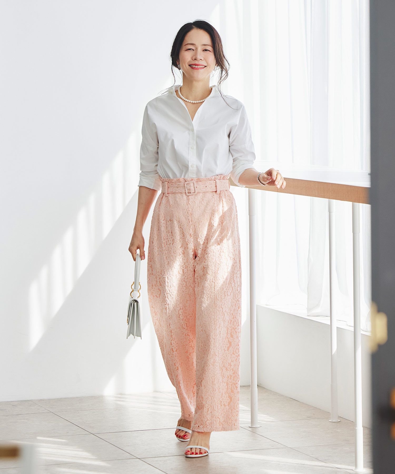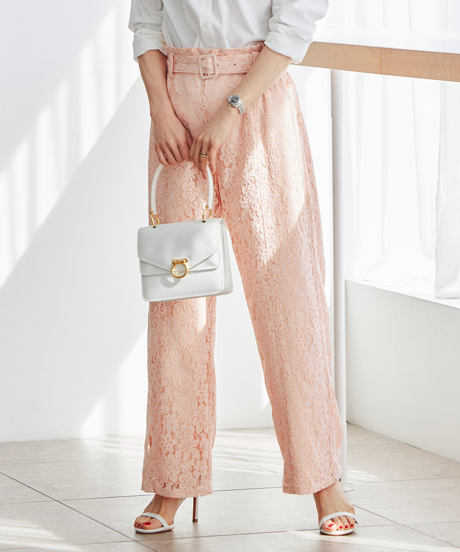 まだ冷えが残る3月中旬は、ニットを残しつつ、ボトムスを軽やかな素材に変えるだけで、装いがぐっと春らしく整います。総レースのワイドパンツなら、季節感を取り入れながら、上品で華やかな印象に。ほどよい太さのシルエットで甘くなりすぎず、シンプルなニット合わせでも着映えするのが魅力です。まだ寒さが気になる時期の春コーデに、軽やかさと女性らしさを添えてくれる一枚です。