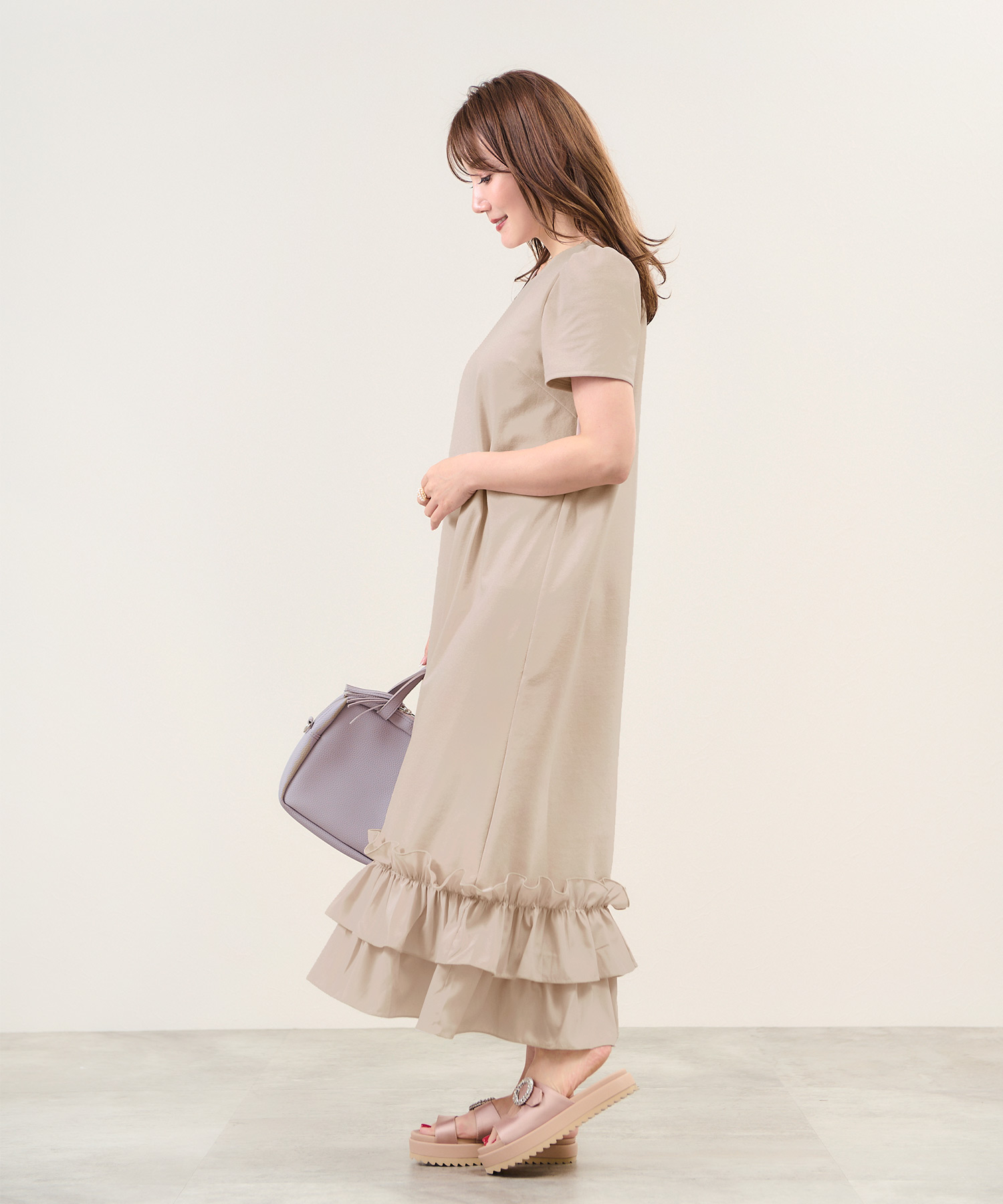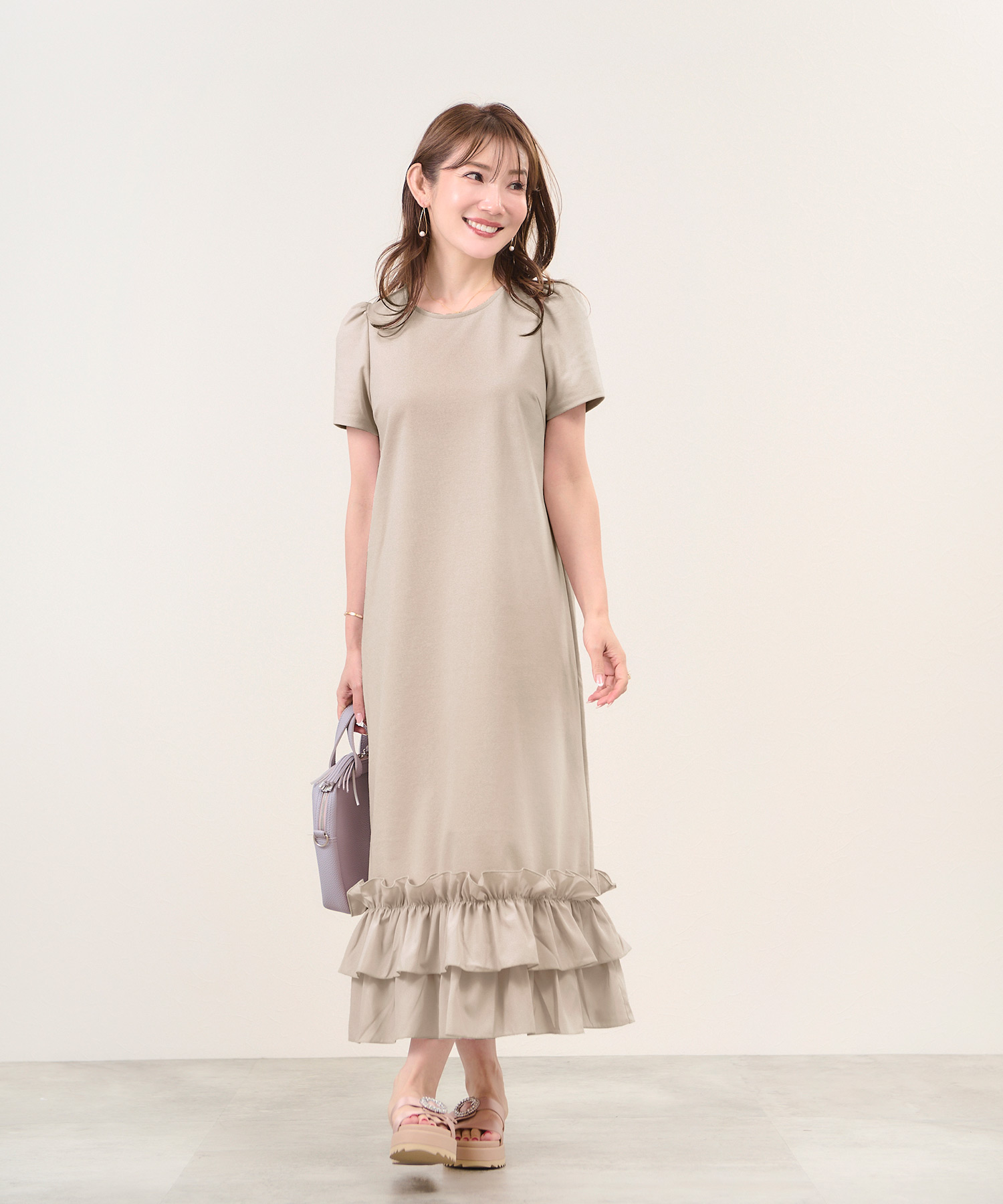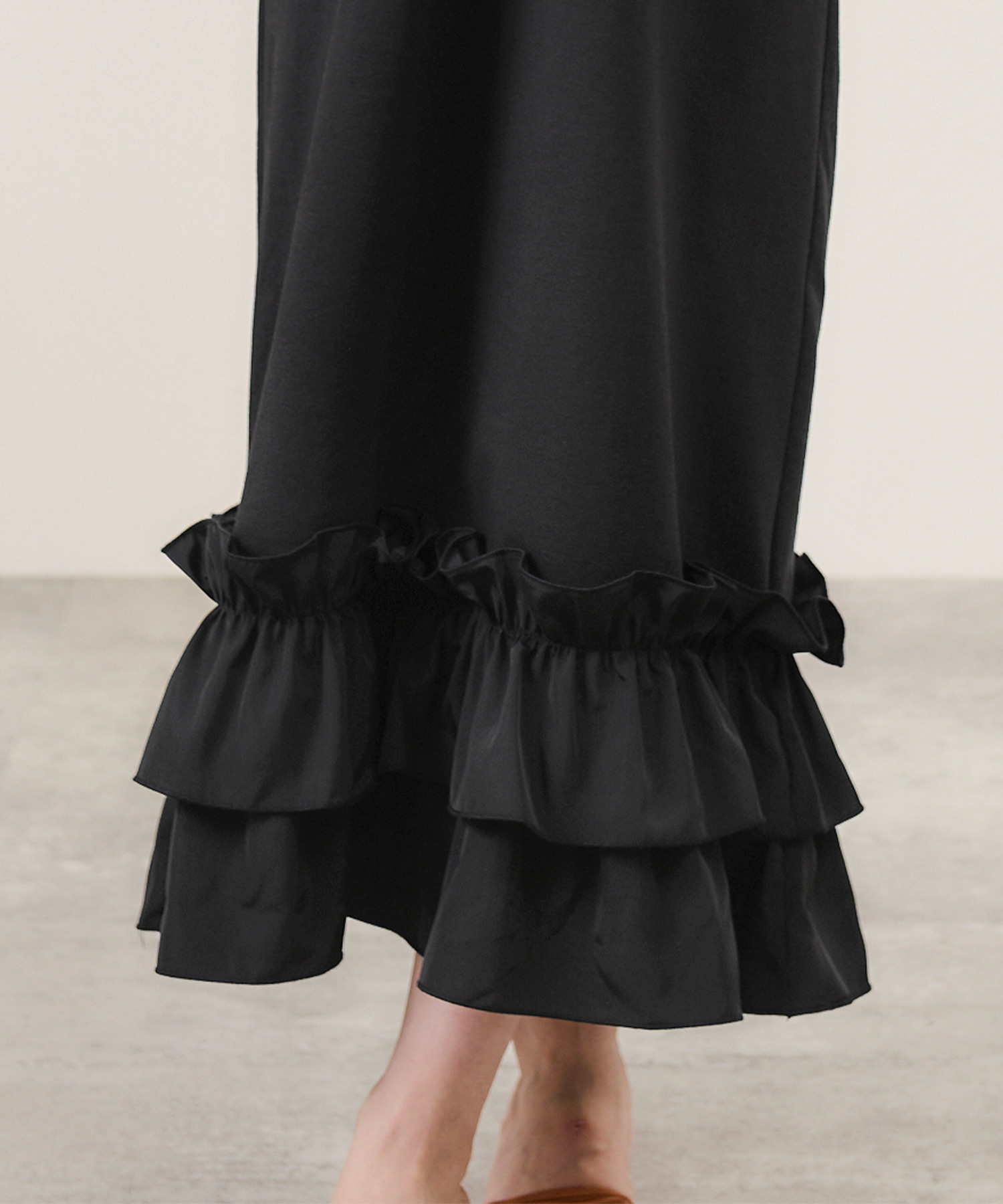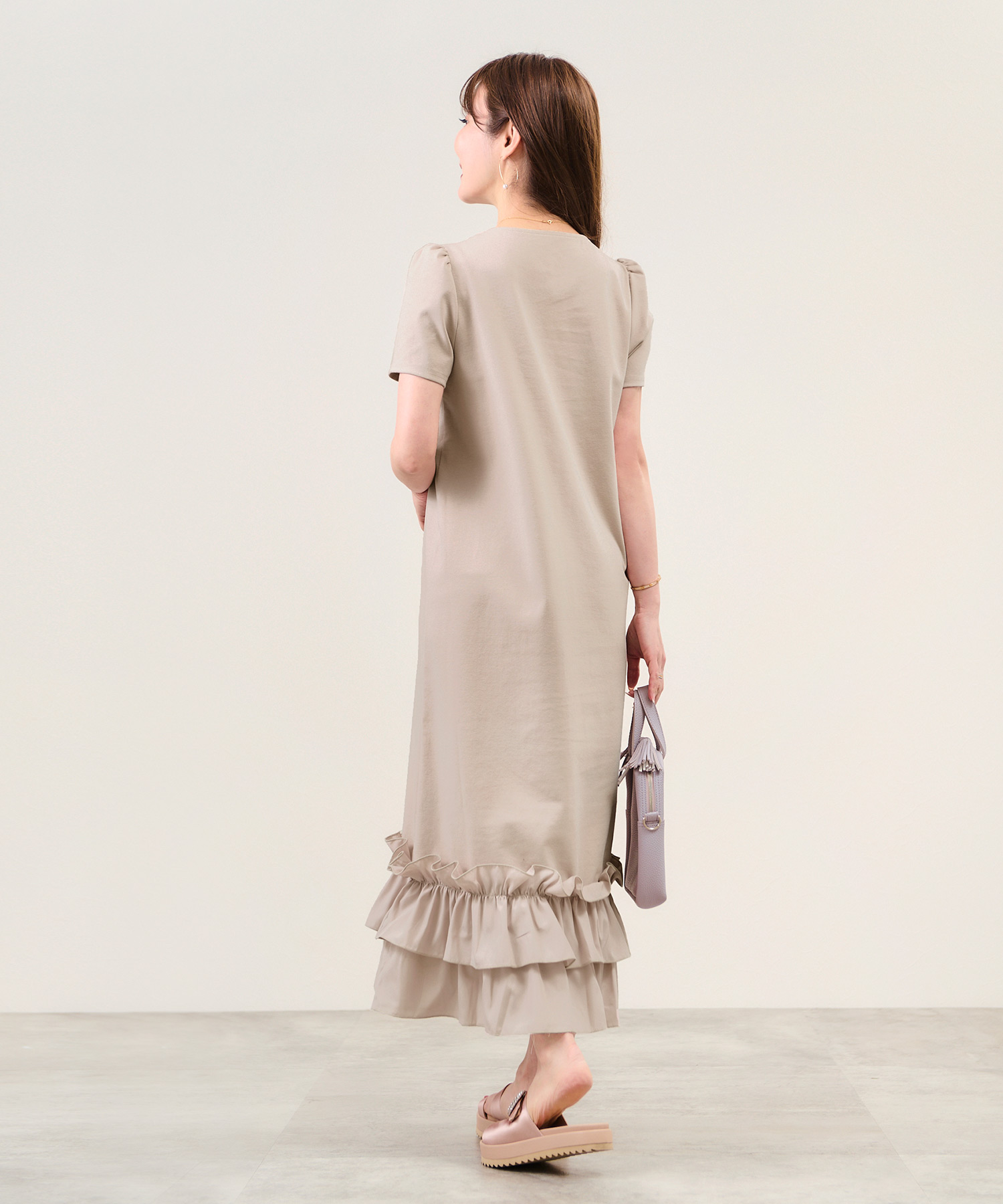 リラックス感と上品さを兼ね備えたロング丈のワンピース。全体は柔らかく伸縮性のあるカットソー素材で快適な着心地を実現し、裾には艶やかなタフタ素材のフリルを施してメリハリをプラスしました。すとんとまっすぐに落ちるシルエットがボディラインを拾わず、きれいな形を保ちます。落ち着いたカラー展開で、大人の女性にもぴったり。ラウンドネックと袖山ギャザーが可愛らしさを加え、シンプルなデザインでありながらも存在感のある一枚です。デイリーにも通勤にも活躍すること間違いなし。