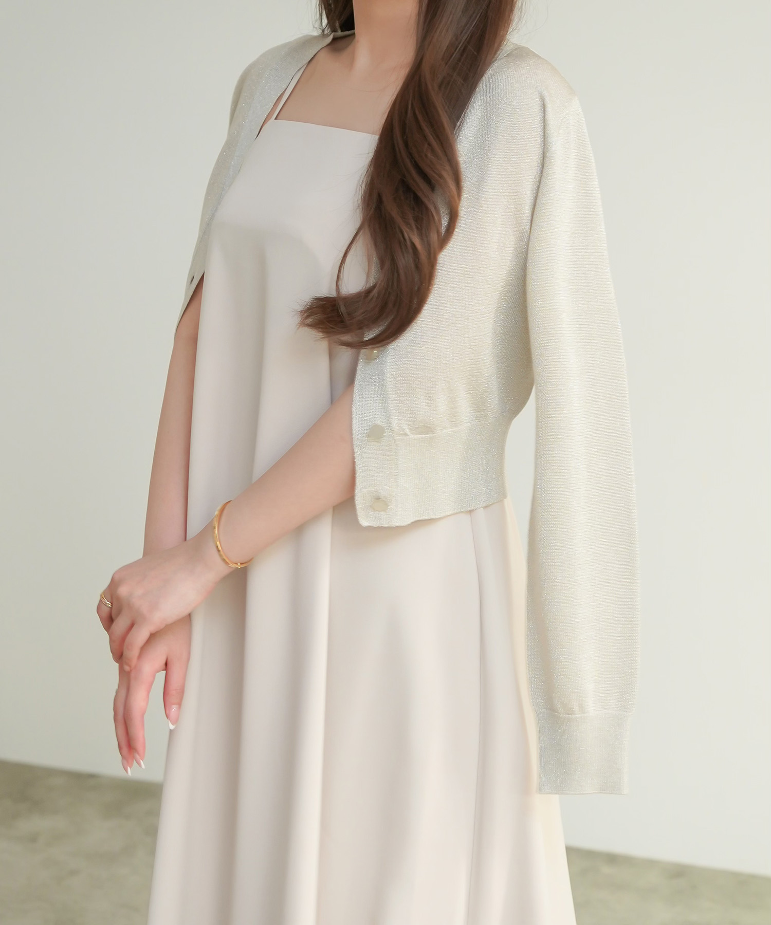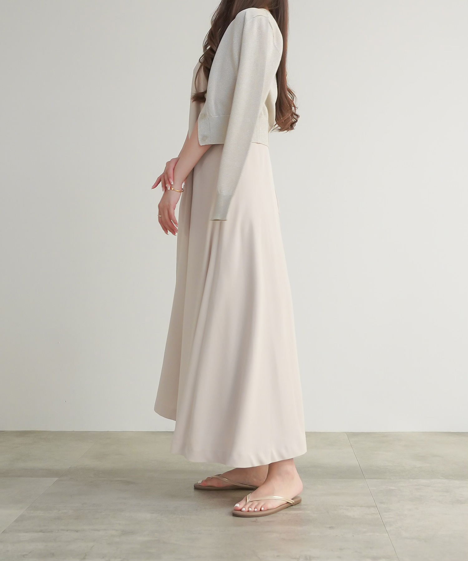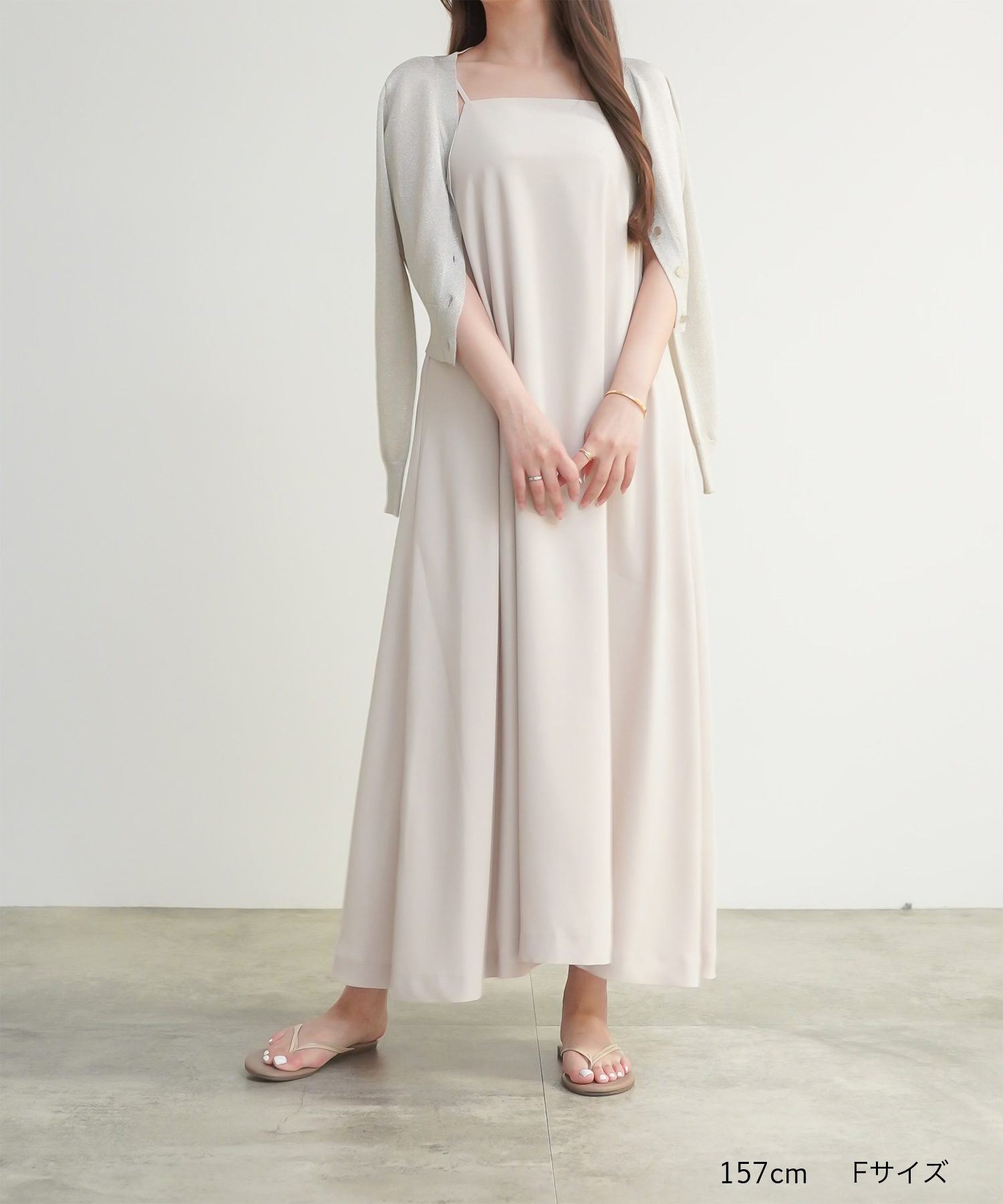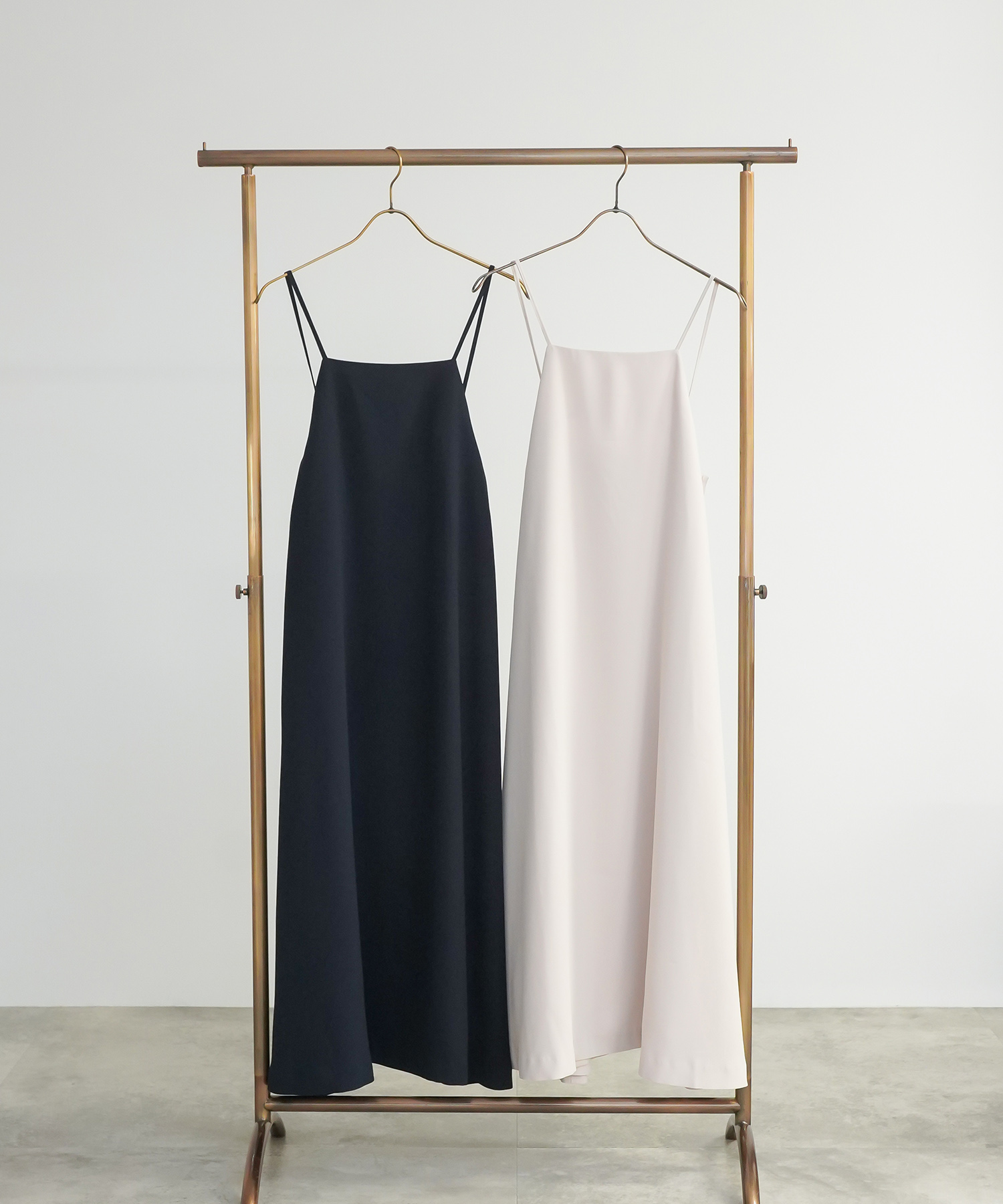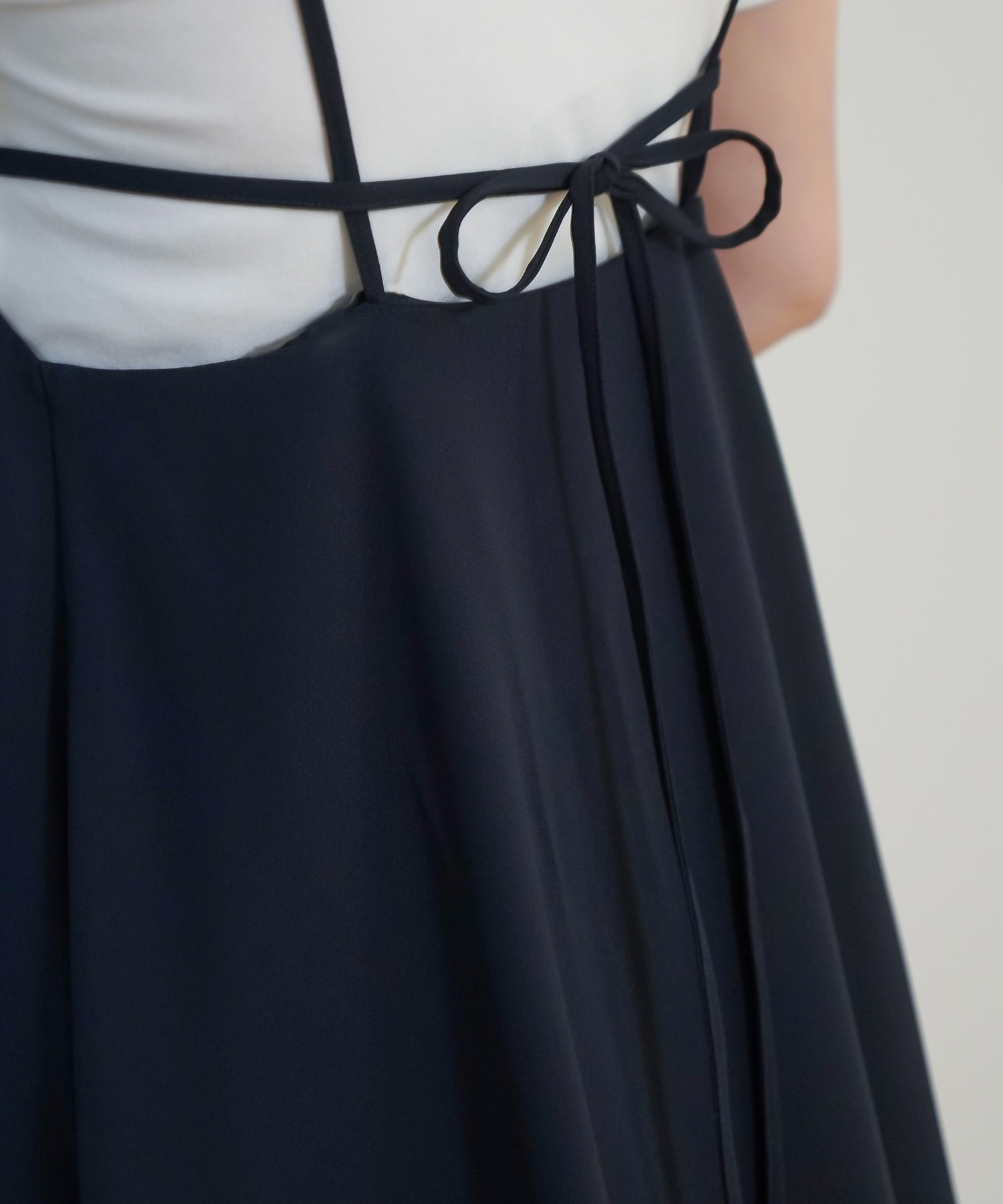 すとんとラフに着るだけで形が決まるキャミワンピース。背中がウエスト上まで大胆に開き、華奢な細ヒモ使いが女性らしさを強調します。厚手でたっぷりと用尺を使った生地が動くたびにドラマティックに揺れ、優雅な印象。生地表面は微光沢があるのでぺったりとして見えず奥行きを感じさせます。オフィスではジャケットを羽織ったスタイルやインナーにシアートップスやノースリーブとレイヤードしたスタイルがおすすめです。休日は1枚でシンプルに、もしくはバンドゥー型のランジェリーやヌーブラと合わせれてパーティースタイルとして着用していただくのもおすすめです。