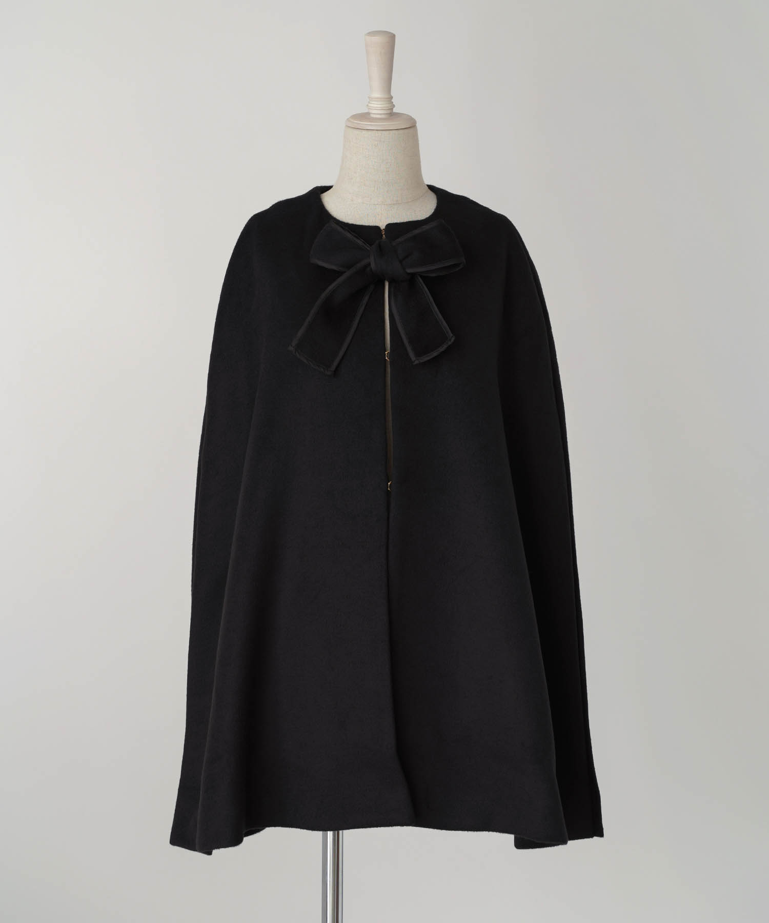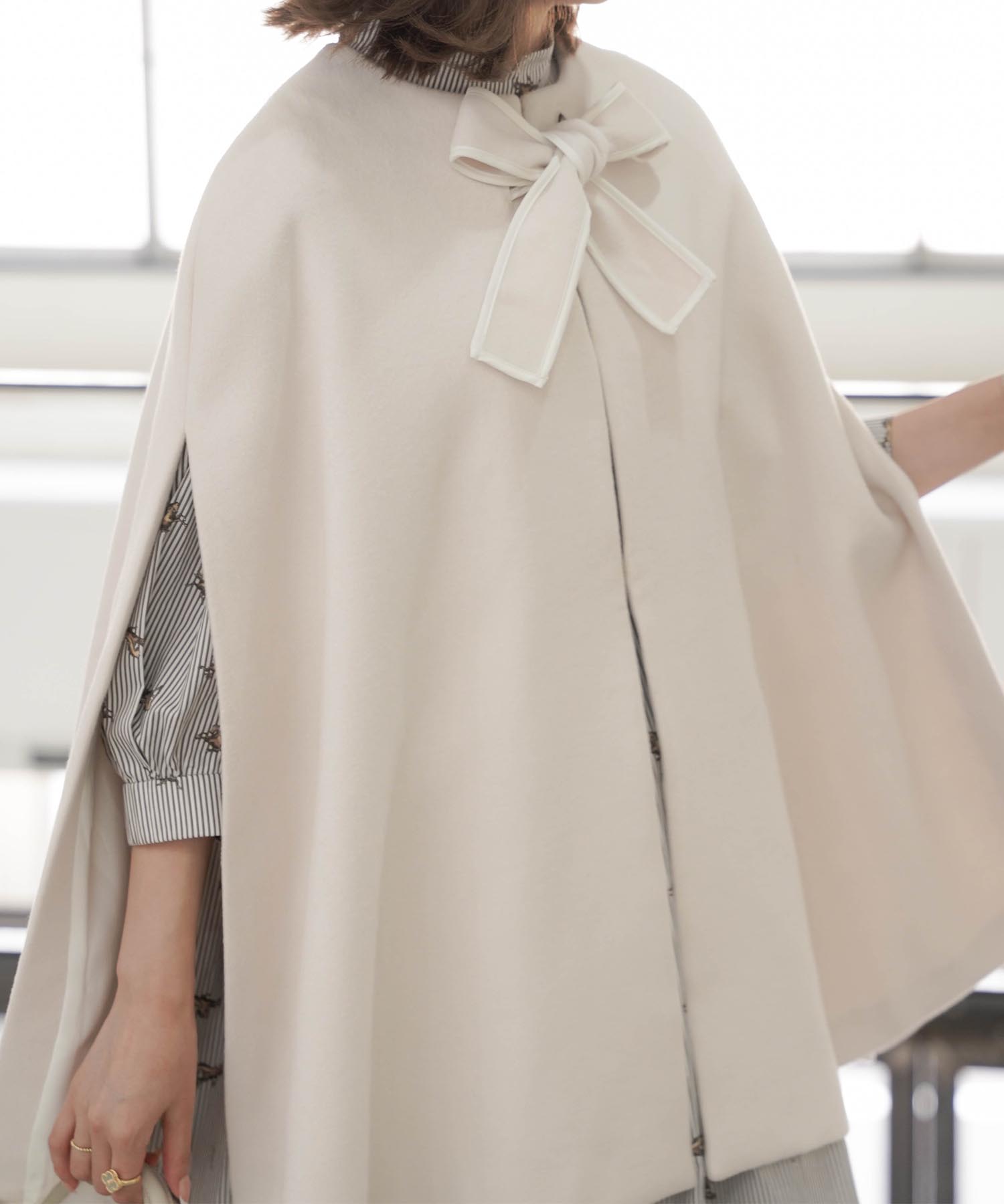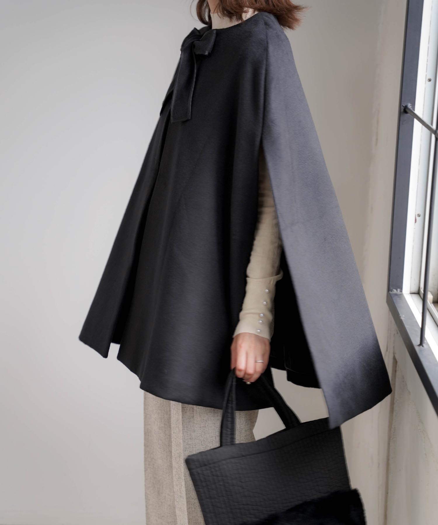 大人女子にちょうどいい控えめな大きさのリボンがポイントのケープコート。バサッと羽織るだけでクラシカルで品のよい着こなしが叶います。首元はノーカラーでタートルネックをインナーに合わせて襟を見せた着こなしもおすすめです。