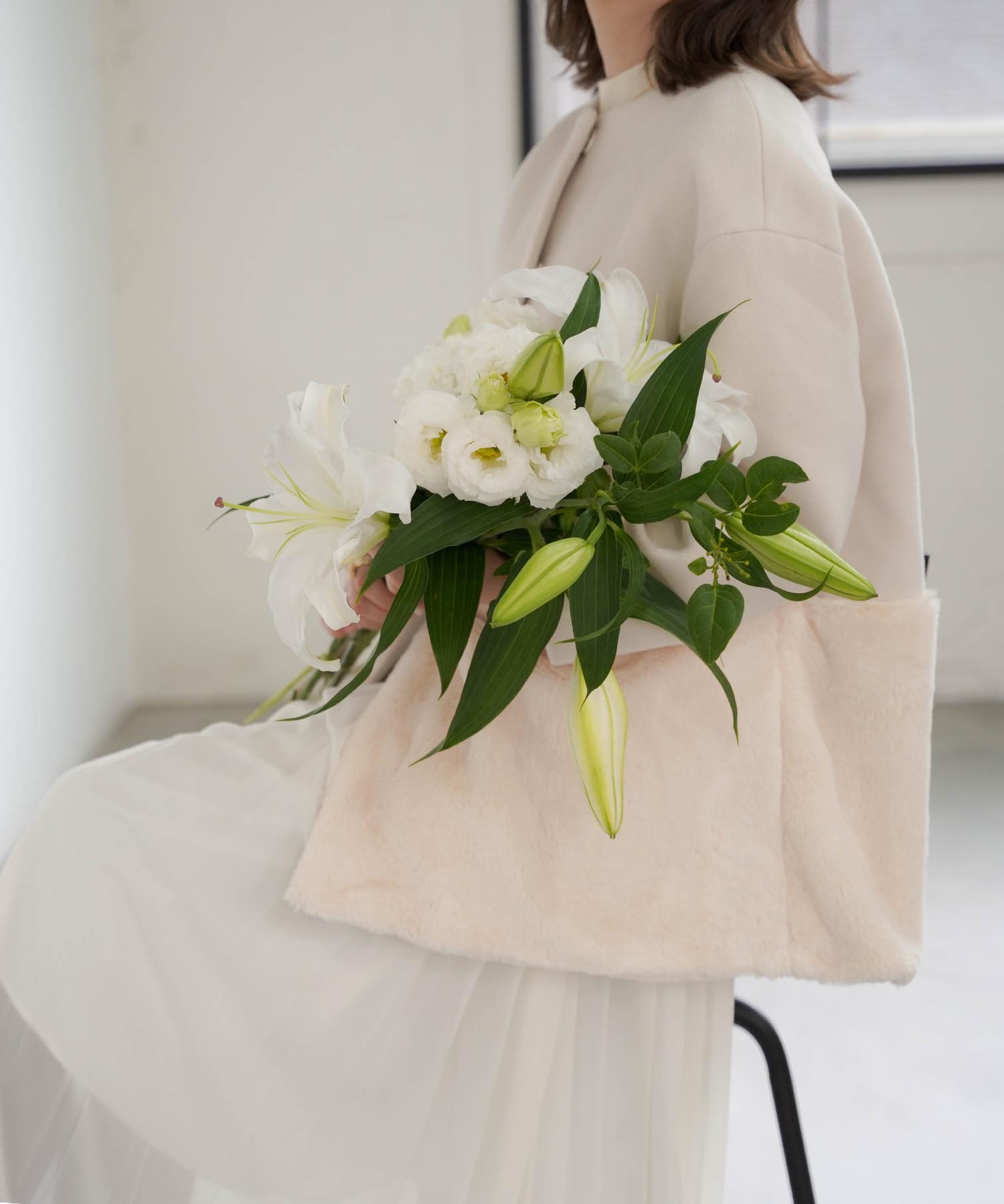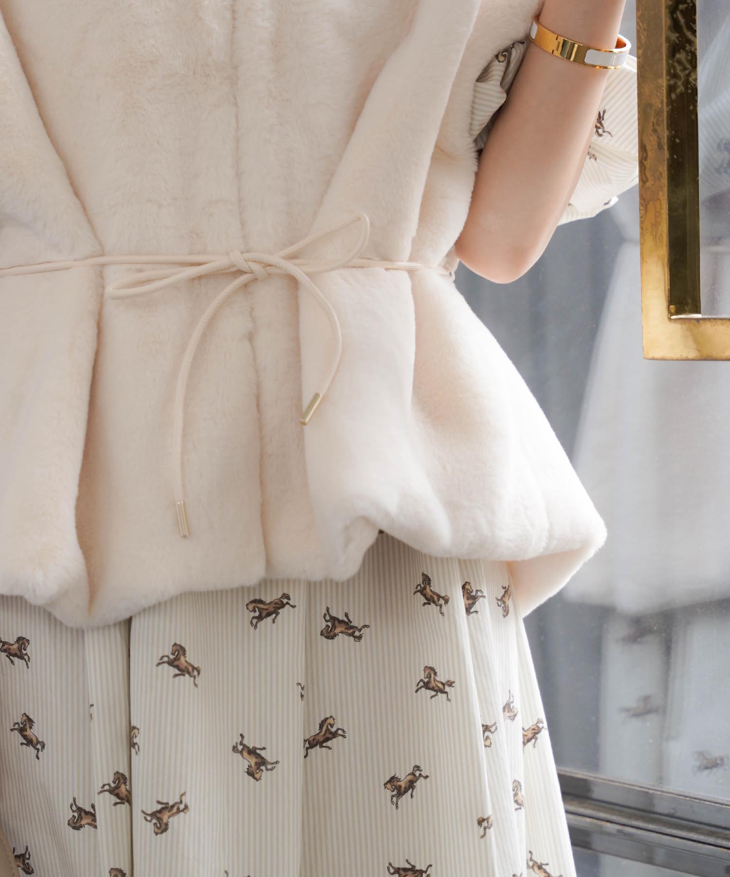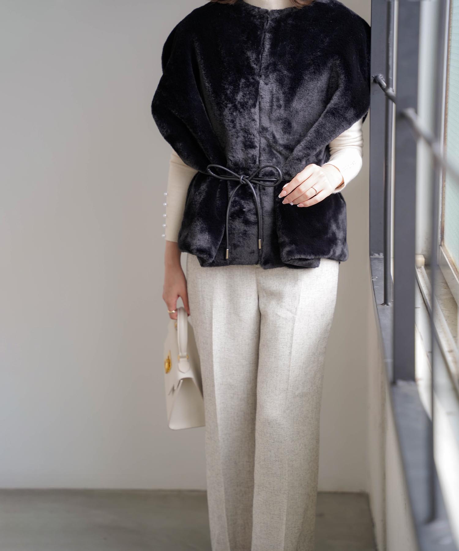 まるでリアルファーのようにふっくら感のあるエコファージレが登場。いつものスタイリングにプラスするだけで着こなしをエレガントに即アップデートしてくれます。附属のフェイクレザー製のベルトを使用すればスタイリングの幅がさらに拡がります。