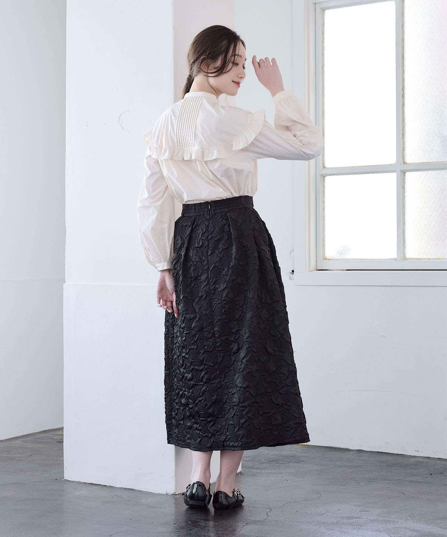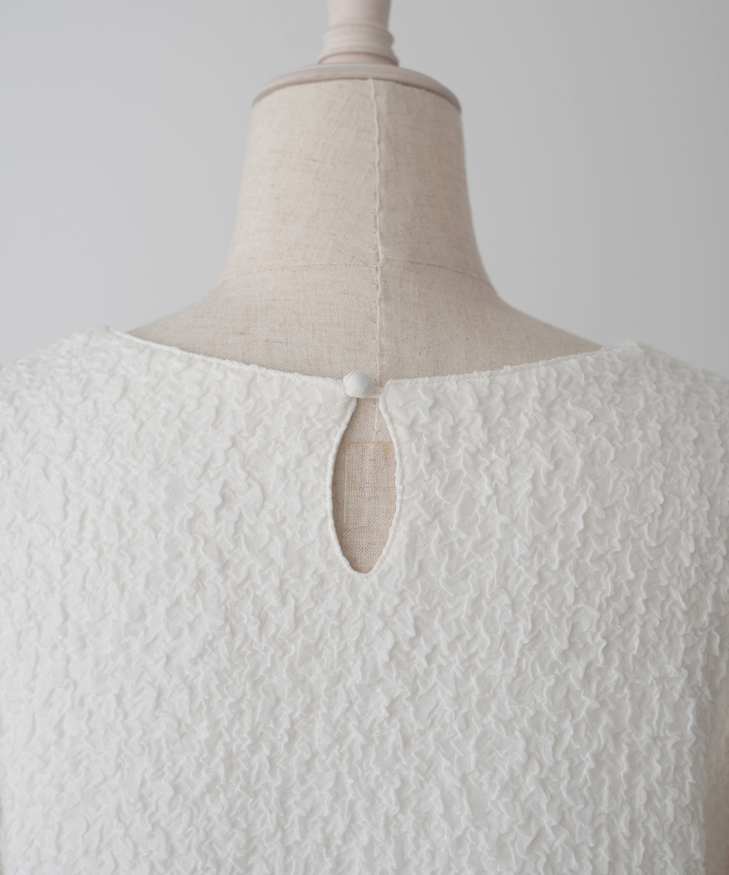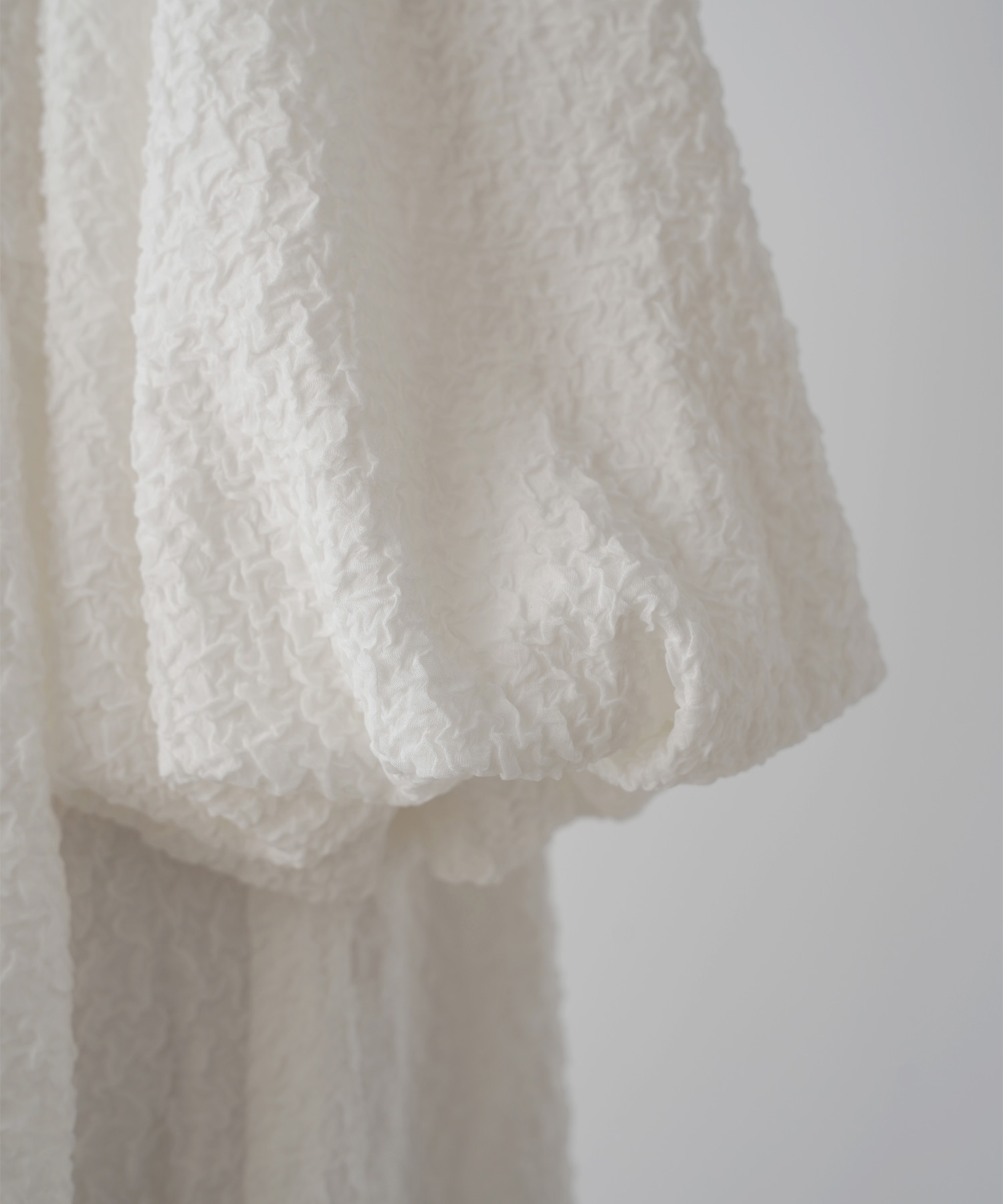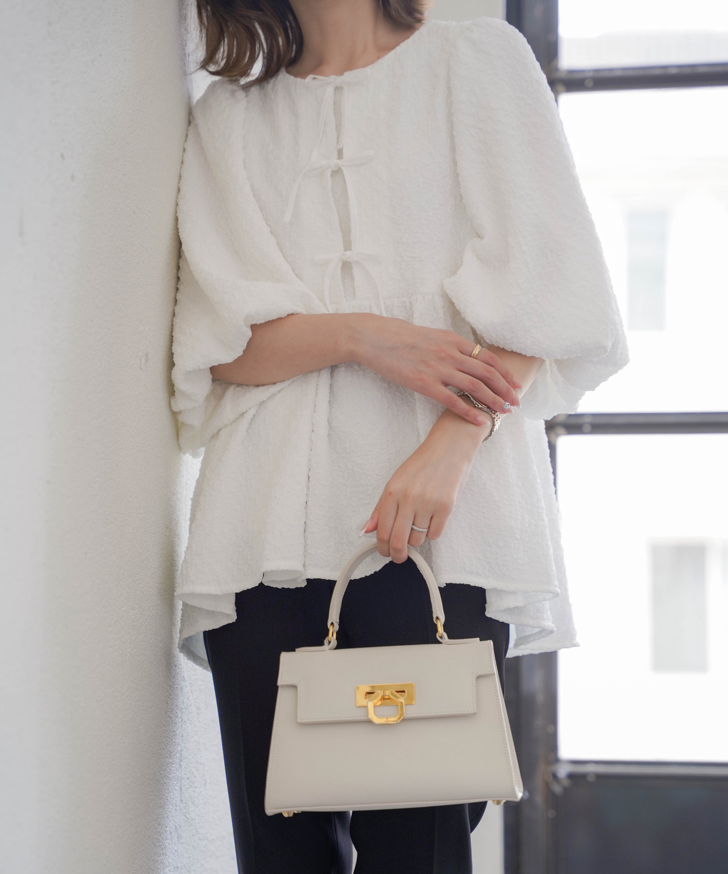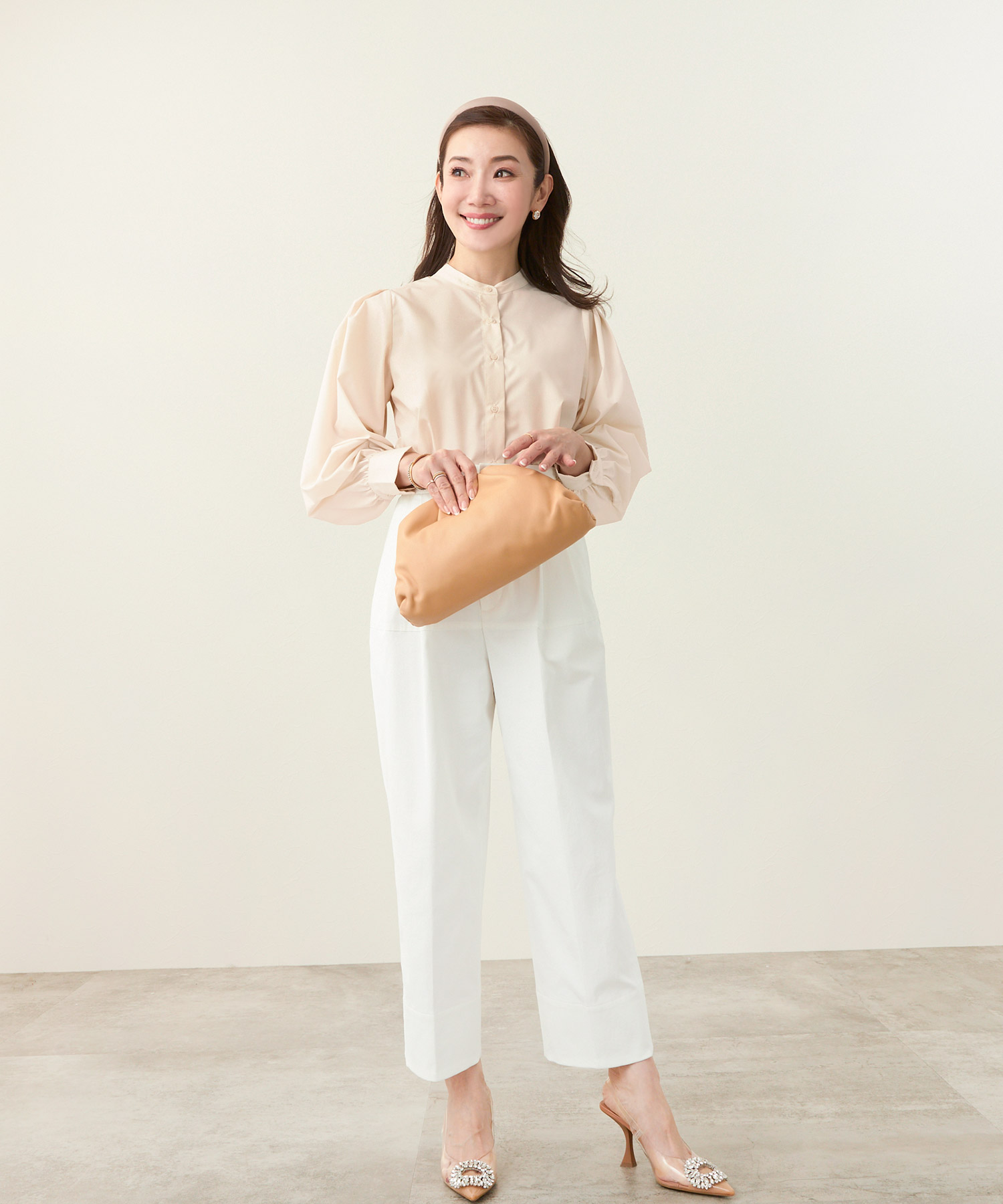 シンプルながら存在感のある、表面に凹凸のある素材を使用したブラウスは通勤コーデにぴったり。また、チュニック丈やバルーンスリーブで大人女子の体型のお悩みも解消してくれます。